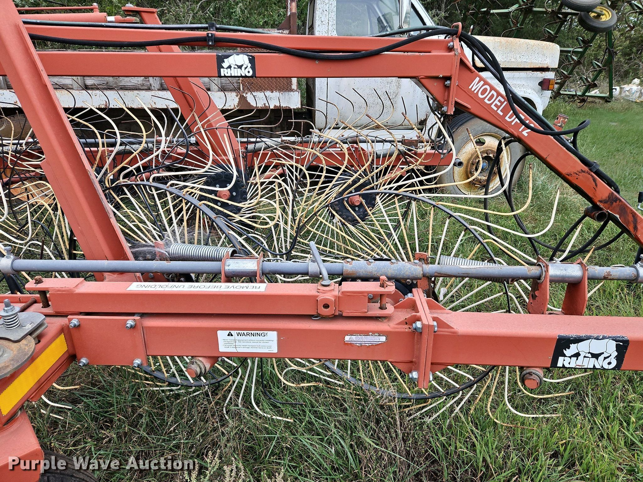 Purple Wave is selling a used Hay Rake in Kansas. This item is a Rhino DF-12 hay rake with the following: Serial: 200113