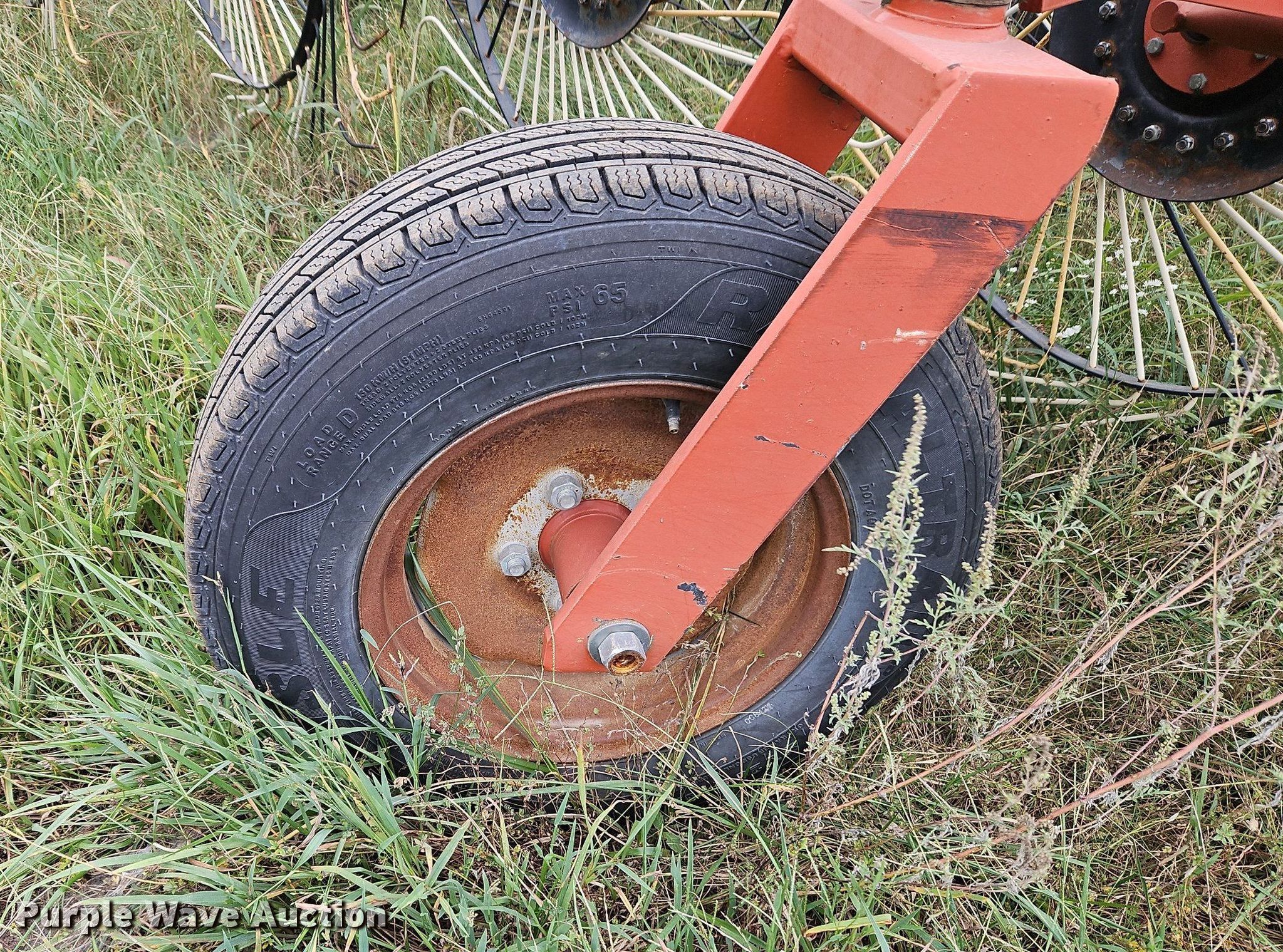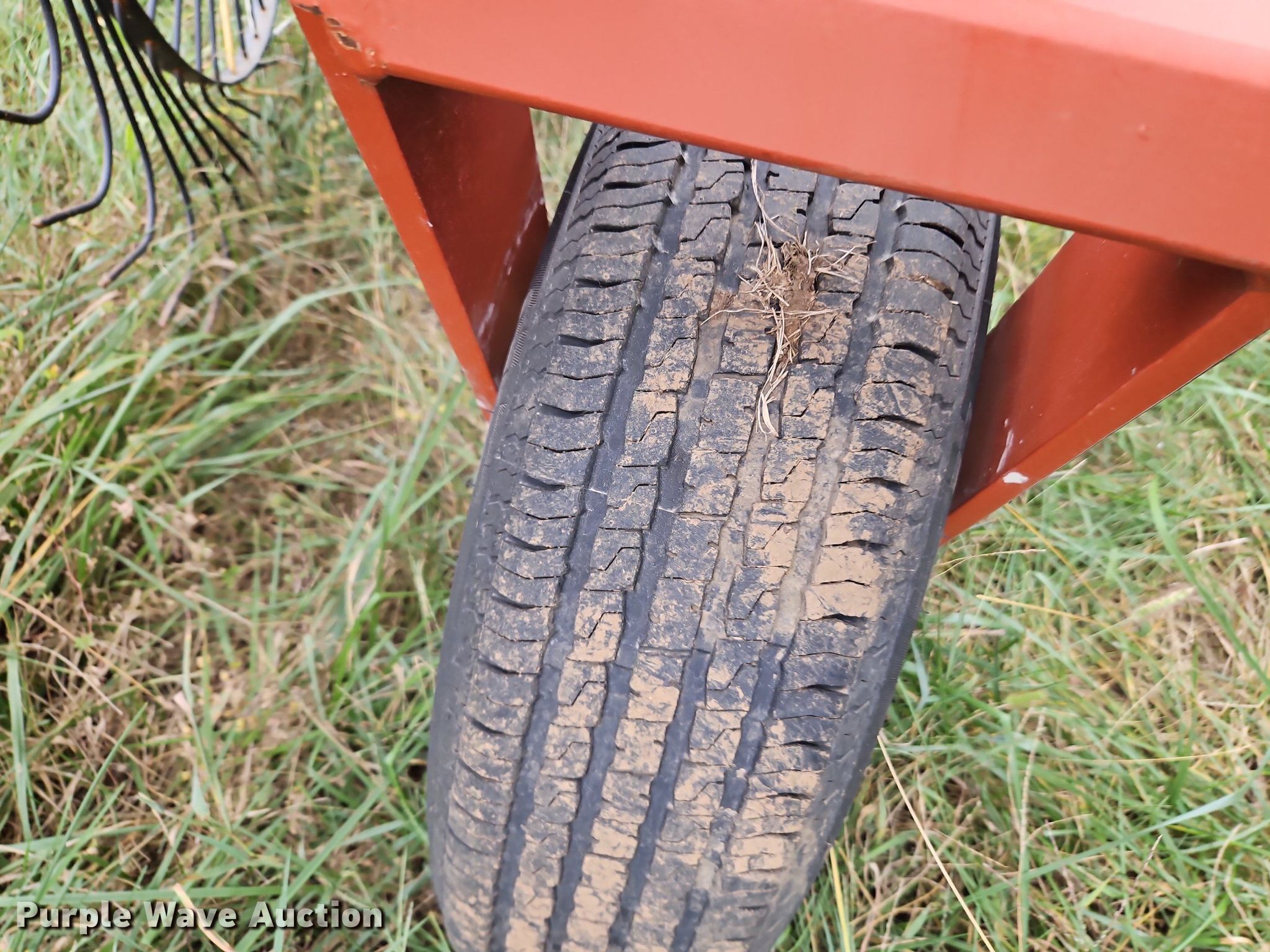 Rhino DF-12 hay rake. Serial: 200113. Features Width: 12', Wheels: 12 Diameter: 54", Hydraulic fold, Hydraulic driven. Tires Size: ST205/75R15. Frankie Noel Construction. 39780 New Lancaster Road. LaCygne, KS 66040