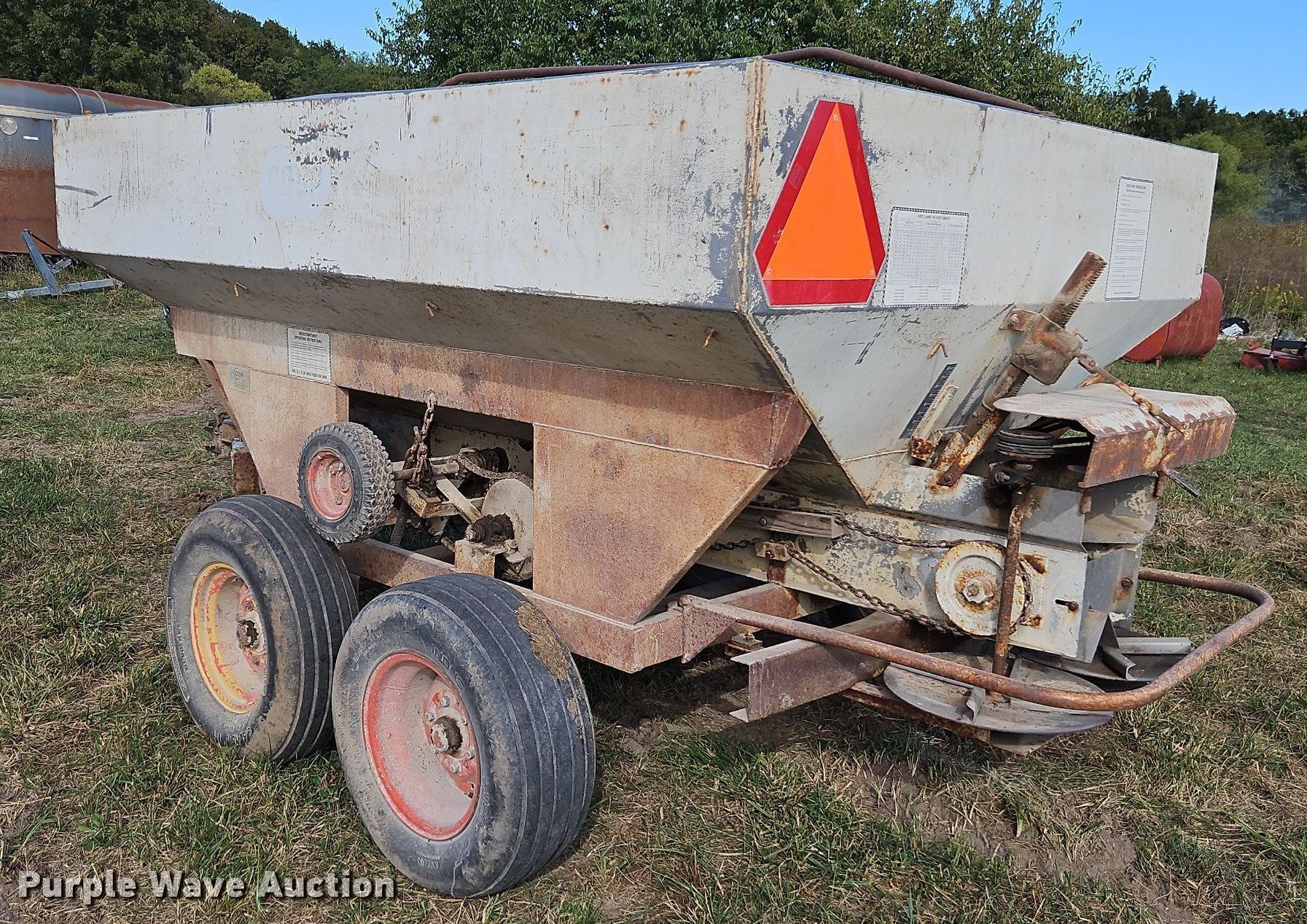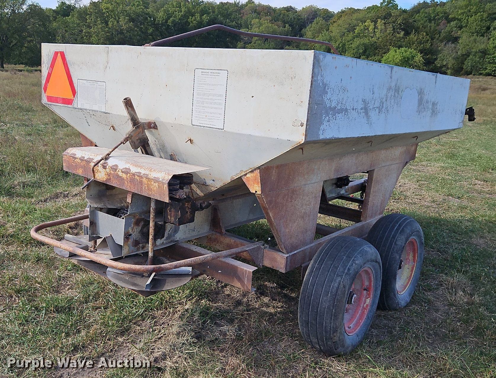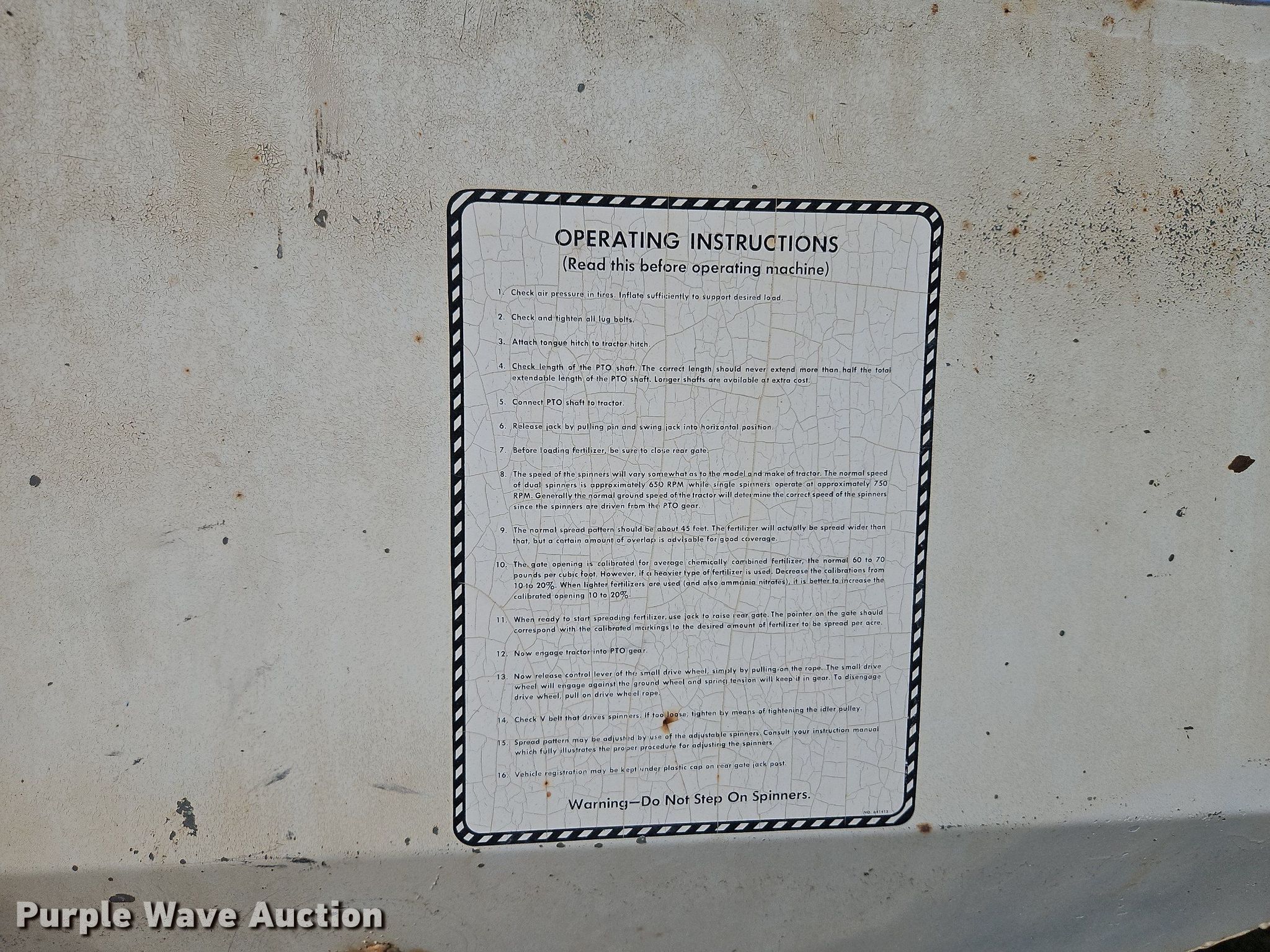 Purple Wave is selling a used Applicator Pull Type in Kansas. This item is a Co Op 1974 spreader with the following: PTO: 540, Dry fertilizer spreader, Tons capacity: 4, Stainless steel, Dual spinners, Ground driven, Conveyor belt, Width: 7",