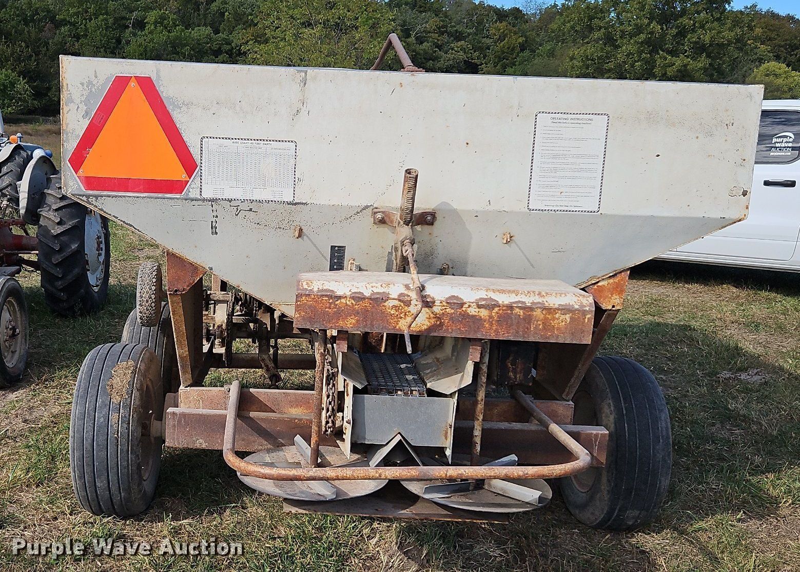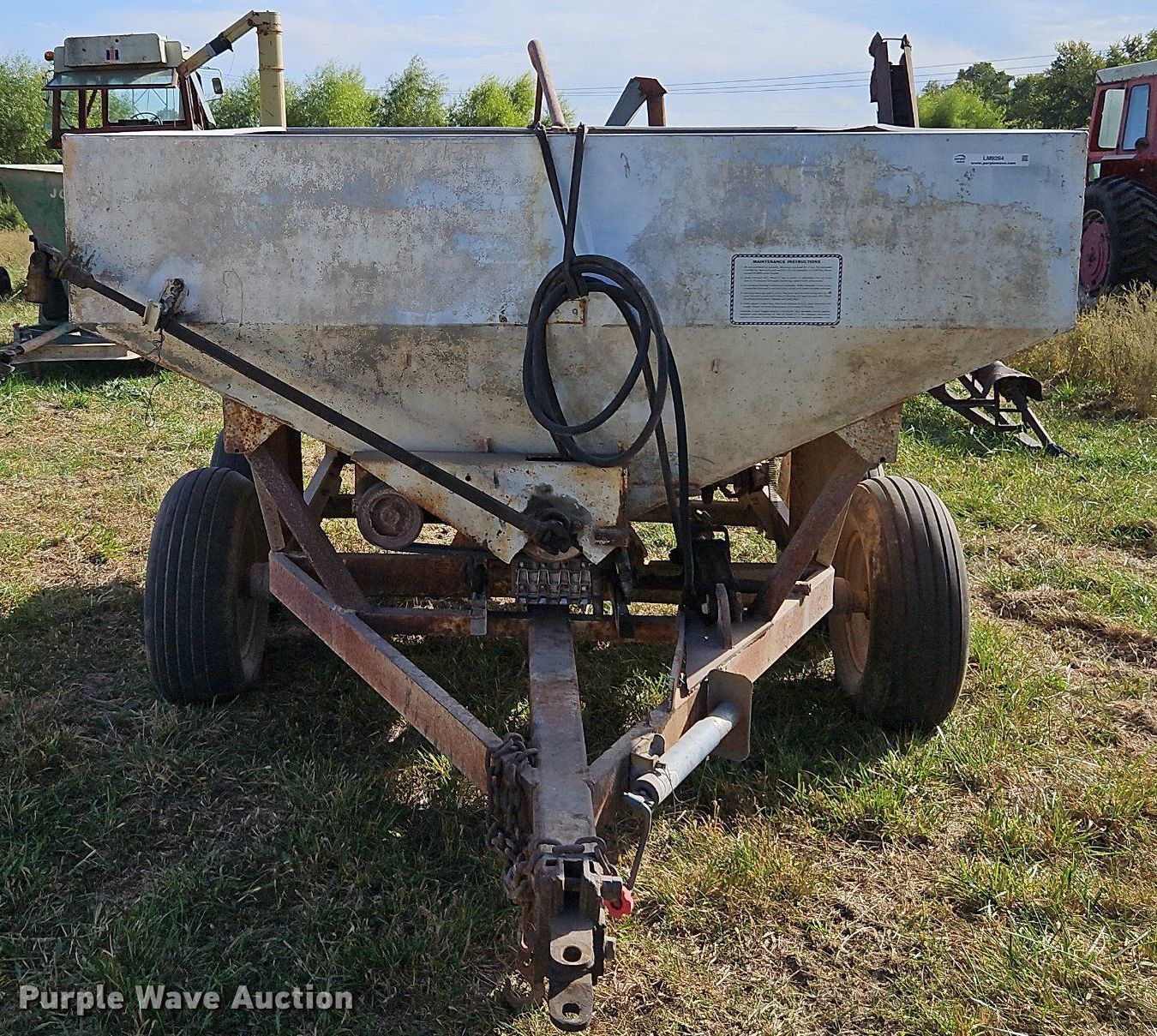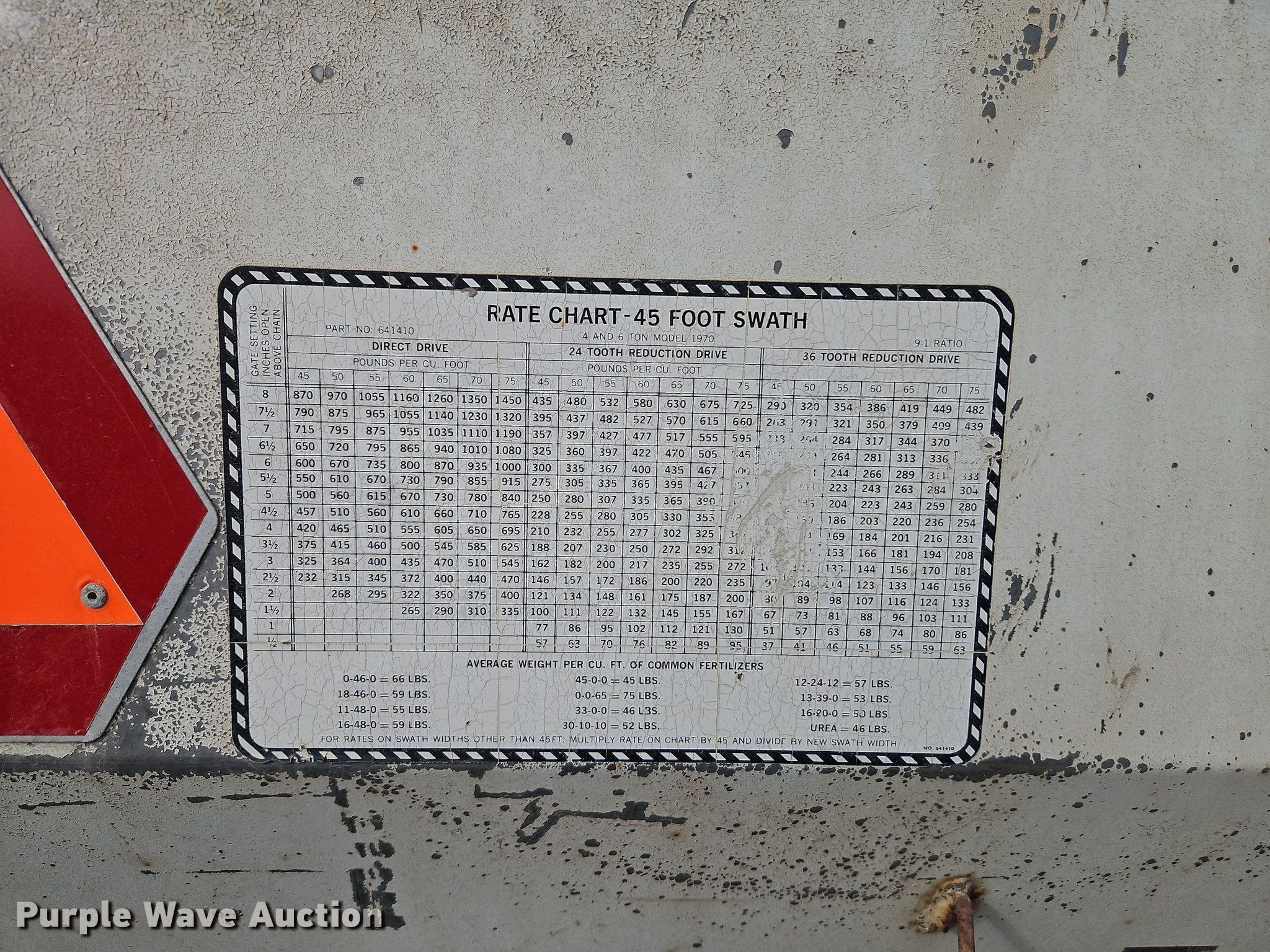 Purple Wave is selling a used Applicator Pull Type in Kansas. This item is a Co Op 1974 spreader with the following: PTO: 540, Dry fertilizer spreader, Tons capacity: 4, Stainless steel, Dual spinners, Ground driven, Conveyor belt, Width: 7",
