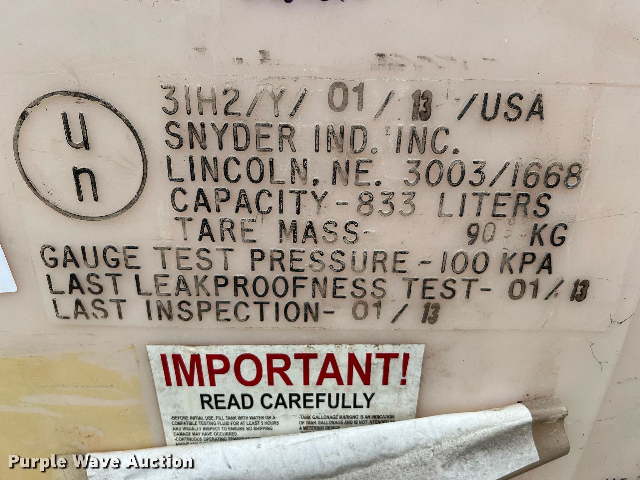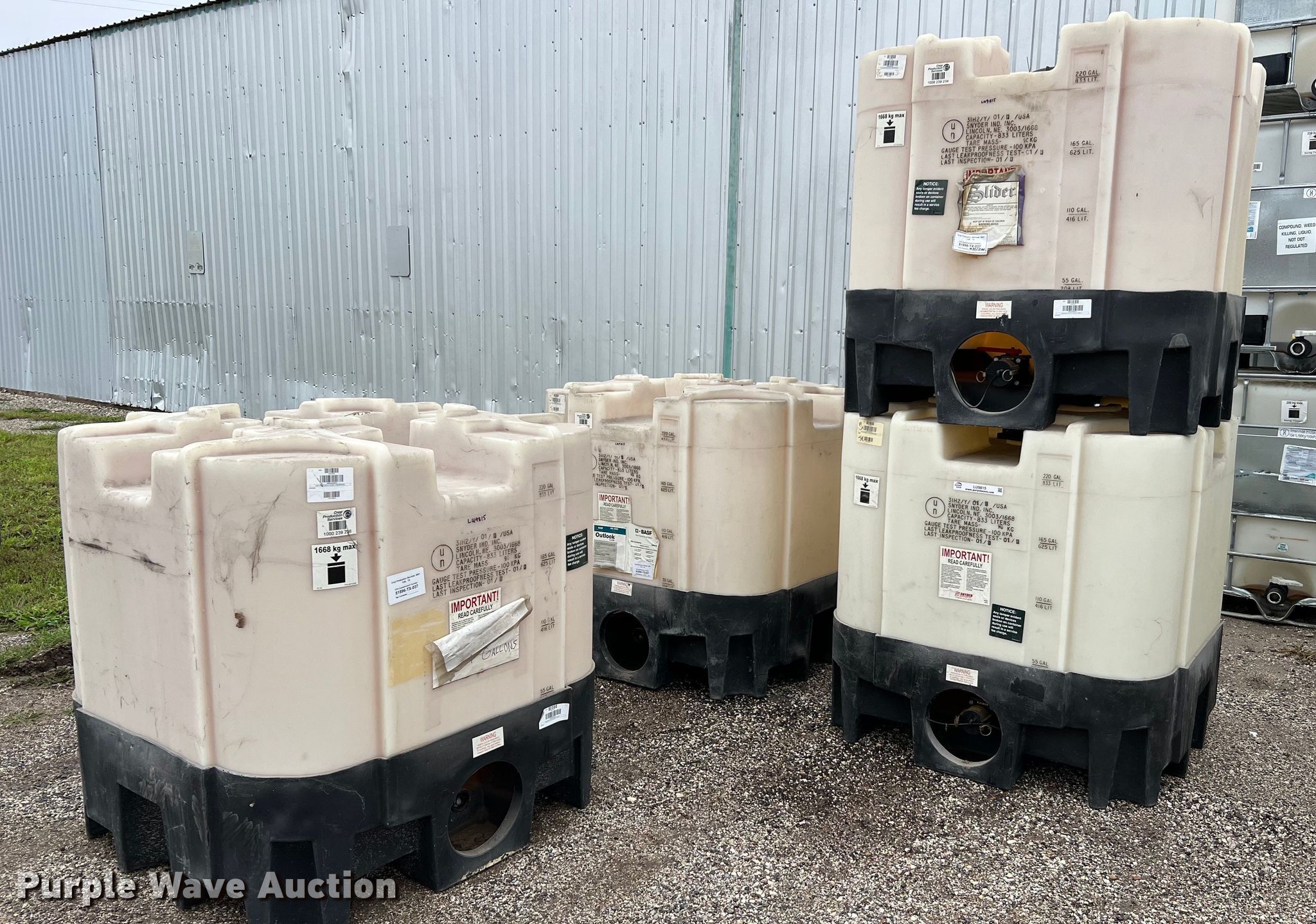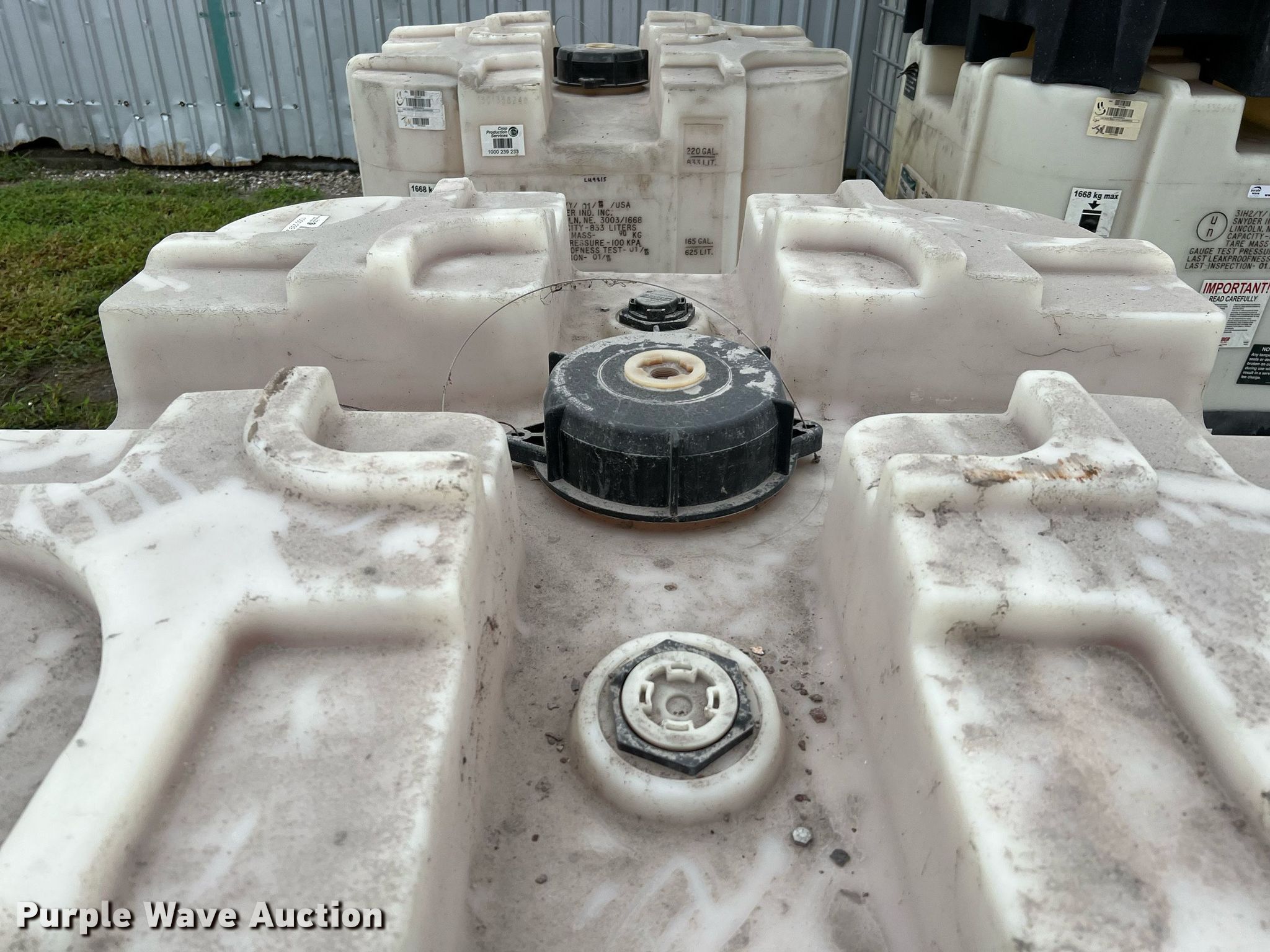 Purple Wave is selling a used Tanks in Texas. This item is a (4) Snyder 220 gallon totes with the following: Outlet: 2", Totes have not been cleaned, possible chemical residue