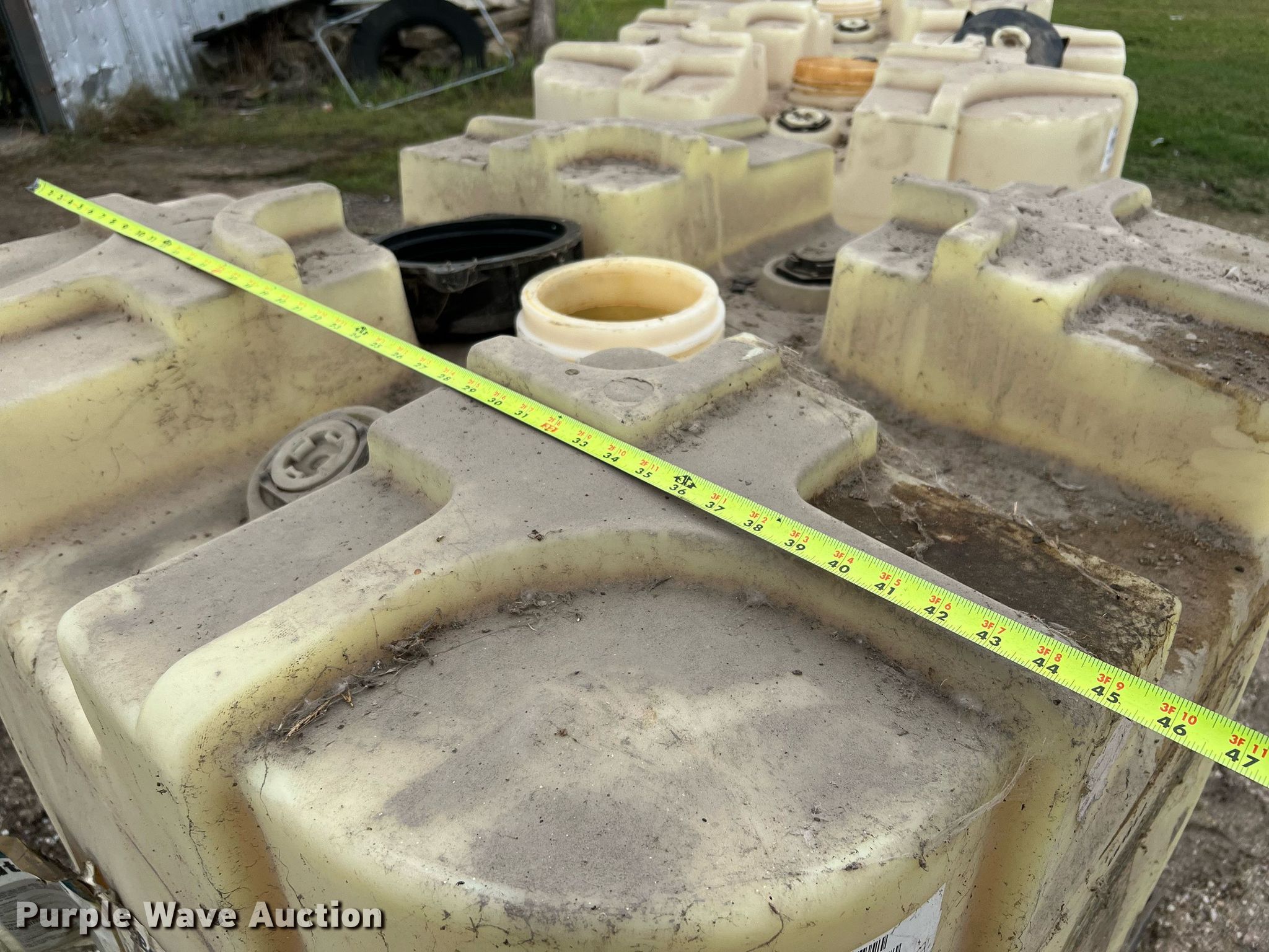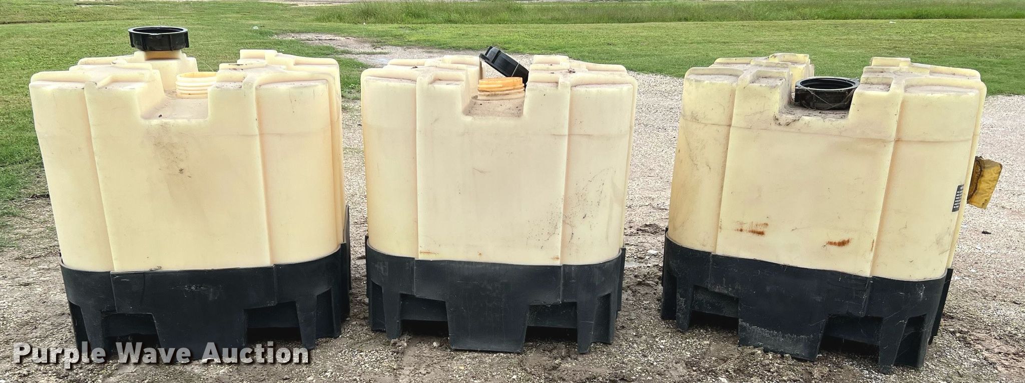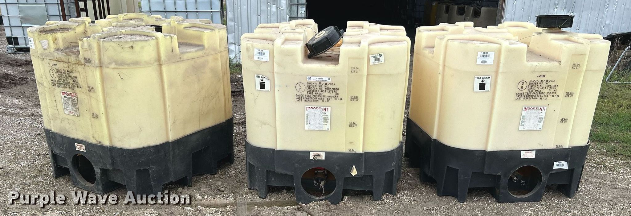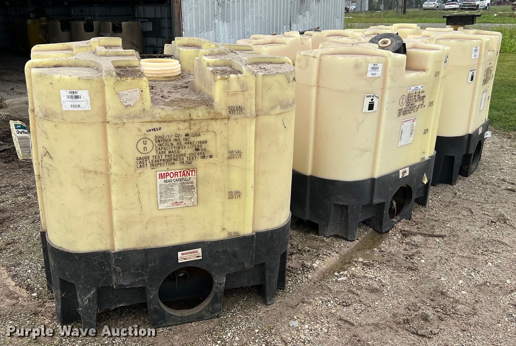Purple Wave is selling a used Tanks in Texas. This item is a (3) Snyder 220 gallon totes with the following: Outlets: 2", Totes have not been cleaned, possible chemical residue