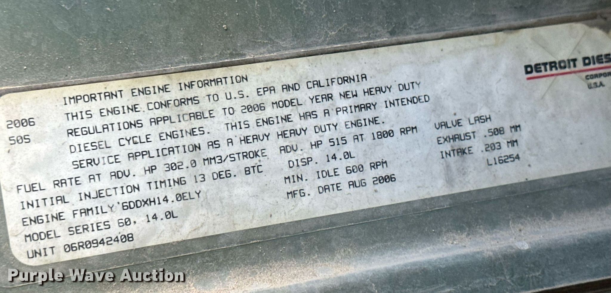 2007 Sterling AT9500 semi truck. Miles: 563,351 on odometer, Hours: 10,595 on meter, VIN: 2FWJA3CK07AX75302, Unit #: 3. Engine Detroit Diesel, Displacement: 14.0L, Cylinders: 6, Fuel type: Diesel, Engine brake. Transmission Manual, Speed: 10. Chassis Axles: Tandem, Differential lock: Inter-axle, Suspension: Air Dump valves, Brakes: Air. Interior AC, Heat, Power windows, Cruise control, Air ride cab. Features Fifth wheel type: Air operated, Sliding, Fuel tank: Dual. Tires Size: 295/75R22.5. Notes Dash warning indicator: Check engine. New Mexico title. Title distribution may be delayed up to 14 days from verification of funds. Mymar Terminal Service LLC. 1705 South Industrial Drive. Portales, NM 88130