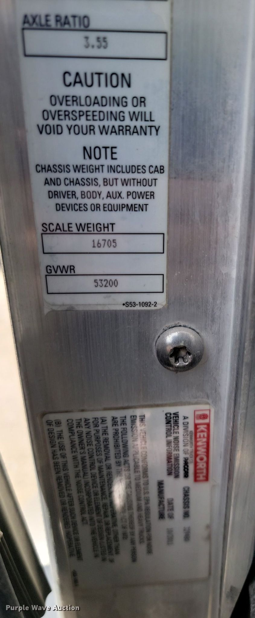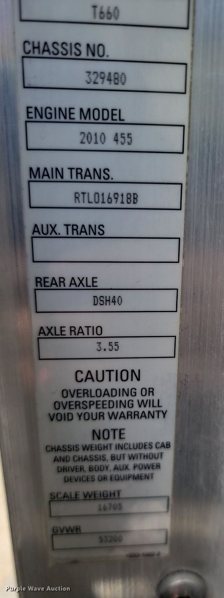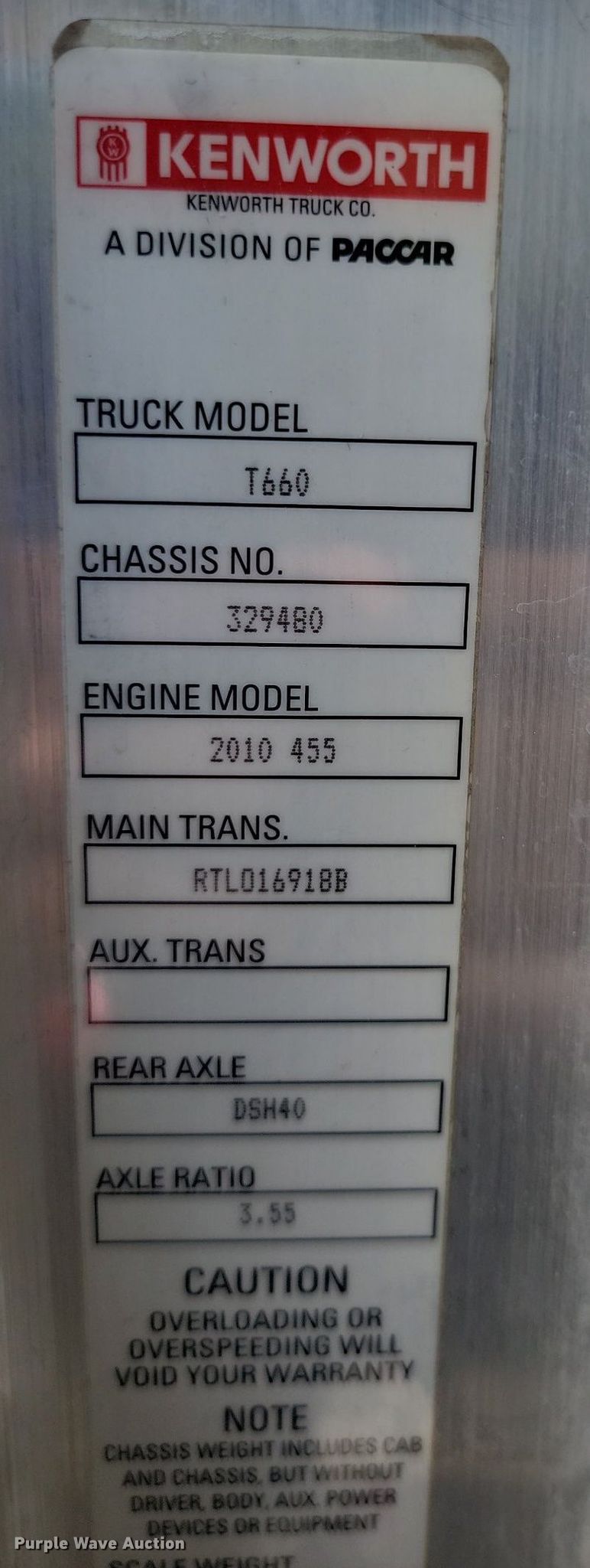 2012 Kenworth T660 semi truck. Miles: 482,773 on odometer, Hours: 18,395 on meter, VIN: 1XKADP9X0CJ329480. Engine Paccar, Displacement: 12.9L, Cylinders: 6, Fuel type: Diesel, HP: 455, kW: 340, Engine brake. Transmission Eaton Fuller, Manual. Chassis Axles: Tandem, Differential lock: Full, Suspension: Air, Brakes: Air, PTO, Wet kit, GVWR: 53,200 lbs FAWR: 13,200 lbs, IAWR: 20,000 lbs, RAWR: 20,000 lbs, Wheelbase: 196". Interior AC, Heat, Power windows, Power locks, Cruise control, Air ride cab. Features Deck plate: Aluminum, Fifth wheel type: Air operated, Sliding, Fuel tank: Single. Tires Size: 11R24.5. Kansas title. Seller is a Kansas licensed motor vehicle dealer. The buyer may be required to pay sales tax and/or registration fees to the dealer prior to taking possession. Title will be assigned and distributed by the dealer. Please contact the seller for distribution questions. Title distribution may be delayed up to 14 days from verification of funds. 820 S Fry St. Yates Center, KS 66783