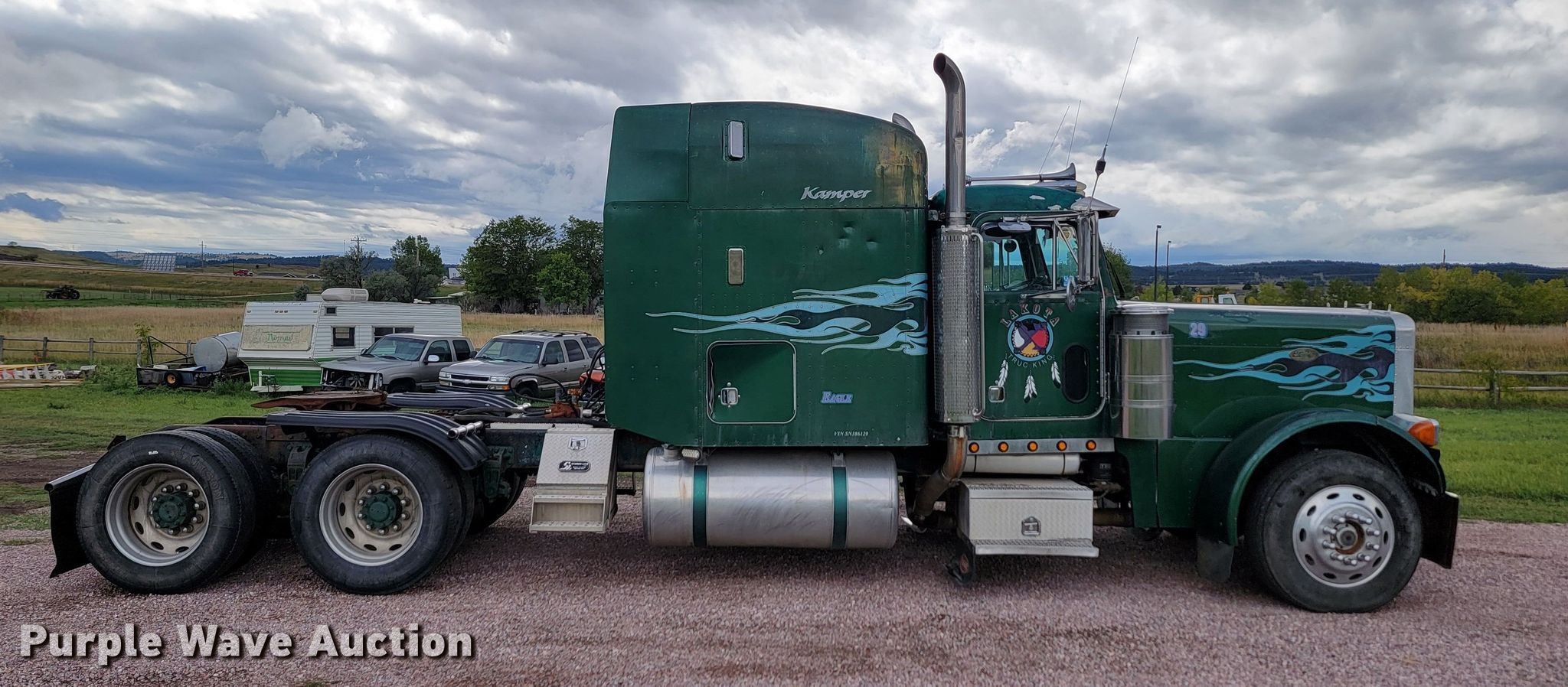 1995 Peterbilt 379 semi truck. Miles: 2,068,473 on odometer, VIN: 1XP5DB9X1SN386129. Engine Caterpillar 3406, Displacement: 14.6L, Cylinders: 6, Fuel type: Diesel, Engine brake. Transmission Eaton Fuller, Manual, Speed: 13. Chassis Axles: Tandem, Differential lock: Inter-axle, Suspension: Air Dump valves, Brakes: Air, PTO, Wet kit, Truck chassis: 13', GVWR: 50,000 lbs FAWR: 12,000 lbs, IAWR: 19,000 lbs, RAWR: 19,000 lbs. Interior AC, Heat, Heated mirrors, Cruise control, Air ride cab, Sleeper Sleeper length: 64", Beds: Single, Rear climate control. Features Fifth wheel type: Air operated, Sliding, Fuel tank: Dual. Tires Size: 285/75R24.5. Notes Windshield chipped or cracked. South Dakota title. Title distribution may be delayed up to 14 days from verification of funds. 24539 Gumbo Lily Lane. Hermosa, SD 57744