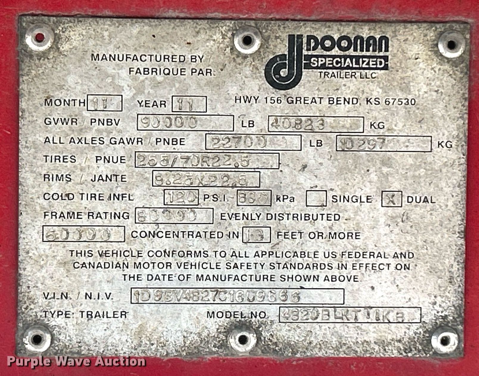2012 Doonan 4820BLKTTIKB flatbed trailer. VIN: 1D9BV4827C1609666, Unit #: 342. Dimensions Overall: 48' x 102" W. Features Deck type: Aluminum. Chassis Landing gear: Dual, Suspension: Air, Brakes: Air, Axles: Spread, GVWR: 90,000 lbs, GAWR: 22,700 lbs. Tires Size: 295/75R22.5. Oklahoma title. 1020 Fort Gibson Rd. Catoosa, OK 74015