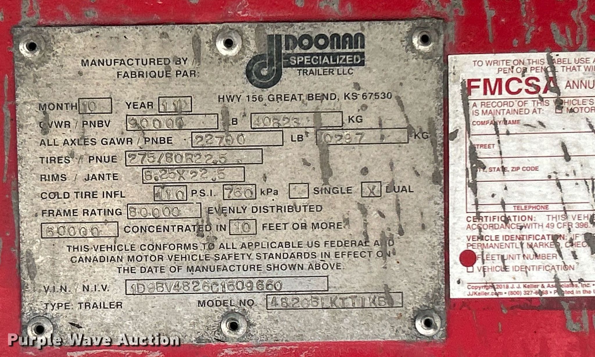 Purple Wave is selling a used Flat or Drop Deck Trailer in Oklahoma. This item is a 2012 Doonan 4820BLKTTIKB flatbed trailer with the following: VIN: 1D9BV4826C1609660, Unit #: 336