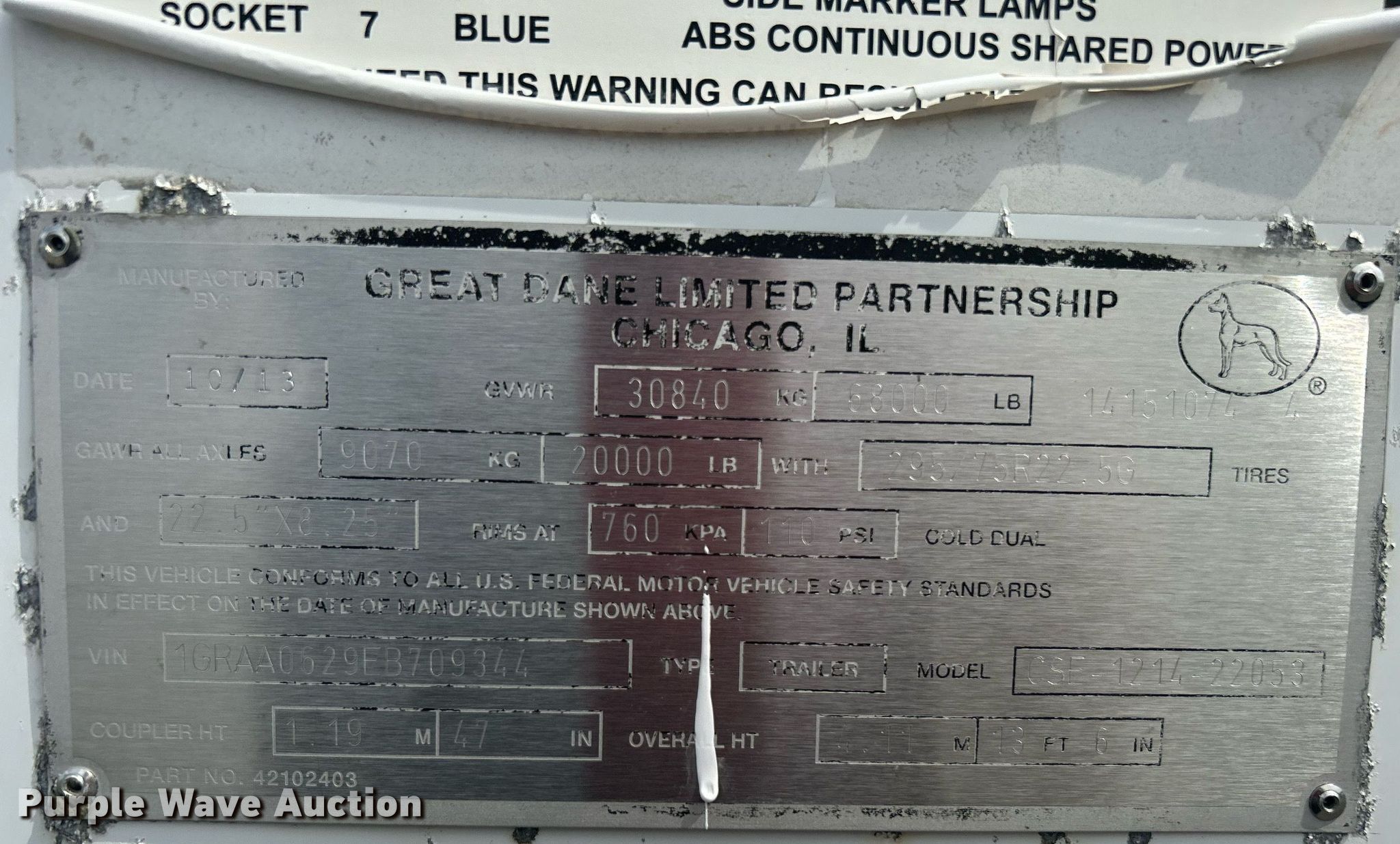 Purple Wave is selling a used Dry Van Trailer in Oklahoma. This item is a 2014 Great Dane CSE-1314-22053 dry van trailer with the following: VIN: 1GRAA0629EB709344