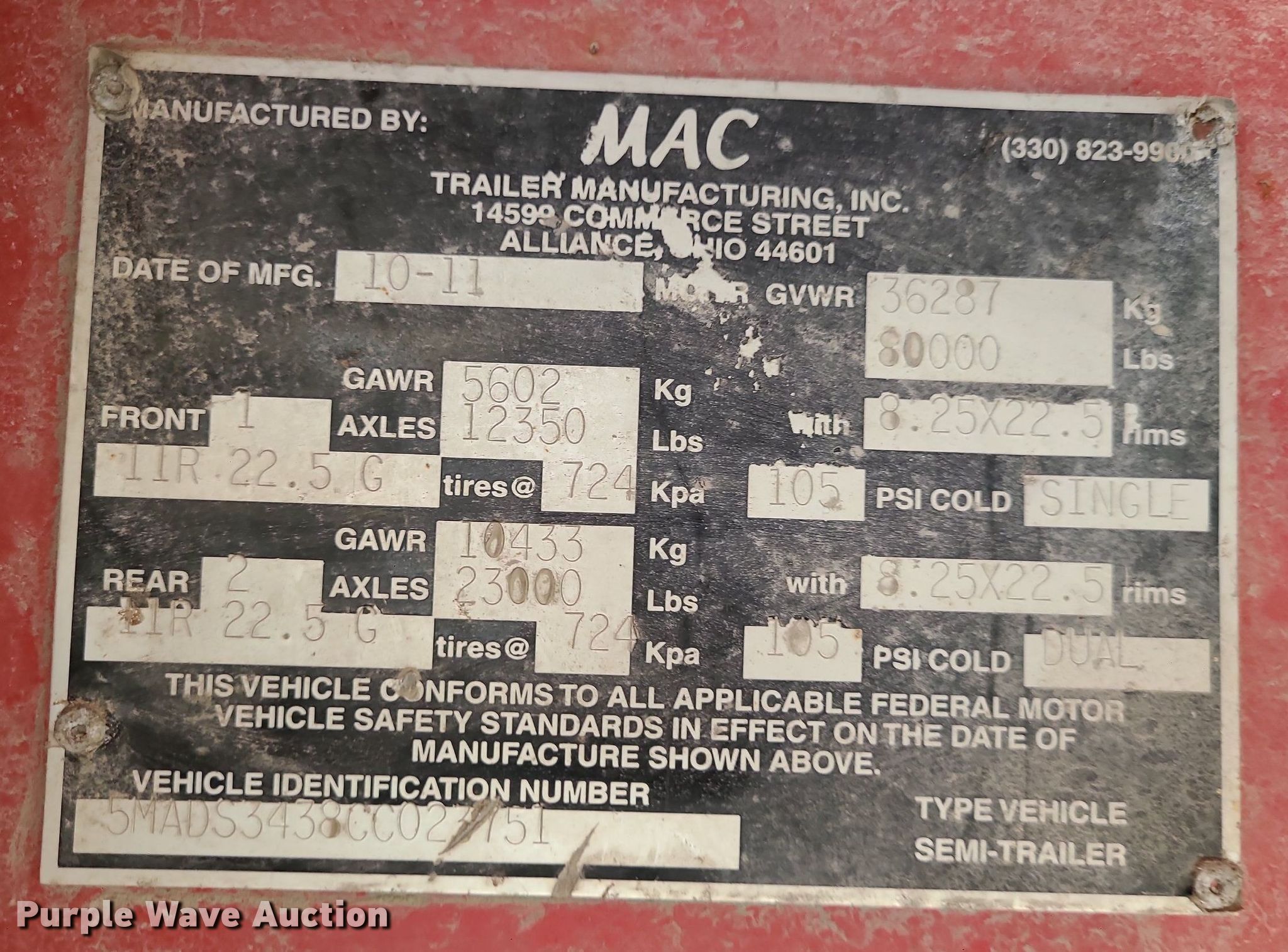 Purple Wave is selling a used End Dump Rock Trailer in Missouri. This item is a 2012 MAC end dump trailer with the following: VIN: 5MADS3438CC023751
