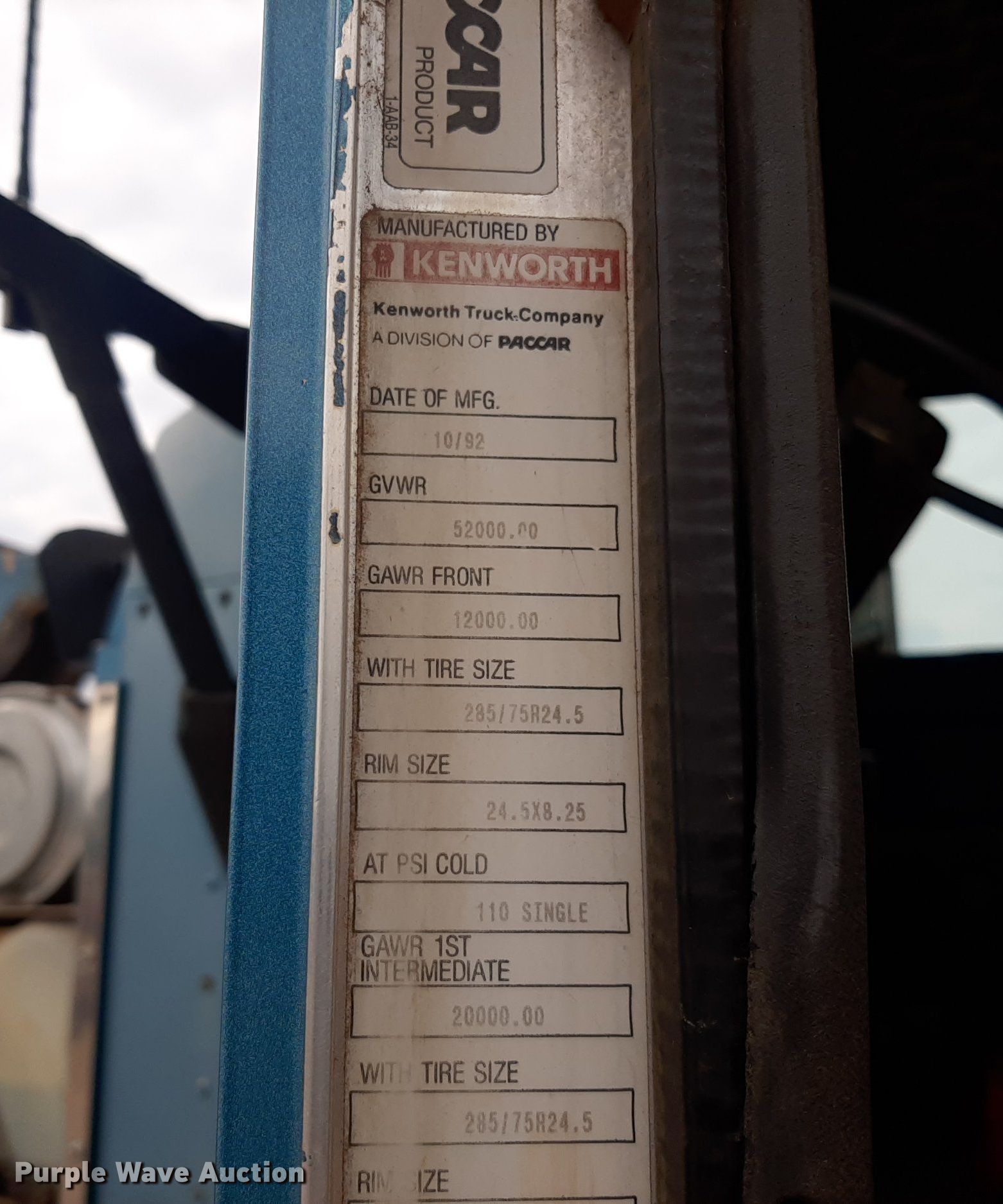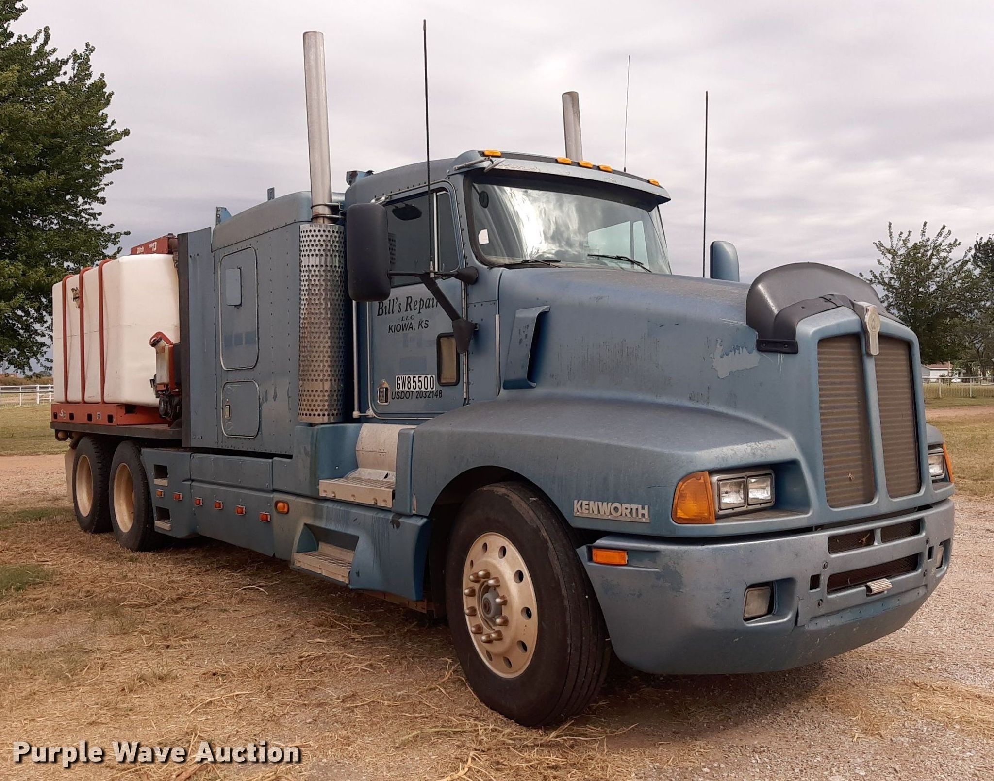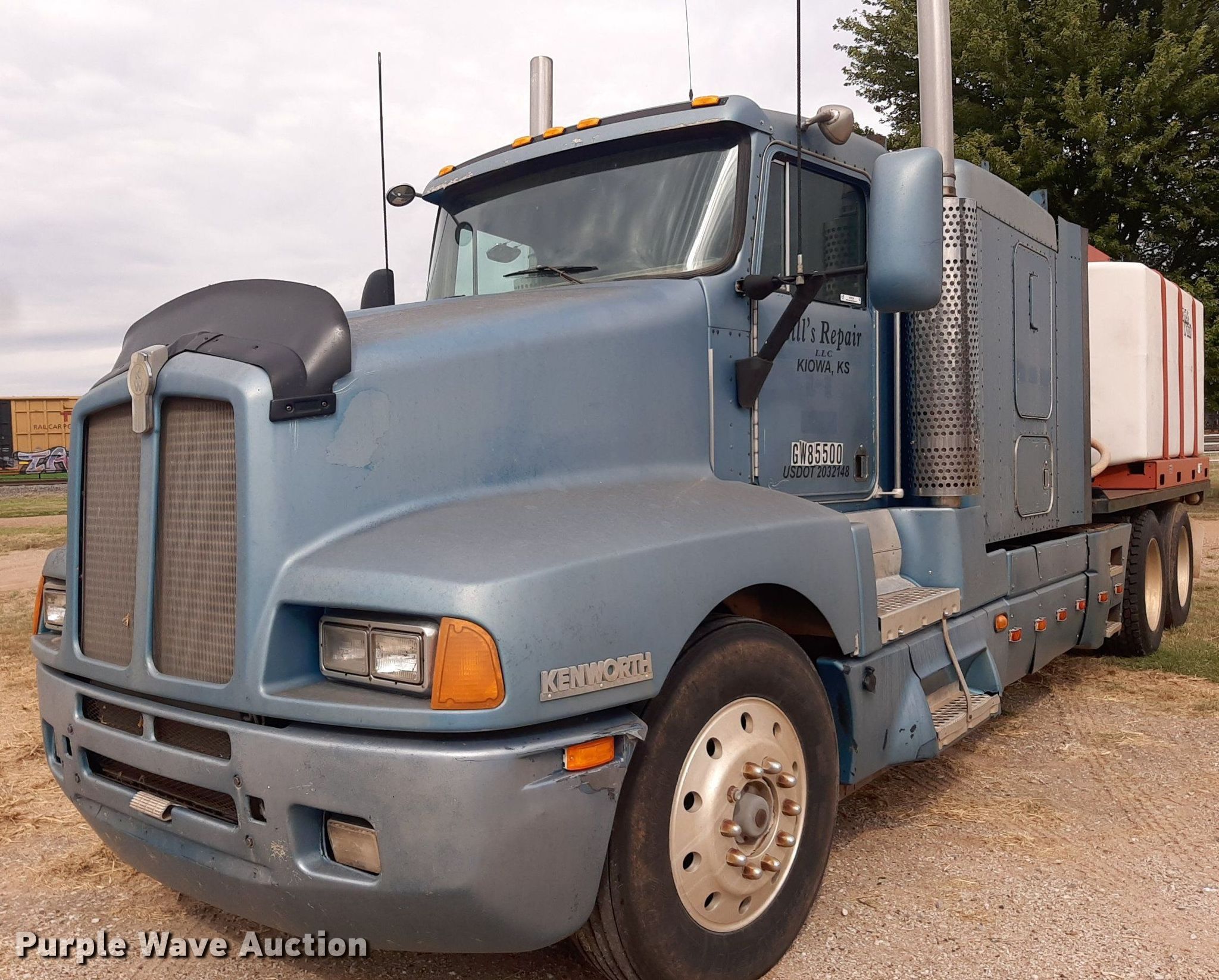 1993 Kenworth T600B flatbed truck. Miles: 722,778 on odometer, VIN: 1XKADR9X5PS592740. Engine Detroit Diesel, Displacement: 12.7L, Cylinders: 6, Fuel type: Diesel. Transmission Manual, Speed: 10. Chassis Axles: Tandem, Differential lock: Inter-axle, Suspension: Air, Brakes: Air, GVWR: 52,000 lbs FAWR: 12,000 lbs, IAWR: 20,000 lbs, RAWR: 20,000 lbs. Interior AC, Heat, Heated mirrors, Cruise control, Sleeper Sleeper length: 64", Beds: Single, Rear climate control. Features Fuel tank: Dual, Ditch Witch FM13 mud mixer, (2) 1,000 gallon poly tanks, MP pump, Honda gas engine. Tires Size: 285/75R24.5. Kansas title. Vehicle has an E-Title in the State of Kansas. A paper title will be distributed to the buyer within 30 days from verification of funds. Bill's Repair. 410 Hopkins St. Kiowa, KS 67070