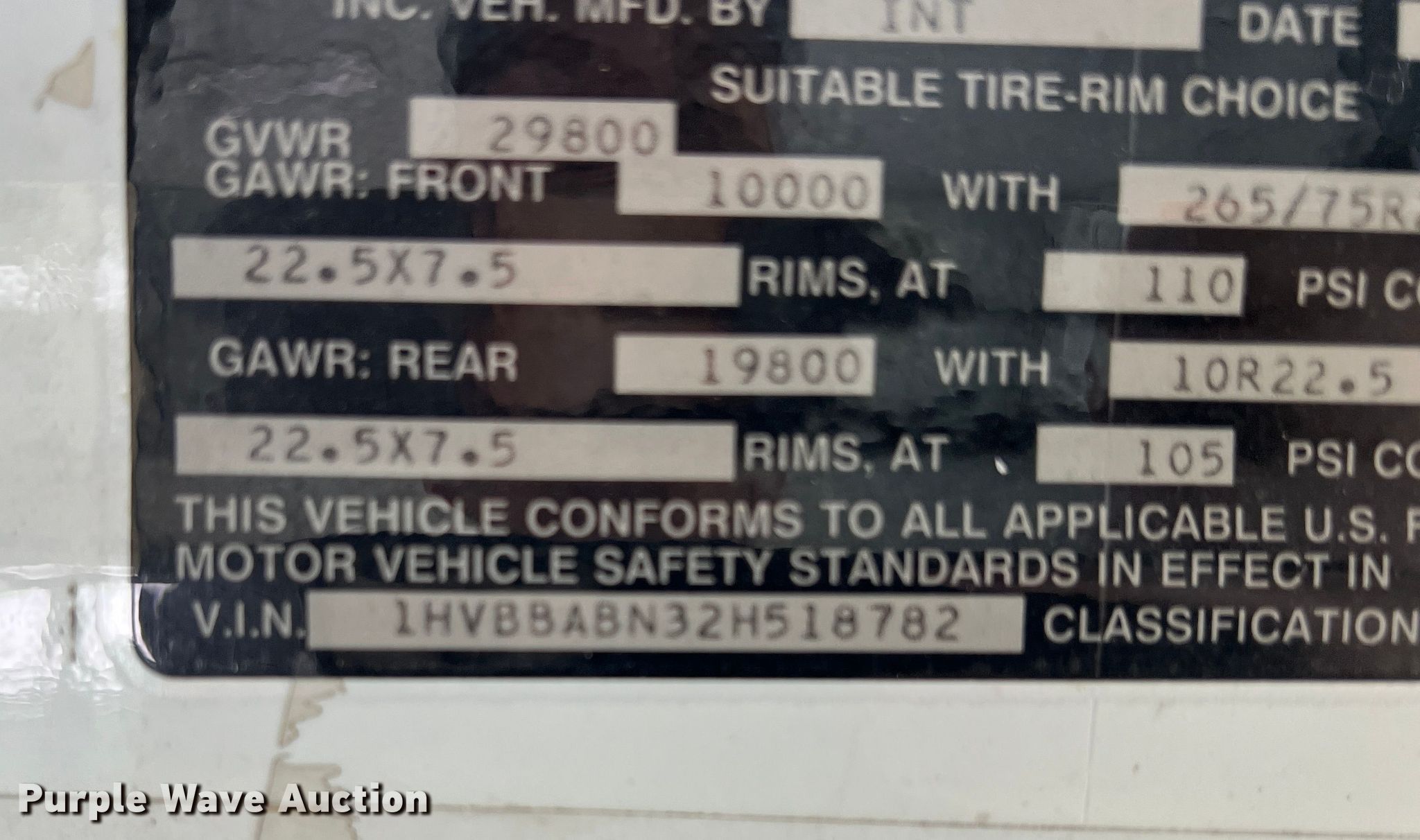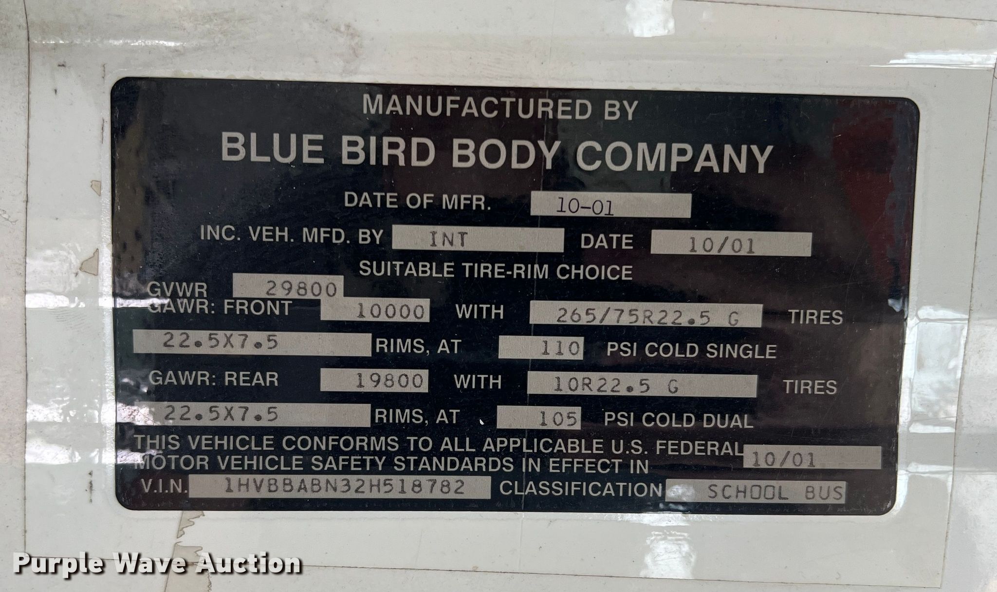 2002 International 3800 school bus. Miles: 186,736 on odometer, Hours: 14,687 on meter, VIN: 1HVBBABN32H518782. Engine Displacement: 7.3L, Cylinders: 8, Fuel type: Diesel. Transmission Automatic. Chassis Axles: Single, Suspension: Spring, Brakes: Air. Interior AC, Heat, Cruise control, Passengers: 77. Tires Size: 11R22.5. Texas title. Title distribution may be delayed up to 14 days from verification of funds. 11640 US-287 BUS. Fort Worth, TX 76179