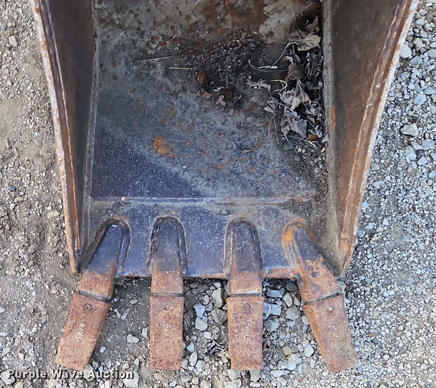 John Deere mini excavator bucket. Teeth: 4, Width: 18". Gerken Rent-All. 31600 Old KC Rd. Paola, KS 66071