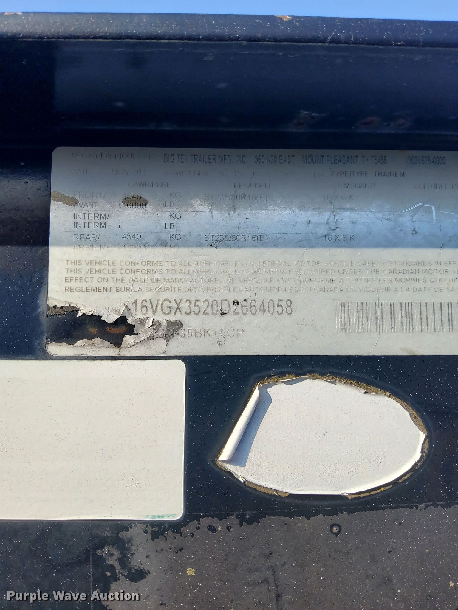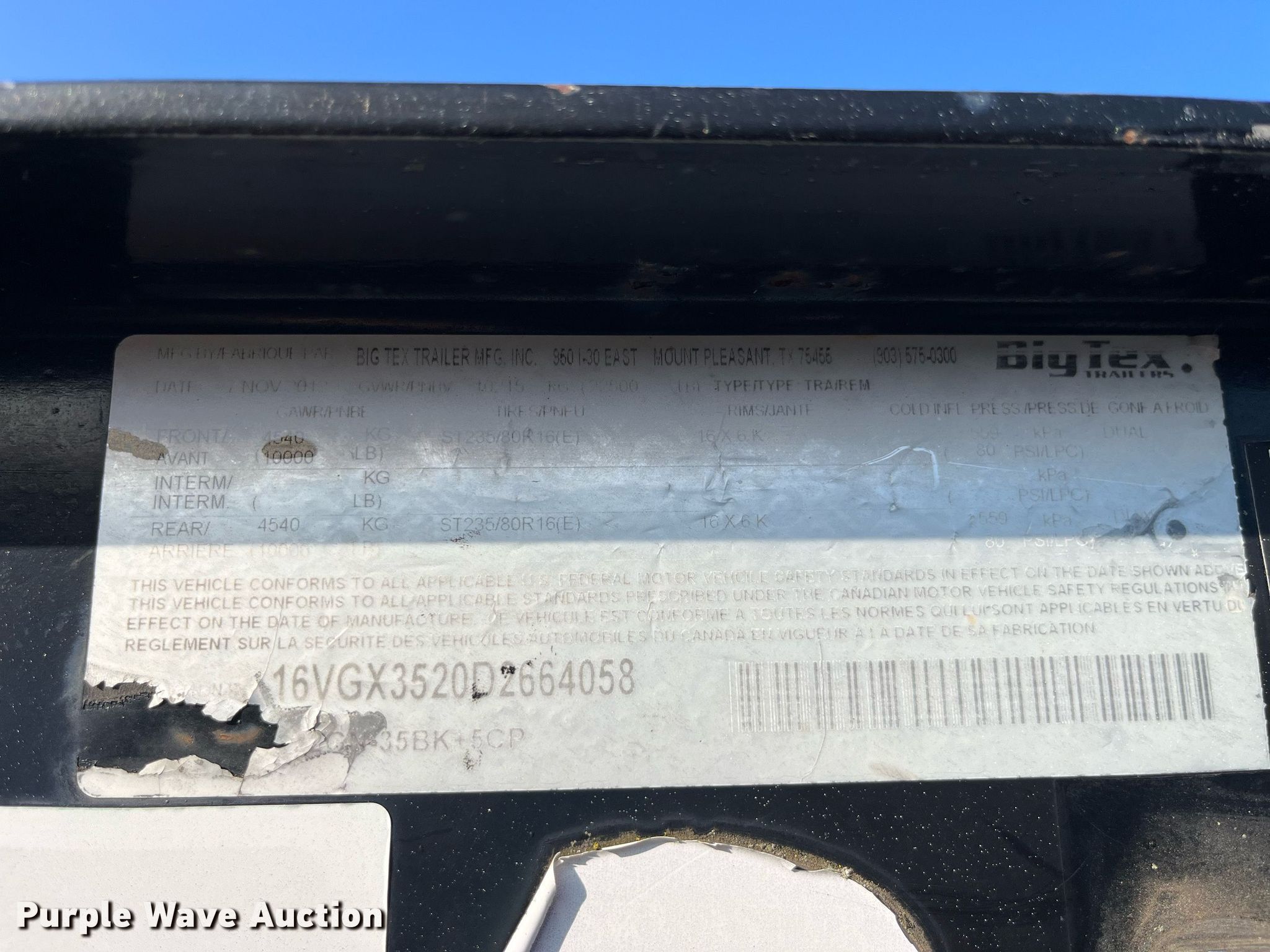 Purple Wave is selling a used Equip. Trailer in Missouri. This item is a 2013 Big Tex equipment trailer with the following: VIN: 16VGX3520D2664058