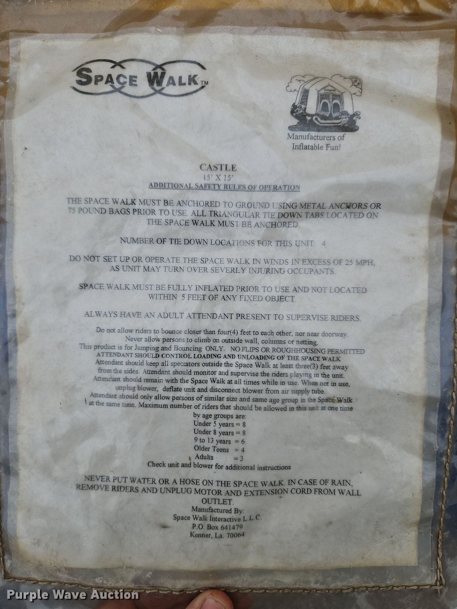 Purple Wave is selling a used Sporting Goods in Kansas. This item is a Space Walk bounce house with the following: 15' L x 15' W x 13' H, Fan included