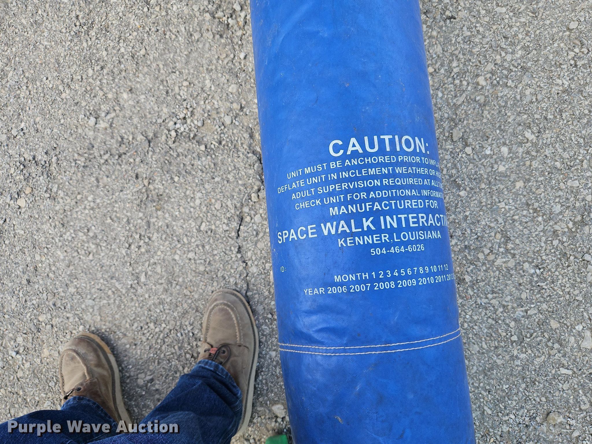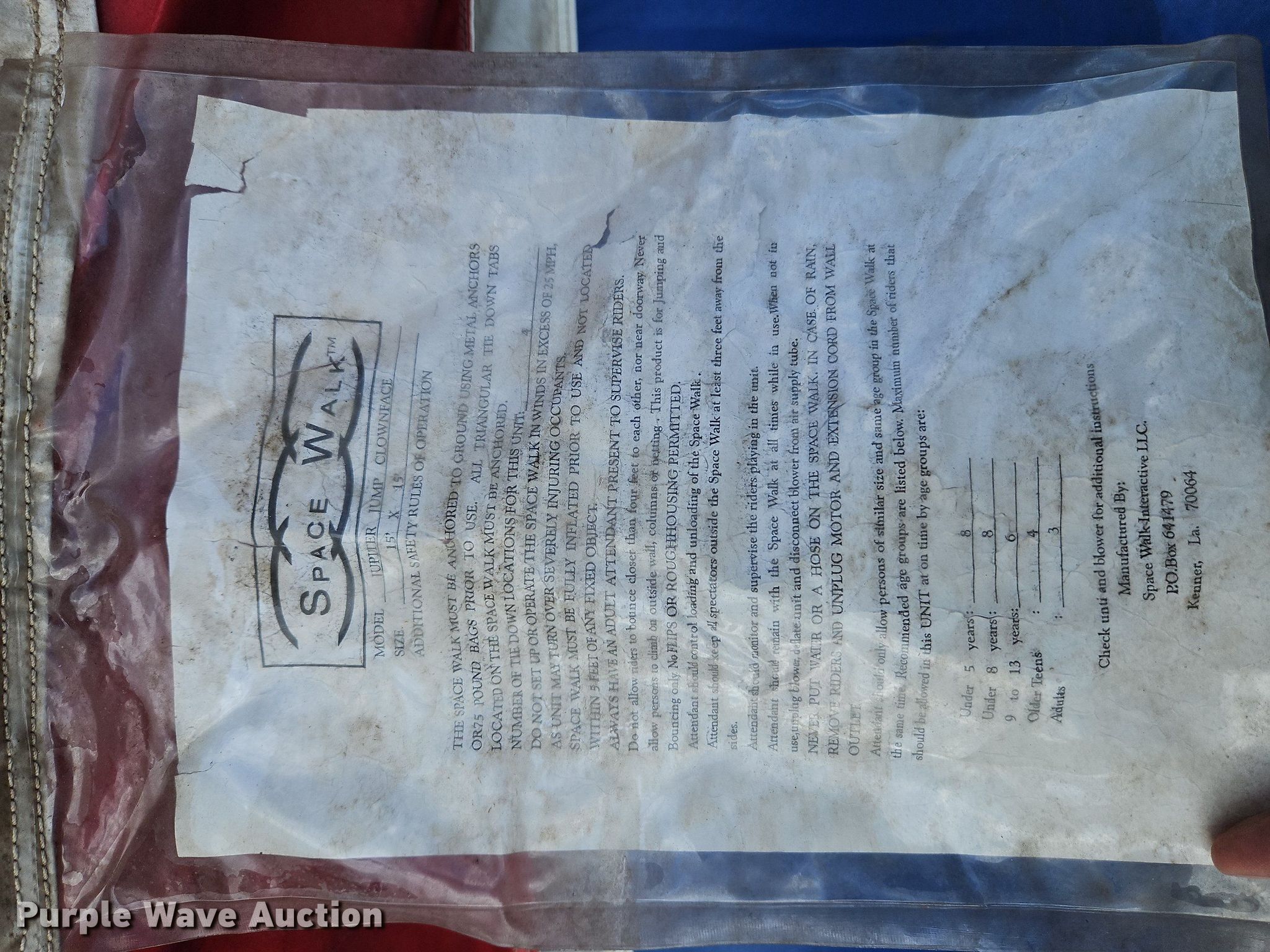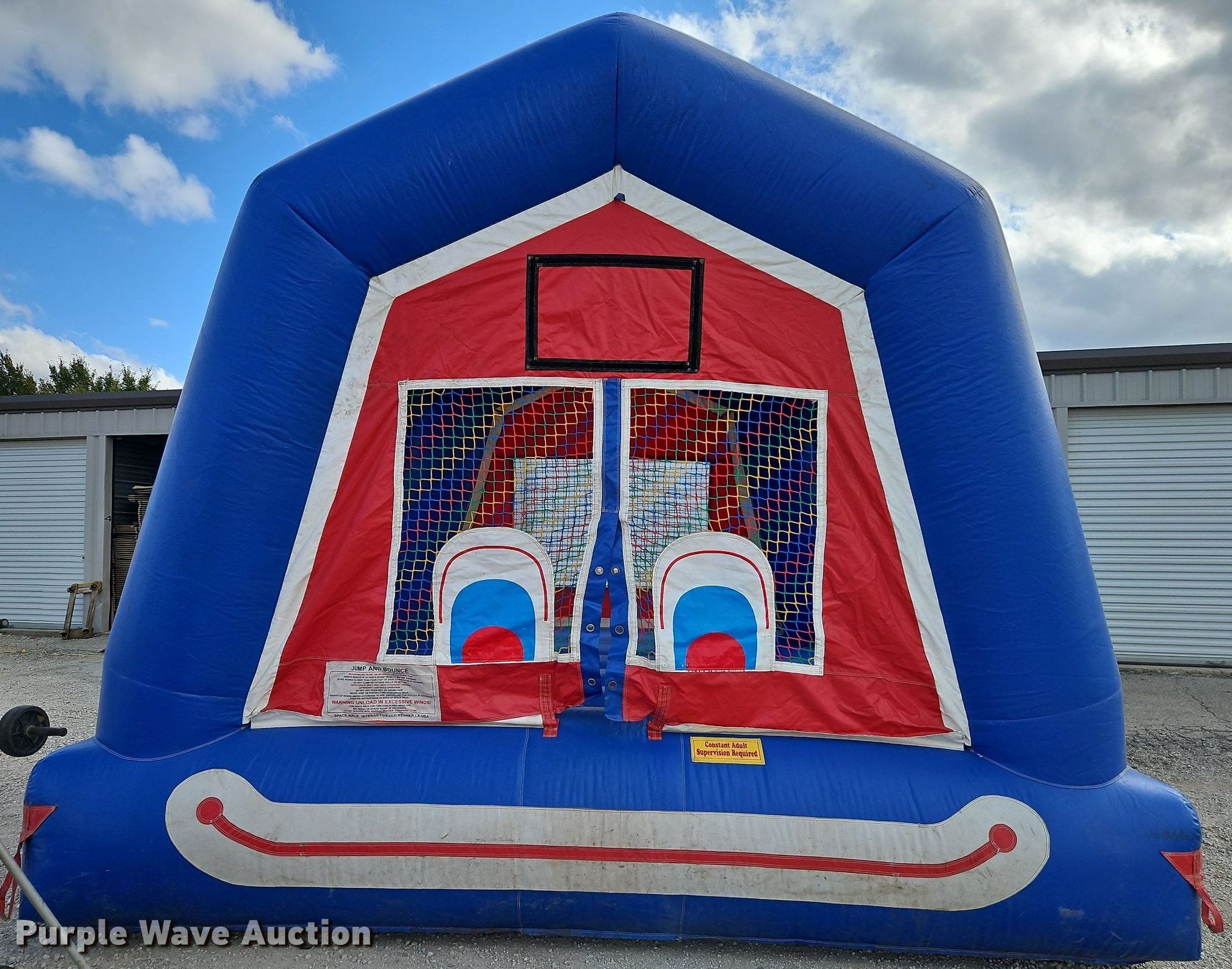 Purple Wave is selling a used Sporting Goods in Kansas. This item is a Space Walk Jupiter Jump Clownface bounce house with the following: 15' L x 15' W x 13' H, Fan included