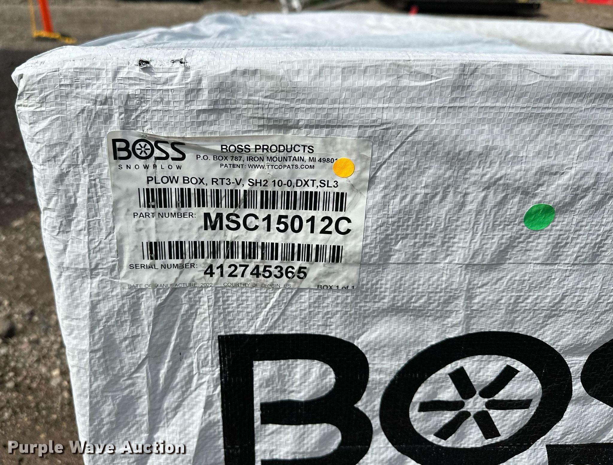 Purple Wave is selling a used Truck Part and Attach. in Minnesota. This item is a Boss Power V DXT snow plow with the following: Serial: 412745365, Width: 10', Wiring harness, Fits 2017 and newer Ford F450. F450 trucks, Mounting bracket, Unused