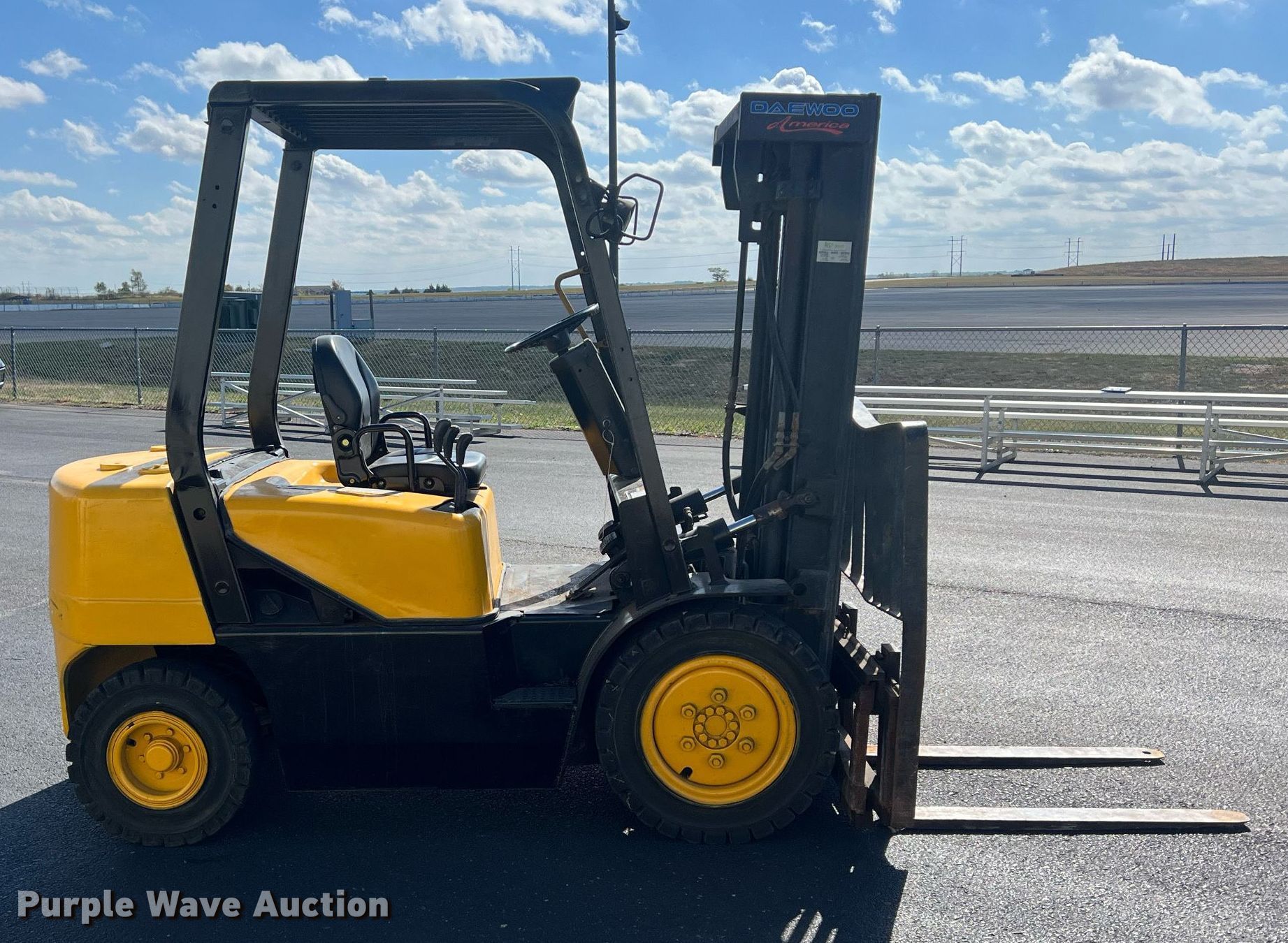 Purple Wave is selling a used Cushion Tire or Pneumatic Forklift in Kansas. This item is a Daewoo G25E-3 forklift with the following: Hours: 12,533 on meter, Serial: CW-02918