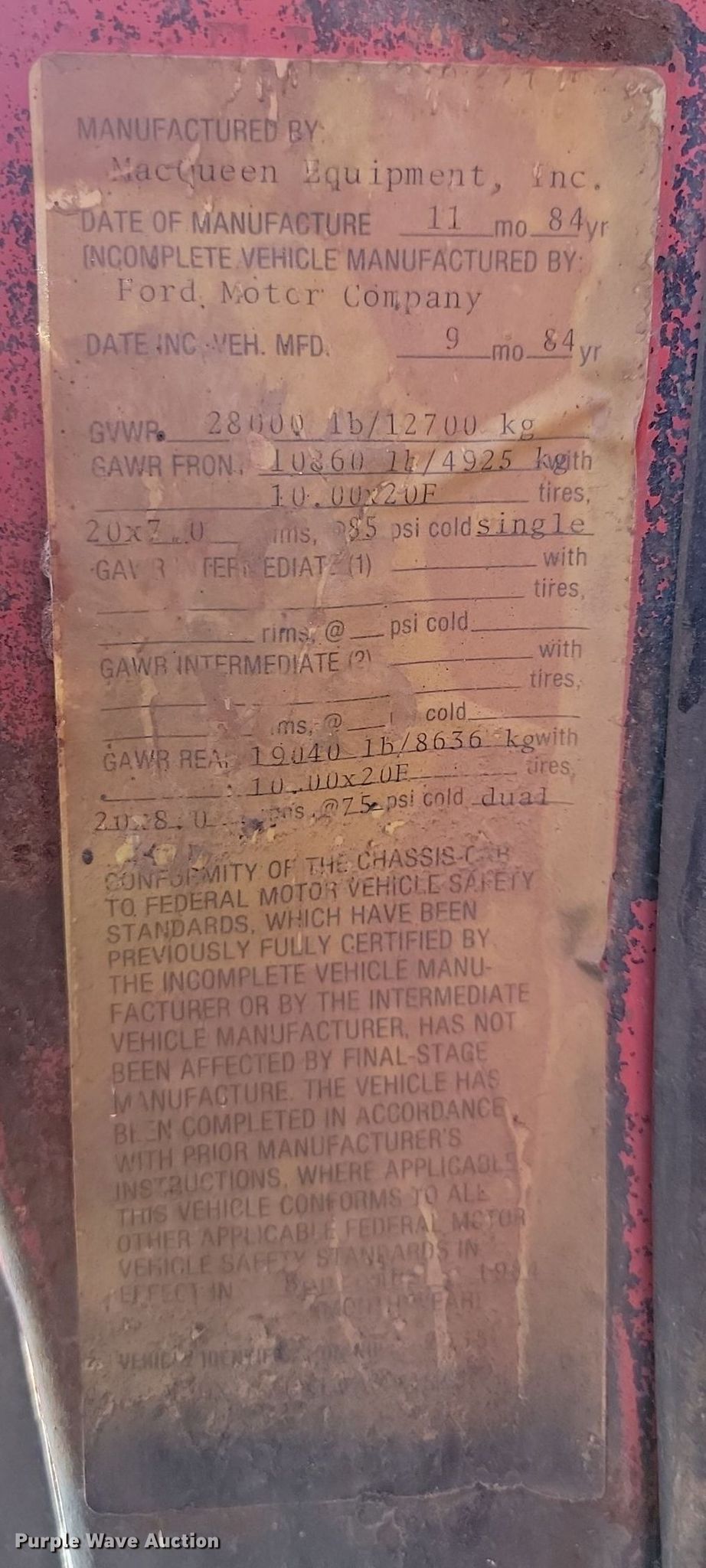 1985 Ford 8000 dump truck. Miles: 4,831 on odometer, Hours: 1,590 on meter, VIN: 1FDXK80UXFVA09483. Engine Cummins, Cylinders: 6, Fuel type: Diesel. Transmission Automatic. Chassis Axles: Single, Suspension: Spring, Brakes: Air, Front mount PTO. Interior Heat. Features Dump bed 10' L x 96" W, Side height: 28", Bed type: Steel, Ram: Single , End gate: Manual, Plow Width: 144". Tires Size: 11R22.5. Notes Windshield chipped or cracked, Dead battery, Dump bed issues, will not raise. South Dakota title. Seller is a licensed motor vehicle dealer. The buyer may be required to pay sales tax and/or registration fees to the dealer prior to taking possession. Title will be assigned and distributed by the dealer. Please contact the seller for distribution questions. Noteboom RV. 27316 SD-115. Harrisburg, SD 57032