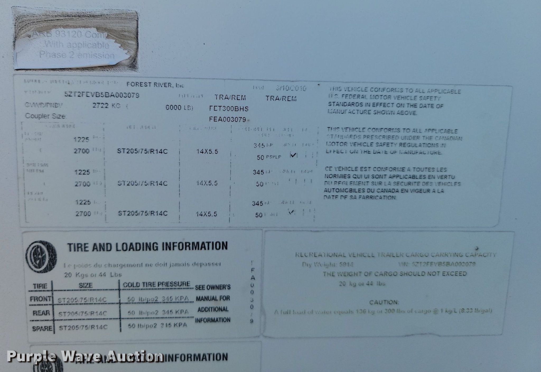 2011 Forrest River Coachmen camper. Camper length: 33' 3", VIN: 5ZT2FEVB5BA003079. Chassis Axles: Tandem, Suspension: Spring, Brakes: Electric. Interior Kitchen: Sink, Refrigerator, Freezer, Microwave, Oven, Stove: Propane, Living room: Table, Couch, Bathroom, Beds: 1 Bed type: Queen, TVs: 1, Heater, AC units: 1. Features Slide outs: 2, Ball hitch: 2 5/16". Tires Size: ST205/75R14. Notes Floor is soft. South Dakota salvage title. Seller is a licensed motor vehicle dealer. The buyer may be required to pay sales tax and/or registration fees to the dealer prior to taking possession. Title will be assigned and distributed by the dealer. Please contact the seller for distribution questions. Noteboom RV. 27316 SD-115. Harrisburg, SD 57032
