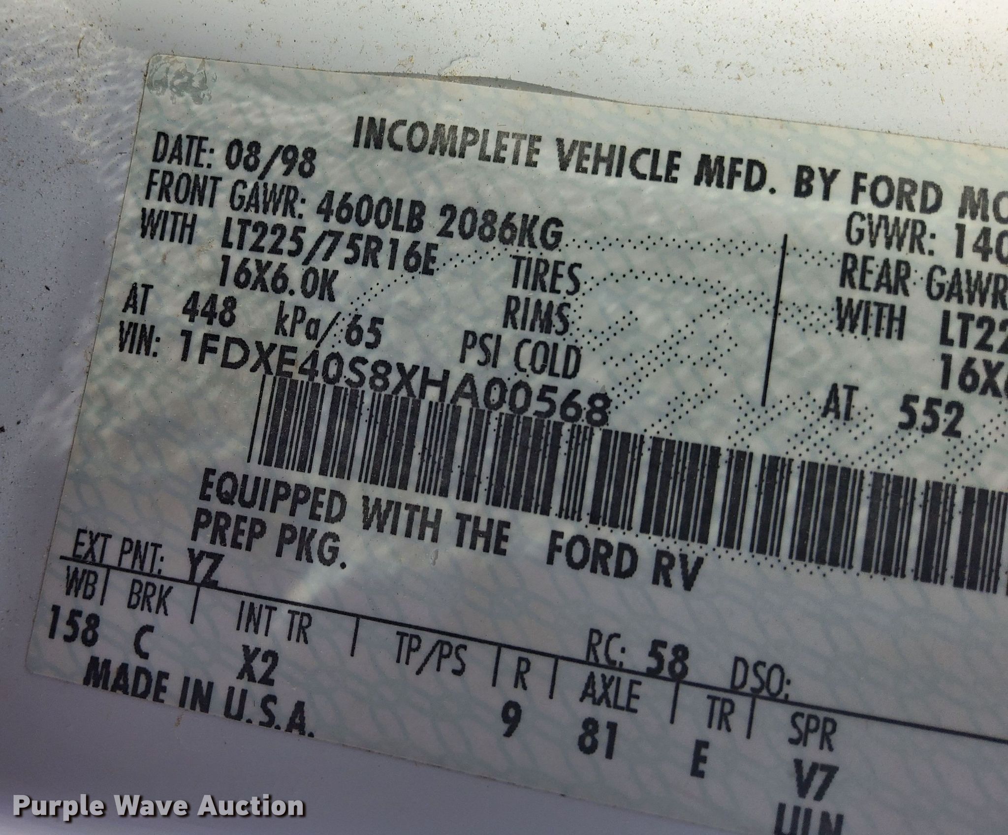 Take a look at this used 1999 Ford E450 RV being sold on November 8th, 2023 in the SOLD! November 08 Vehicles and Equipment Auction made by Ford. Take a look at all of the item information below or take a look at similar auctions for RVs.