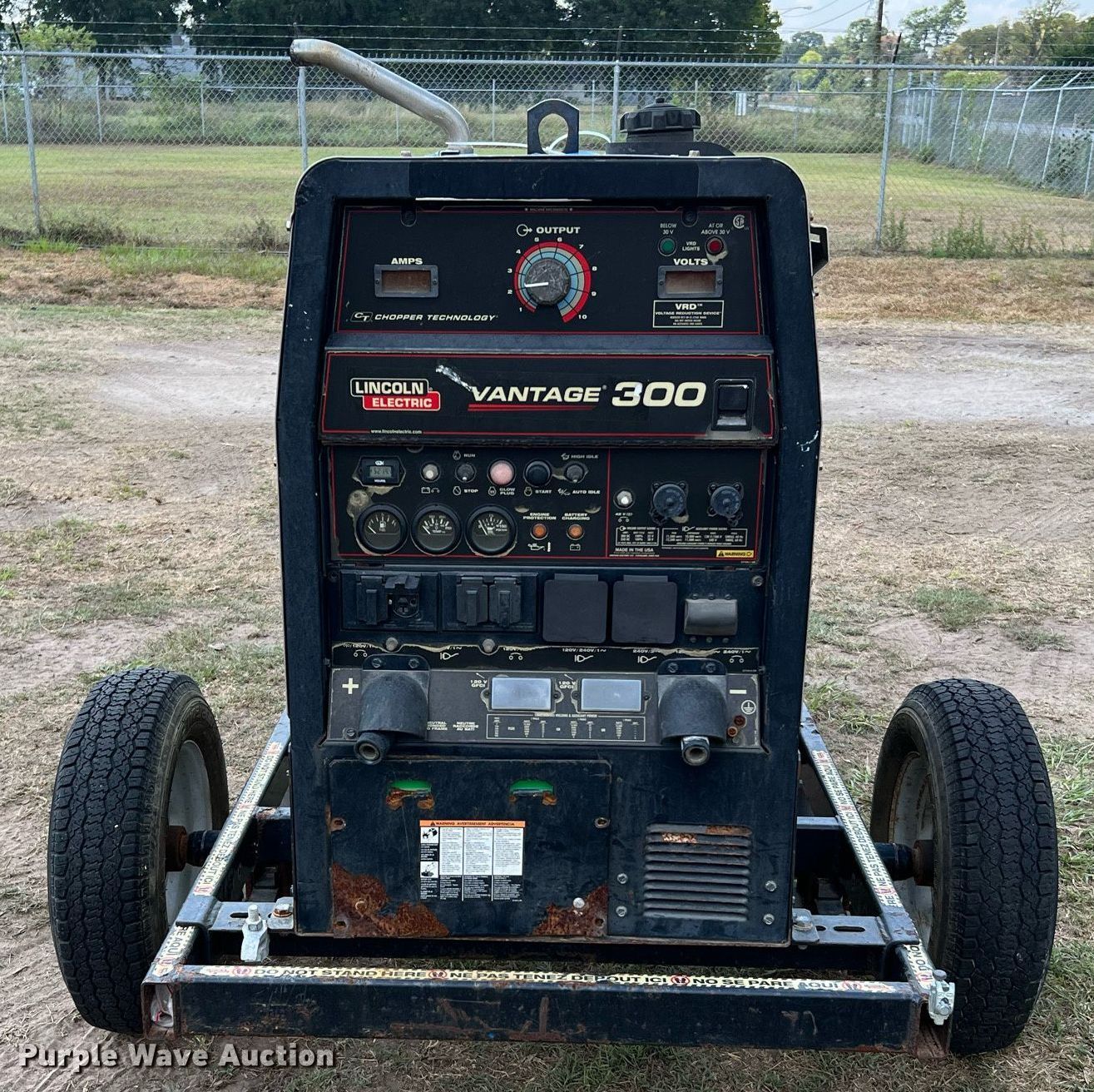 2017 Lincoln Electric Vantage 300 welder/generator. Hours: 5,219 on meter, Serial: U1170205625. Engine Kubota V1505, Displacement: 1.5L, Cylinders: 4, Fuel type: Diesel. Features Welder Capabilities: CC, CV,DC, Wire, TIG, Stick, Fuel tank, Trailer mounted, Generator Watts: 10,000, Phase: Single, Three, 240V outlets: 2, 120V outlets: 4. Trailer 9.5' L x 60" W, Ball hitch size: 2", Suspension: Spring, Axles: Single, Tire size: 175/80D13. This is worksite support equipment and will not come with a title. Transfer of ownership documentation will be a bill of sale. Plunkett Enterprises. 995 South Front Street. Angleton, TX 77515