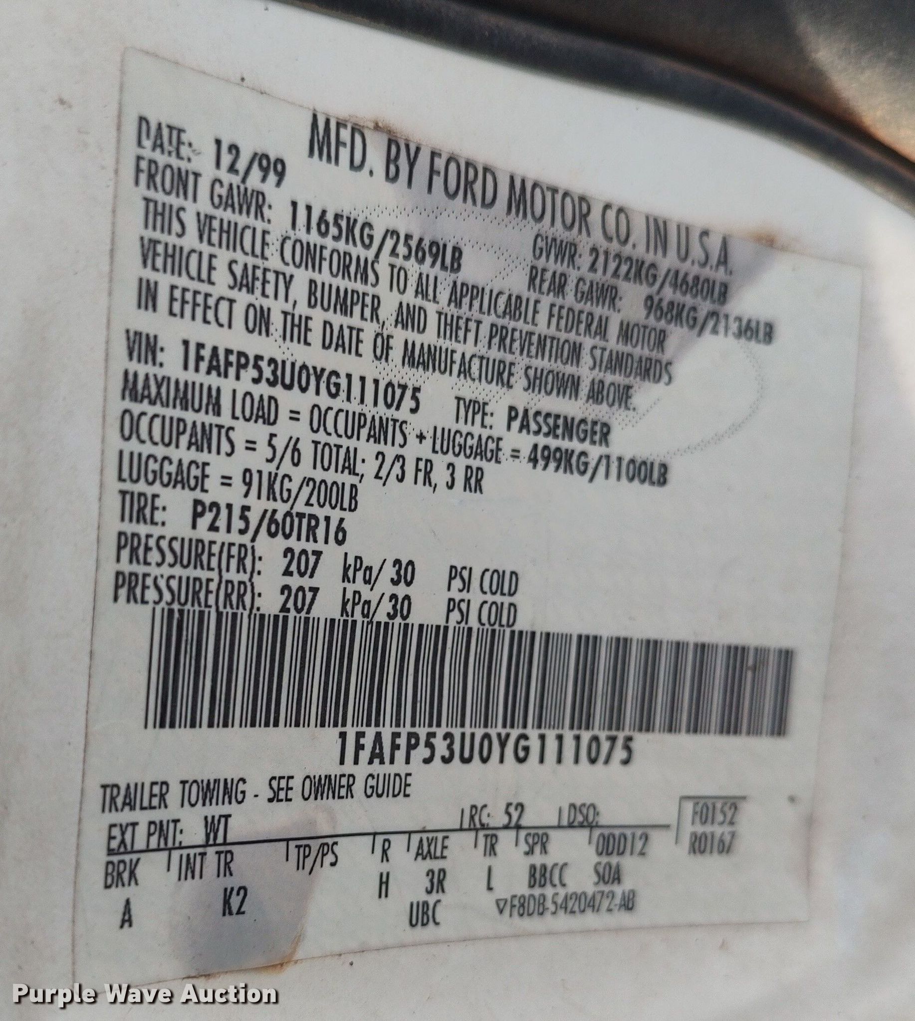 Purple Wave is selling a used Passenger Vehicle in Oklahoma. This item is a 2000 Ford Taurus with the following: Miles: 139,665 on odometer, VIN: 1FAFP53U0YG111075
