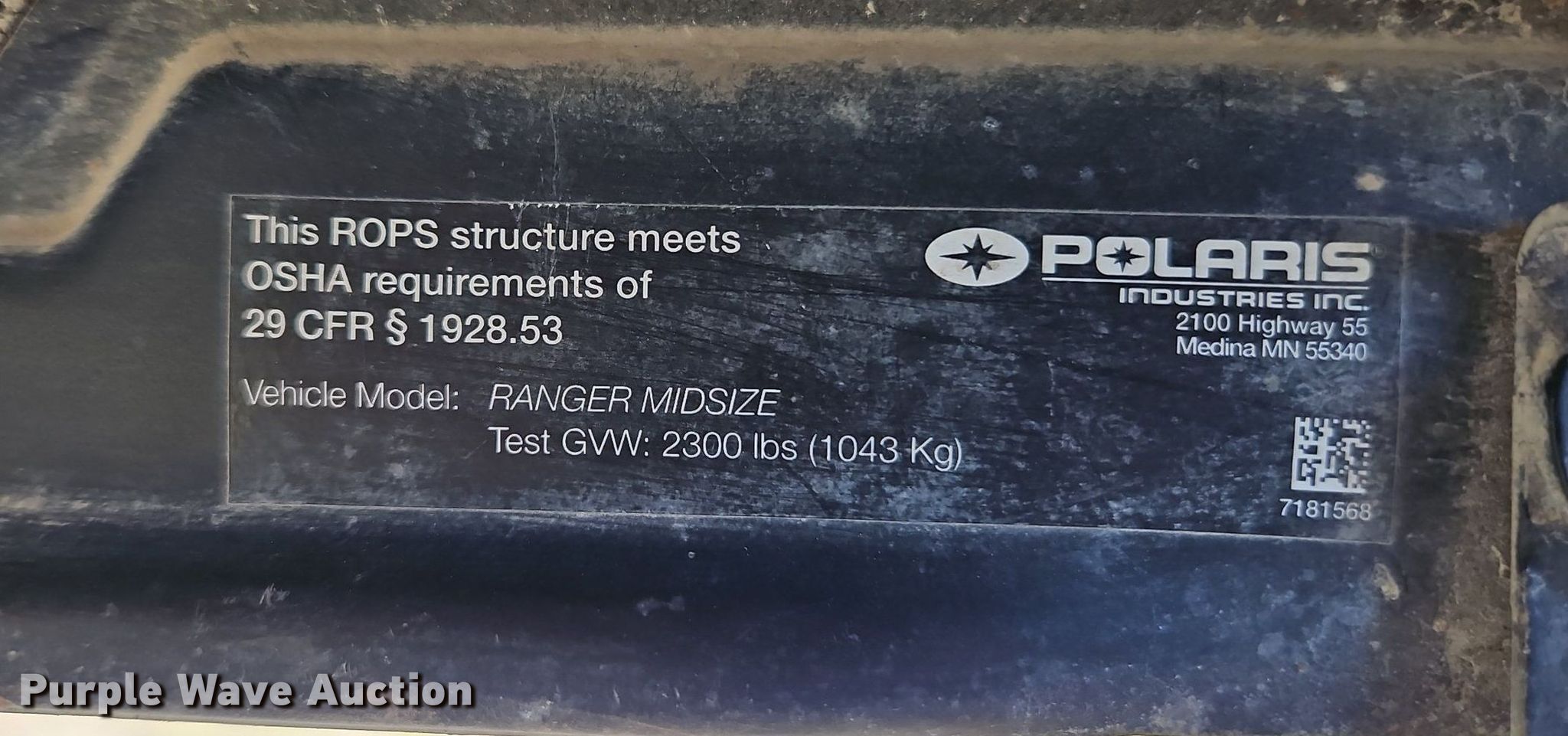 2015 Polaris Ranger 570 utility vehicle. Miles: 11,431 on odometer, Hours: 1,754 on meter, VIN: 3NSRMA574FE814335. Engine Polaris , Cylinders: 1, Fuel type: Gas. Transmission Automatic. Chassis Four wheel drive. Operators station OROPS. Features Receiver hitch, Dump bed 32.5" L x 46.5" W, Dump bed type: Manual. Tires Front: 25x8-12, Rear: 25x10-12. Kansas non-highway title. Title distribution may be delayed up to 14 days from verification of funds. Moran, KS 66755