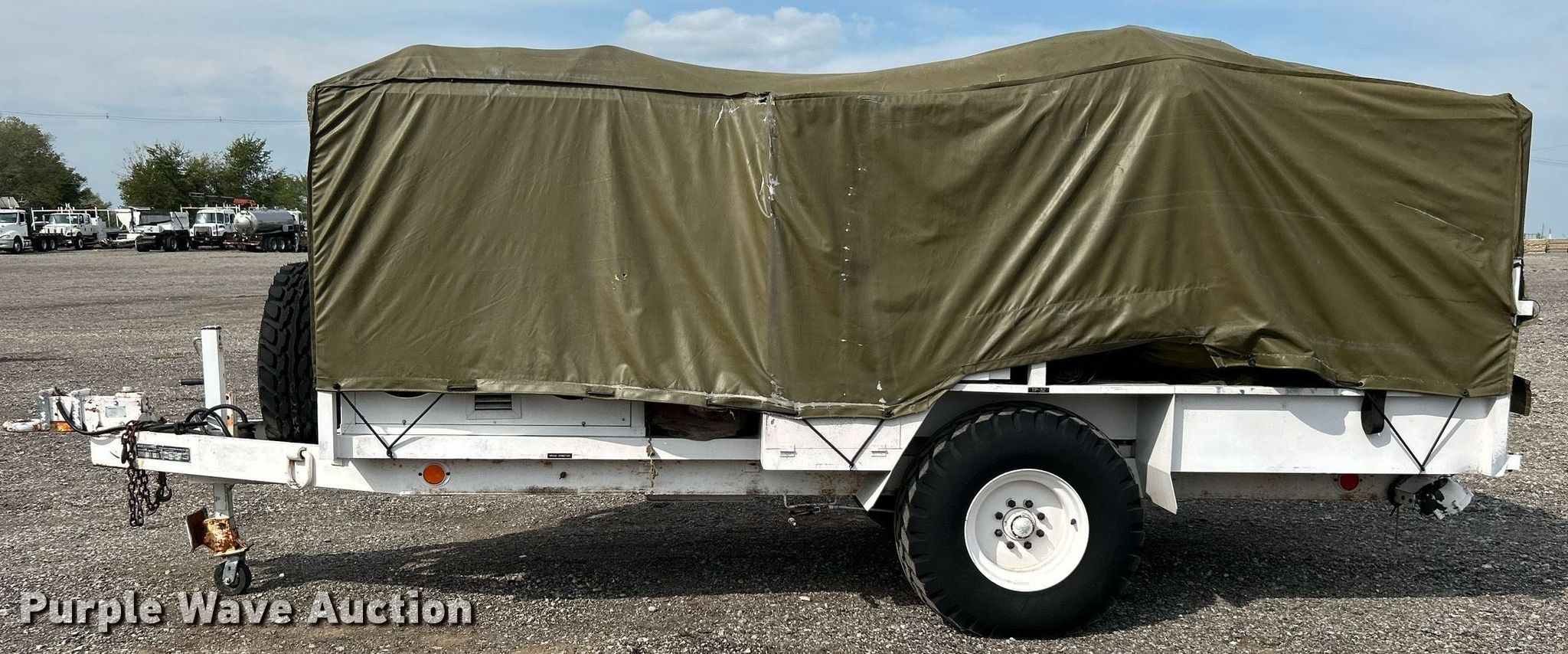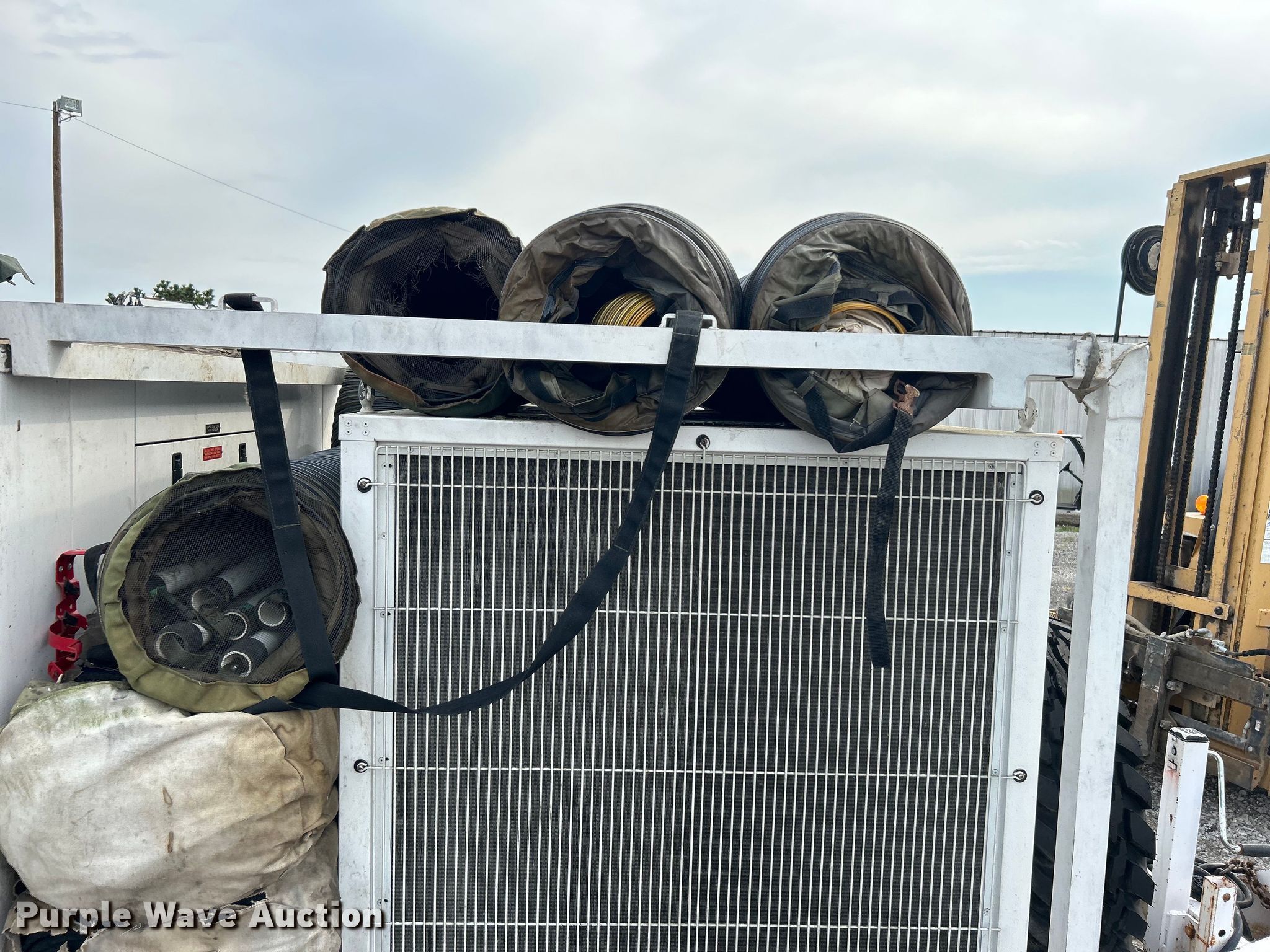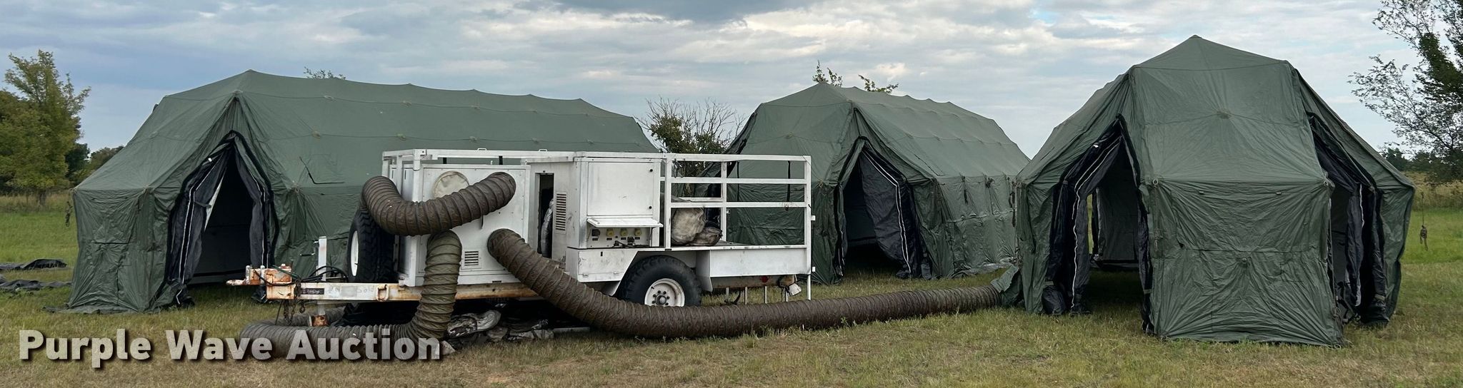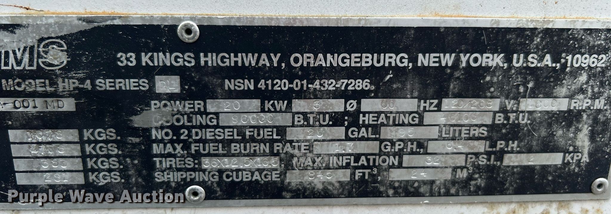 DHS Systems HP-4 DRASH trailer. Hours: 619 on meter, VIN: 196204A001MD. Dimensions Overall: 19' L x 85" W, Deck: 14' L x 81" W, Side height: 36". Features Deck type: Steel, Generator Volts: 120/208, Phase: Three, kW: 20, AC BTU cooling: 36,000, BTU heating: 3.5 kW. Chassis Hitch: Pintle, Landing gear: Single, Brakes: Electric, GVWR: 5,970 lbs. Tires Size: 36x12.50-16.5LT. Notes Contents included. This is worksite support equipment and will not come with a title. Transfer of ownership documentation will be a bill of sale. 15107 North 137th East Avenue. Collinsville, OK 74021