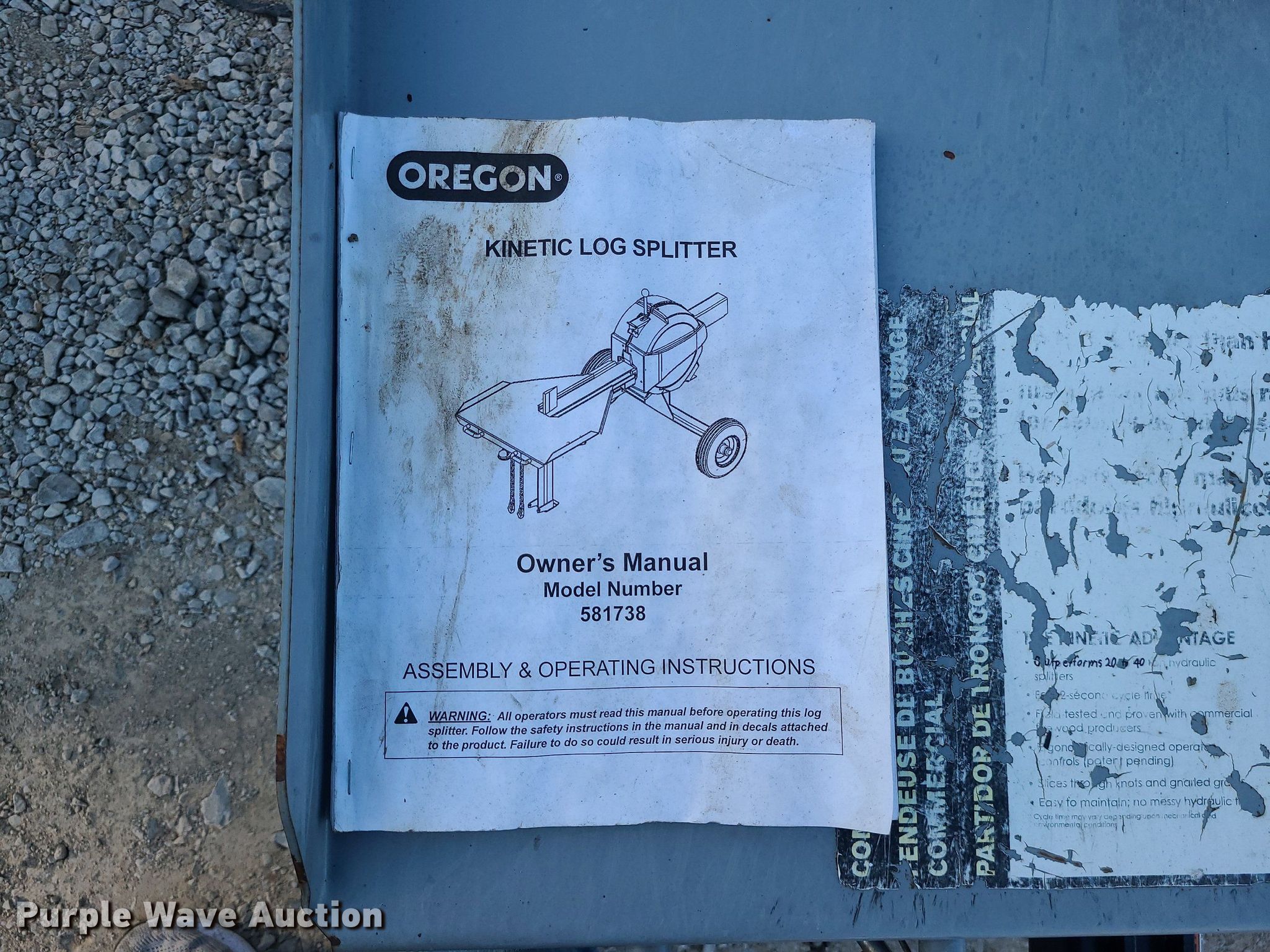 Oregon 581738 log splitter. Serial: 1334061. Dimension 102" L x 49" W. Engine Kohler 3000 Series, Displacement: 196, Cylinders: 1, Fuel type: Gas, HP: 6.5. Features Cycle time: 2 seconds, Maximum log length: 24", 2" ball hitch. Tires Size: 4.80-8. Greenscapes Lawn and Garden, LLC. 866 NW MO-13. Warrensburg, MO 64093