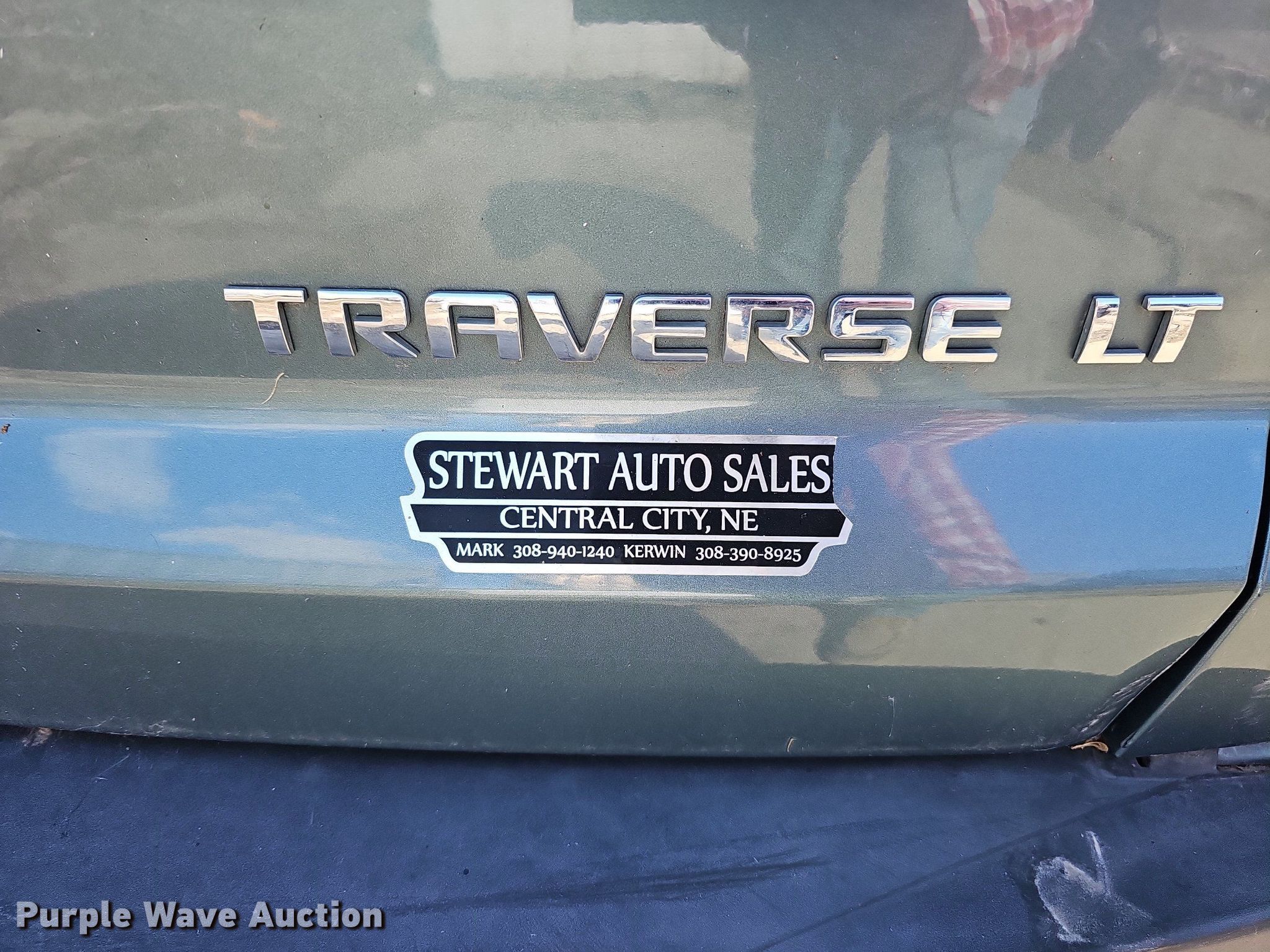 2009 Chevrolet Traverse LT SUV. Miles: 131,827 on odometer, VIN: 1GNER23D89S119350. Engine Displacement: 3.6L V6 DOHC, Cylinders: 6, Fuel type: Gas. Transmission Automatic. Interior AC, Heat, Seat: Power driver, Power windows, Power locks, Cruise control. Tires Size: P255/55R20. Notes Dash warning indicator: Check engine, Brake, Non-operational unit. Nebraska title. Title distribution may be delayed up to 14 days from verification of funds. LTA Towing LLC. 516 12th Street. Aurora, NE 68818