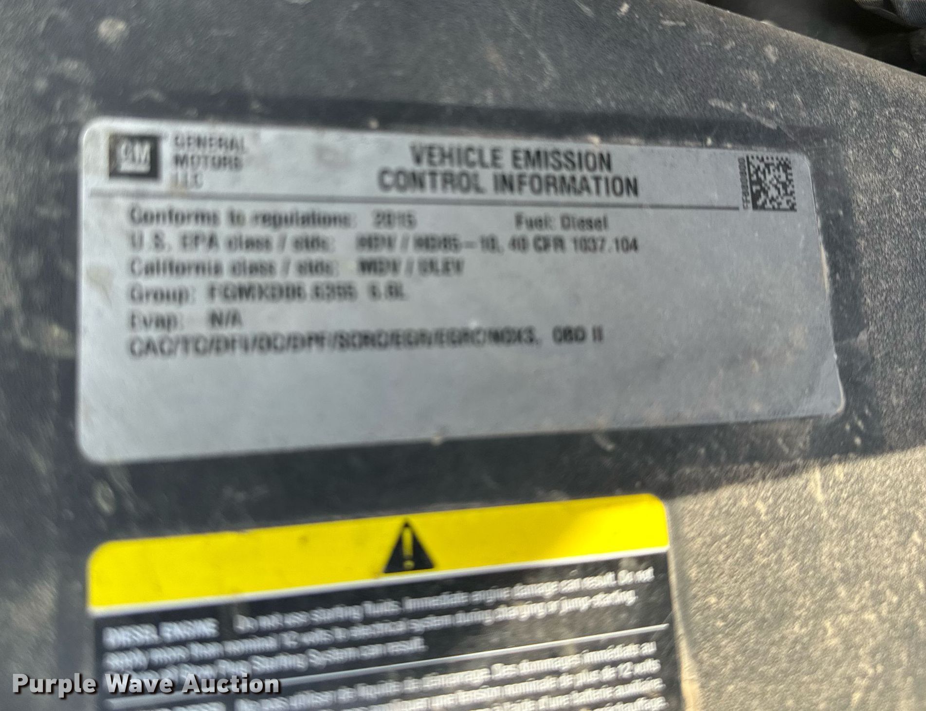 2015 Chevrolet Silverado 2500 Crew Cab pickup truck. Miles: 283,590 on odometer, Miles or hours may vary, unit still in use, VIN: 1GC1KWE82FF680800. Engine Displacement: 6.6L V8 OHV, Cylinders: 8, Fuel type: Diesel. Transmission Automatic, Four wheel drive. Interior AC, Heat, Seat: Heated, Cooled, Power driver, Power passenger, Power windows, Power locks, Cruise control. Tires Size: LT305/55R20. Notes Dash warning indicator: TPMS, Windshield chipped or cracked, Engine issues , Non-operational unit. Minnesota Title. Title distribution may be delayed up to 14 days from verification of funds. JCF Builders, LLC. 22381 County Highway 61. Pine City, MN 55063