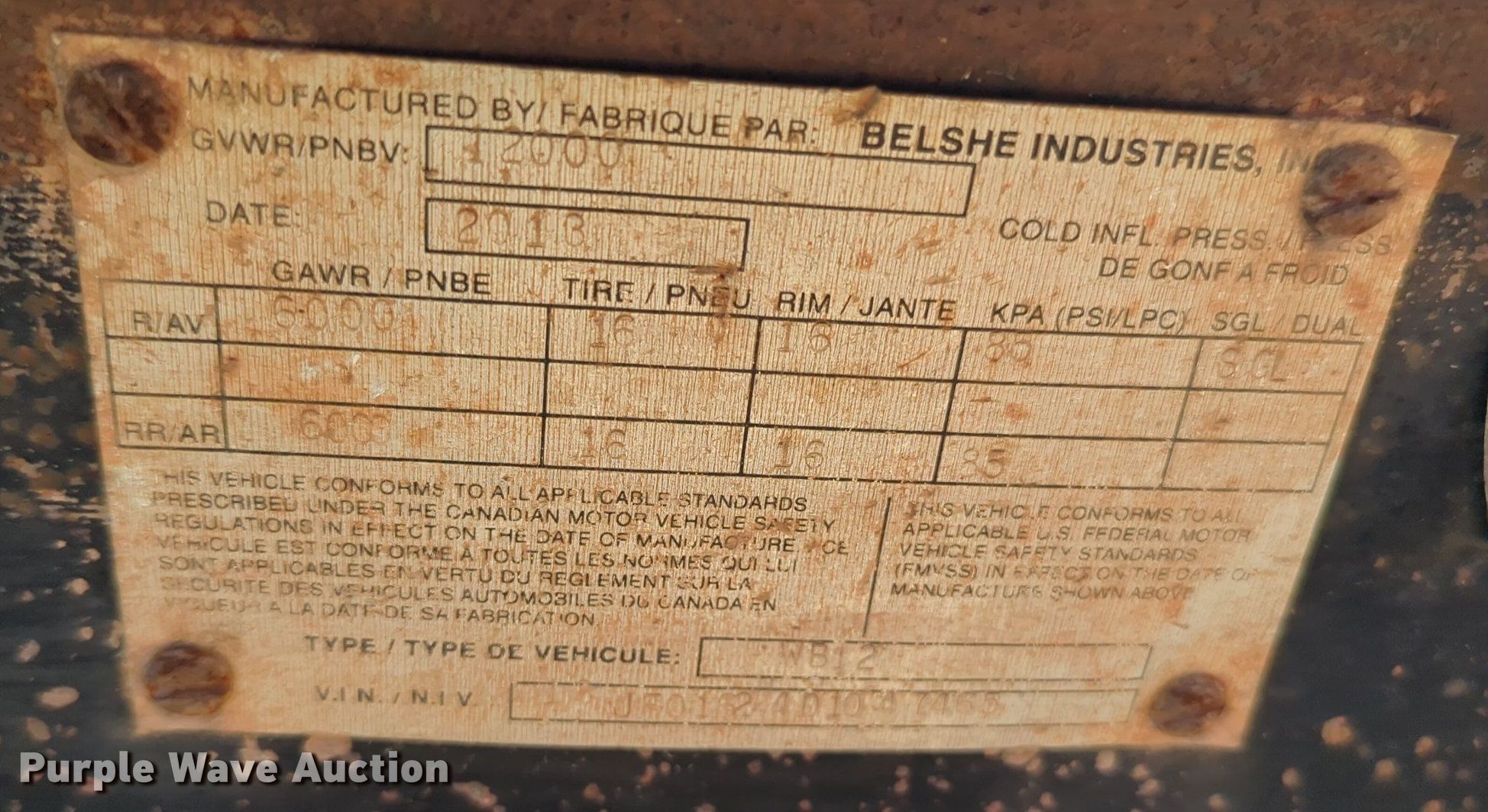 Purple Wave is selling a used Equip. Trailer in Oklahoma. This item is a 2013 Belshe WB12 equipment trailer with the following: VIN: 16JF01624D1047465