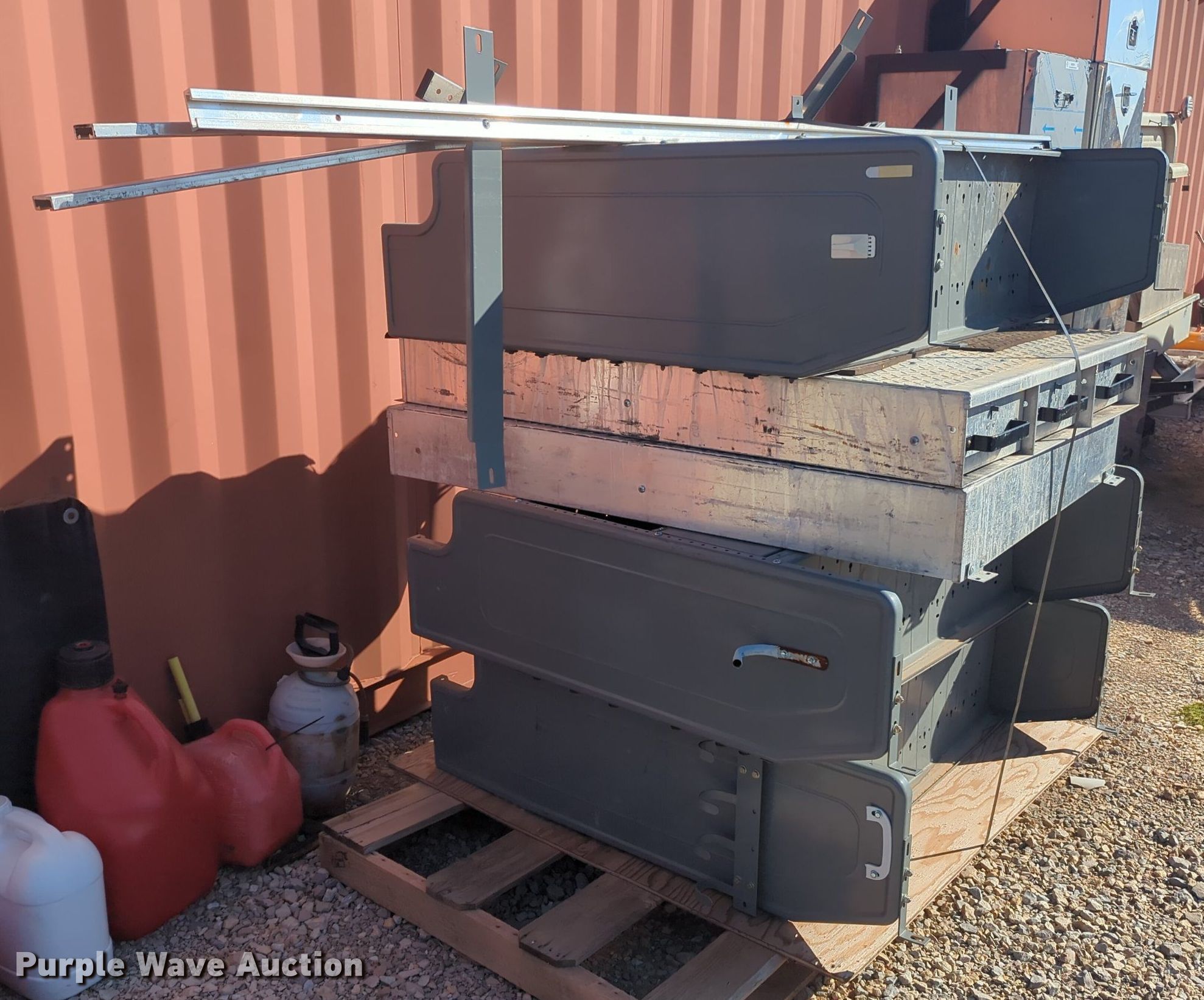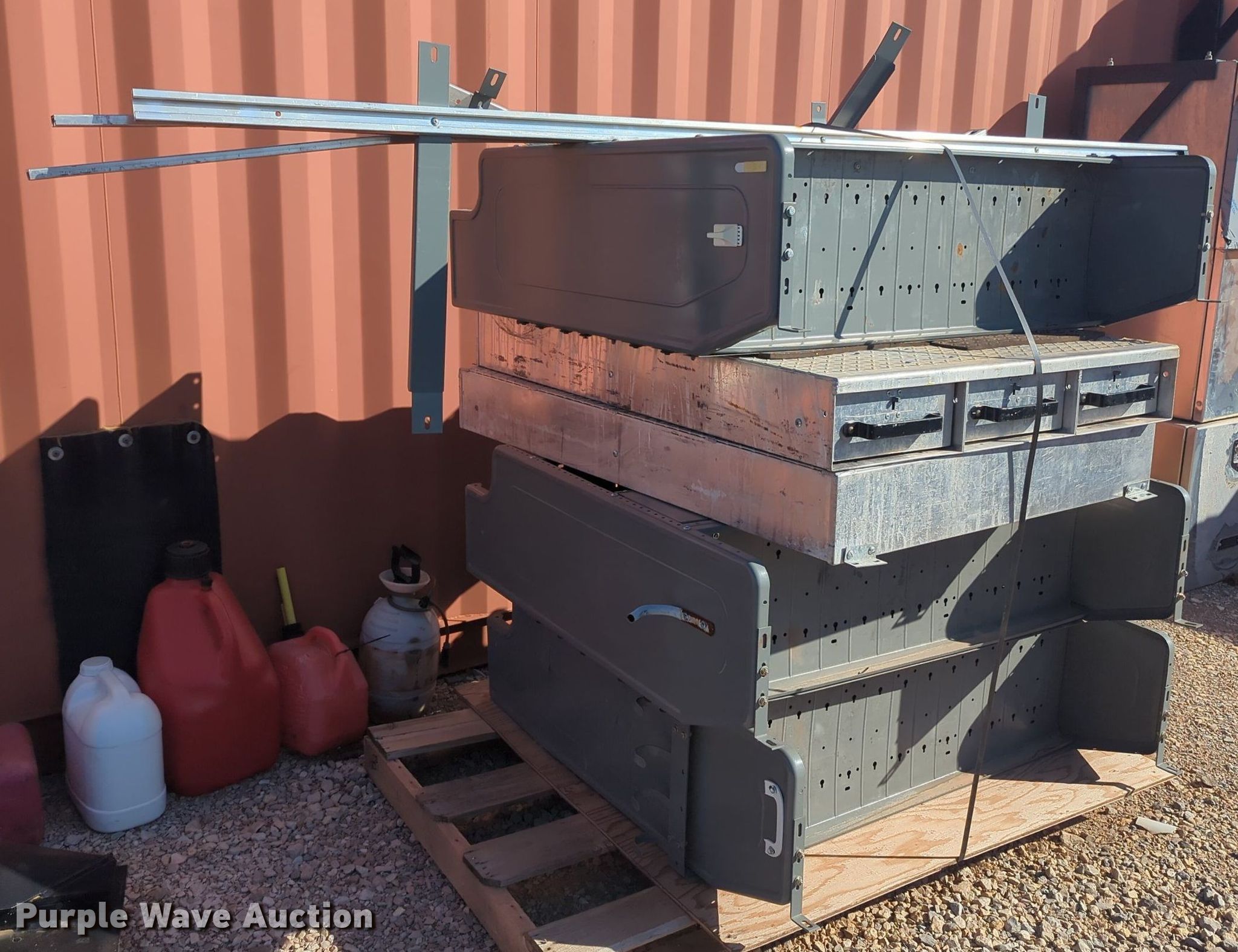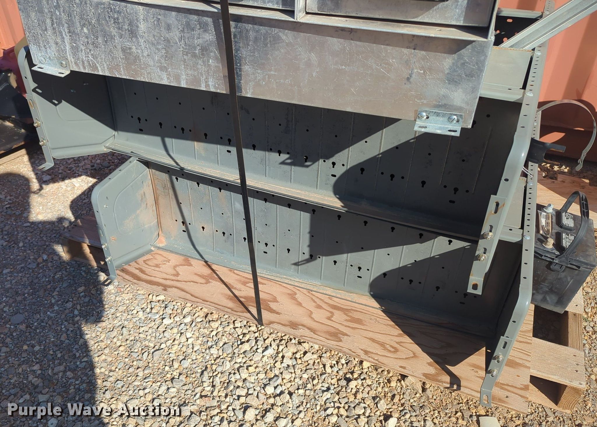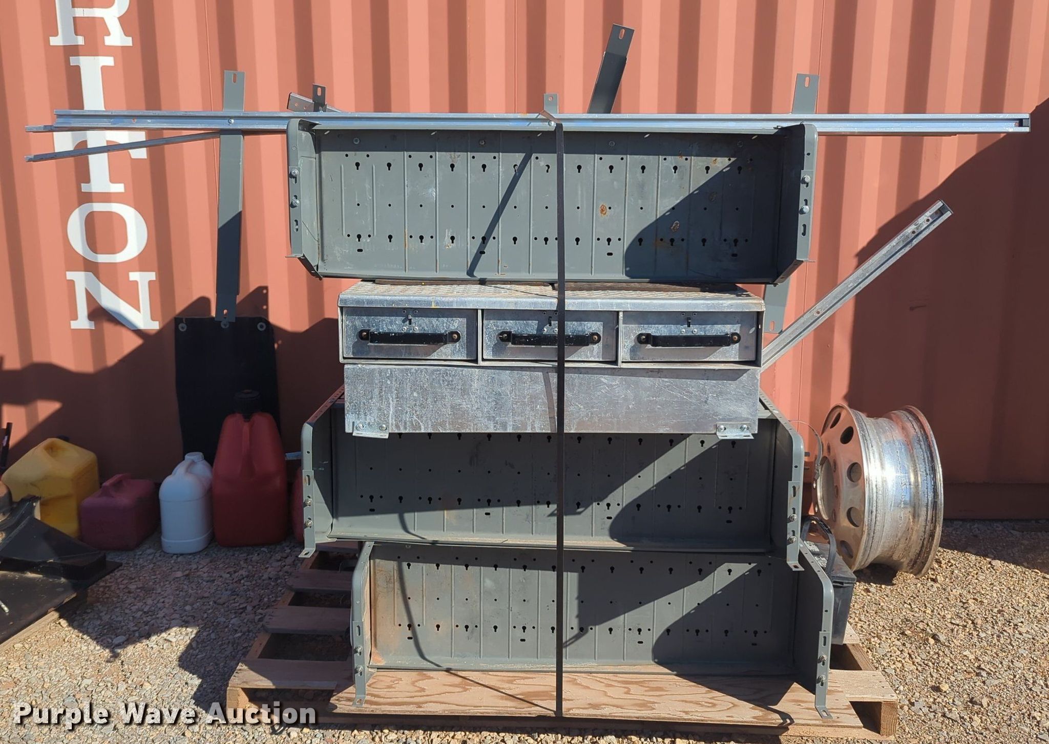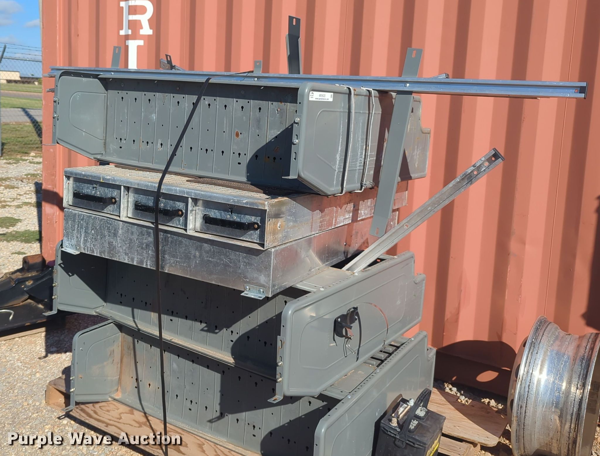 Purple Wave is selling a used Automotive Parts or Acces. in Oklahoma. This item is a Automotive parts with the following: (2) toolboxes, (3) shelves