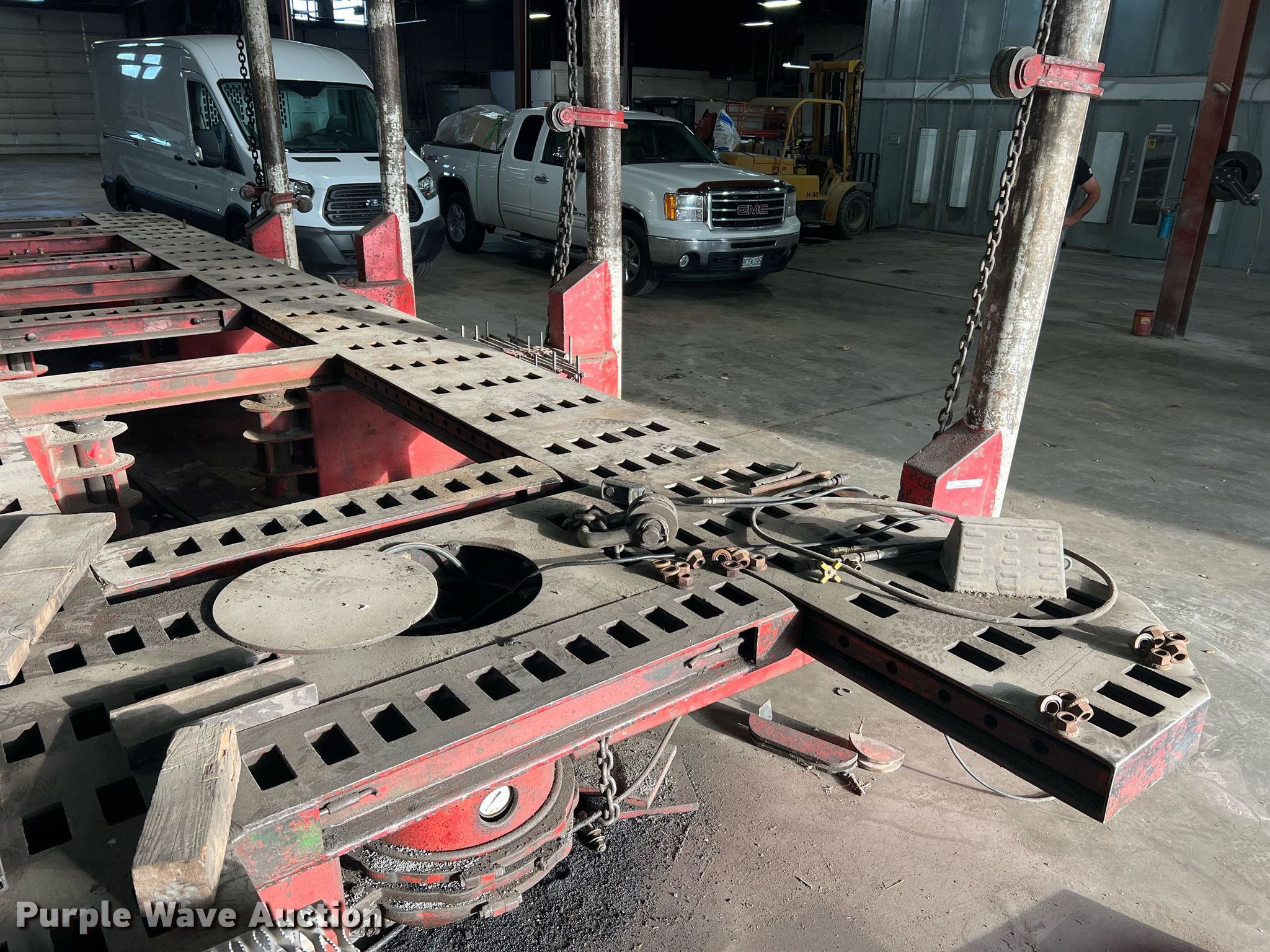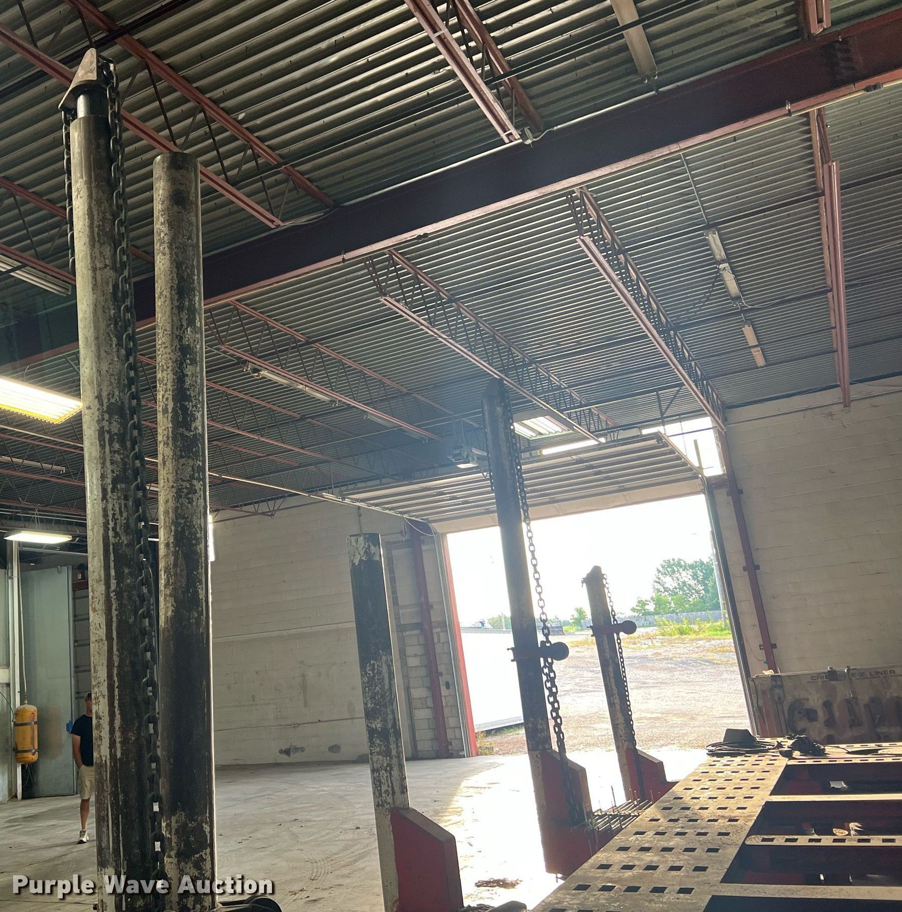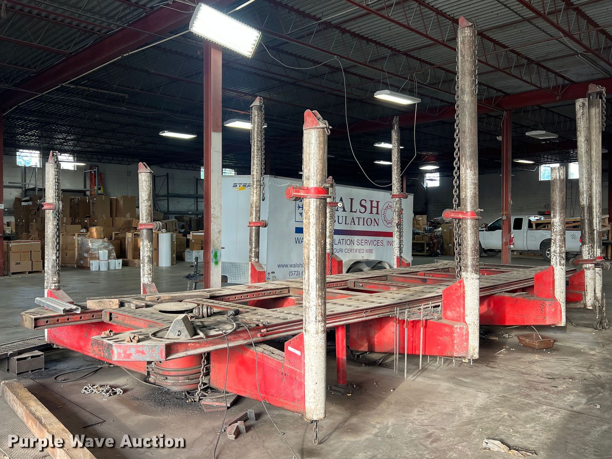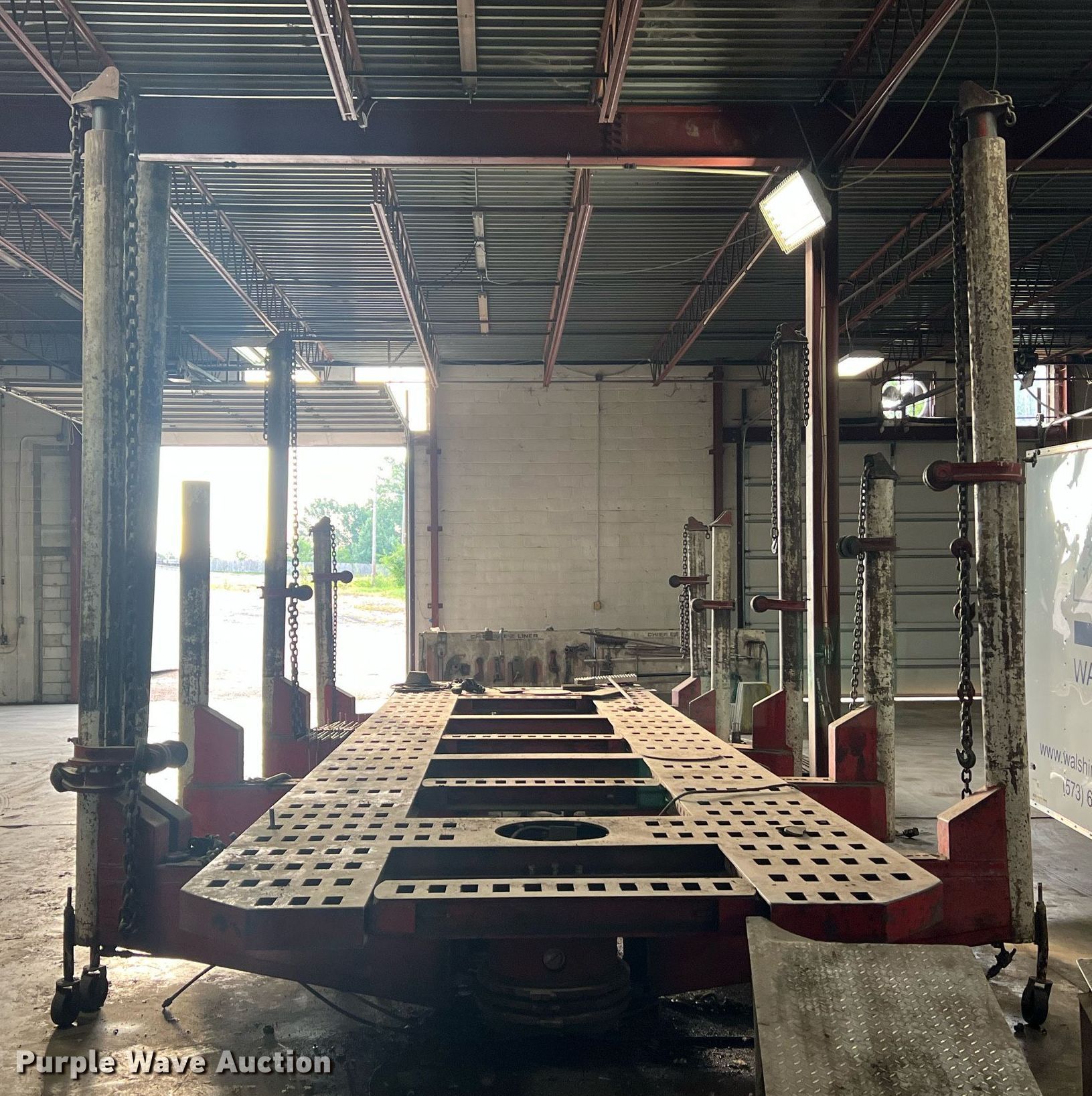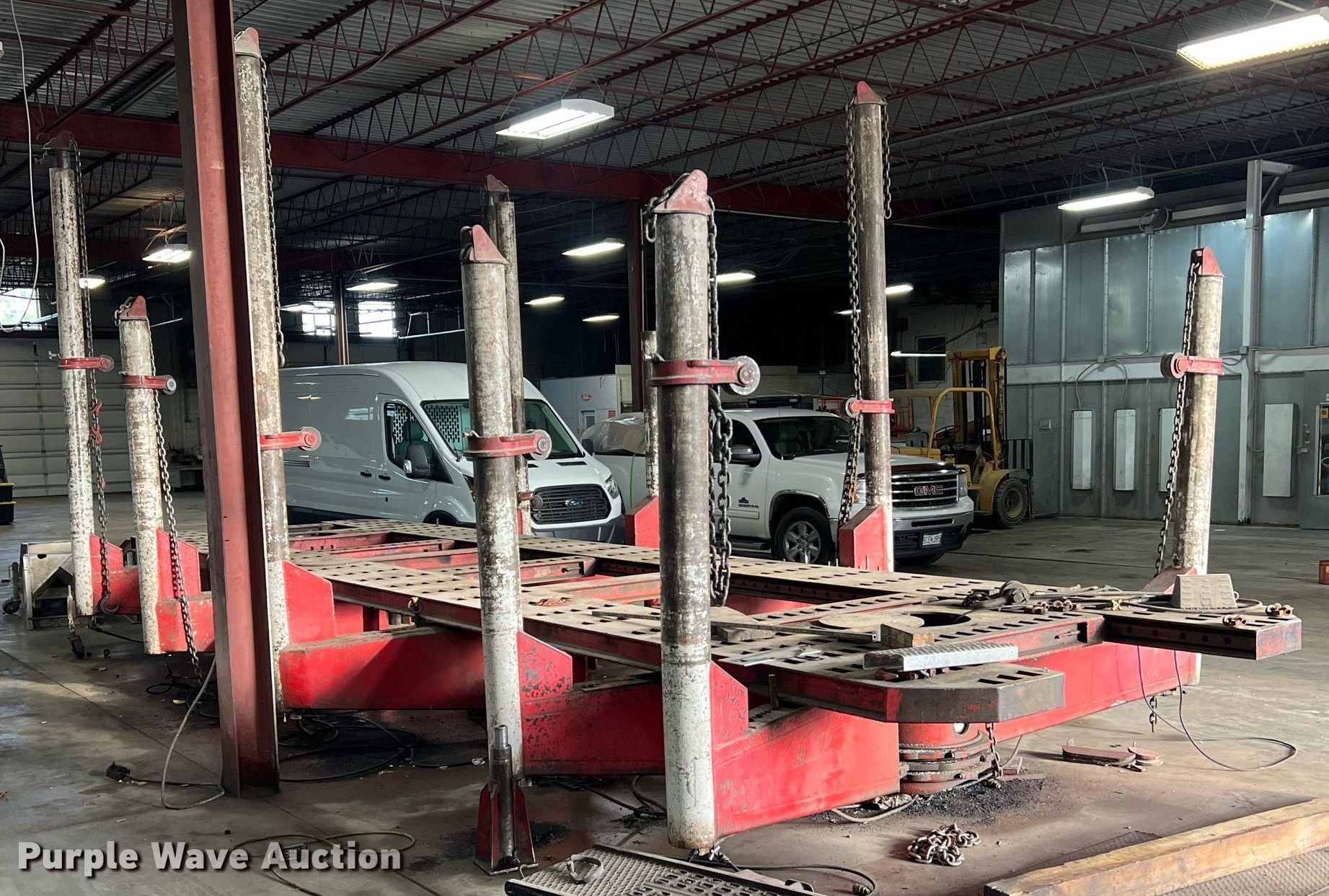 Chief EZ-Liner frame straightener. Approx. 31'L x 13'9"W overall, Towers: 10, Pulling capacity: 100 tons. 8267 Old Highway 54. New Bloomfield, MO 65063