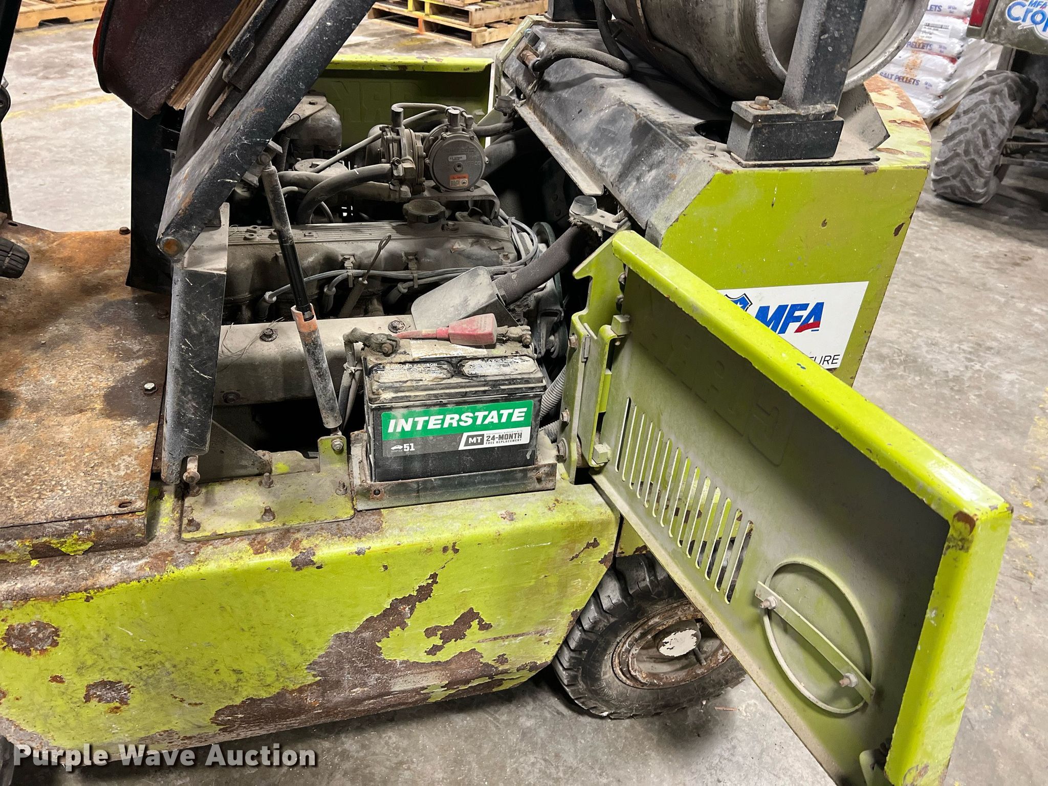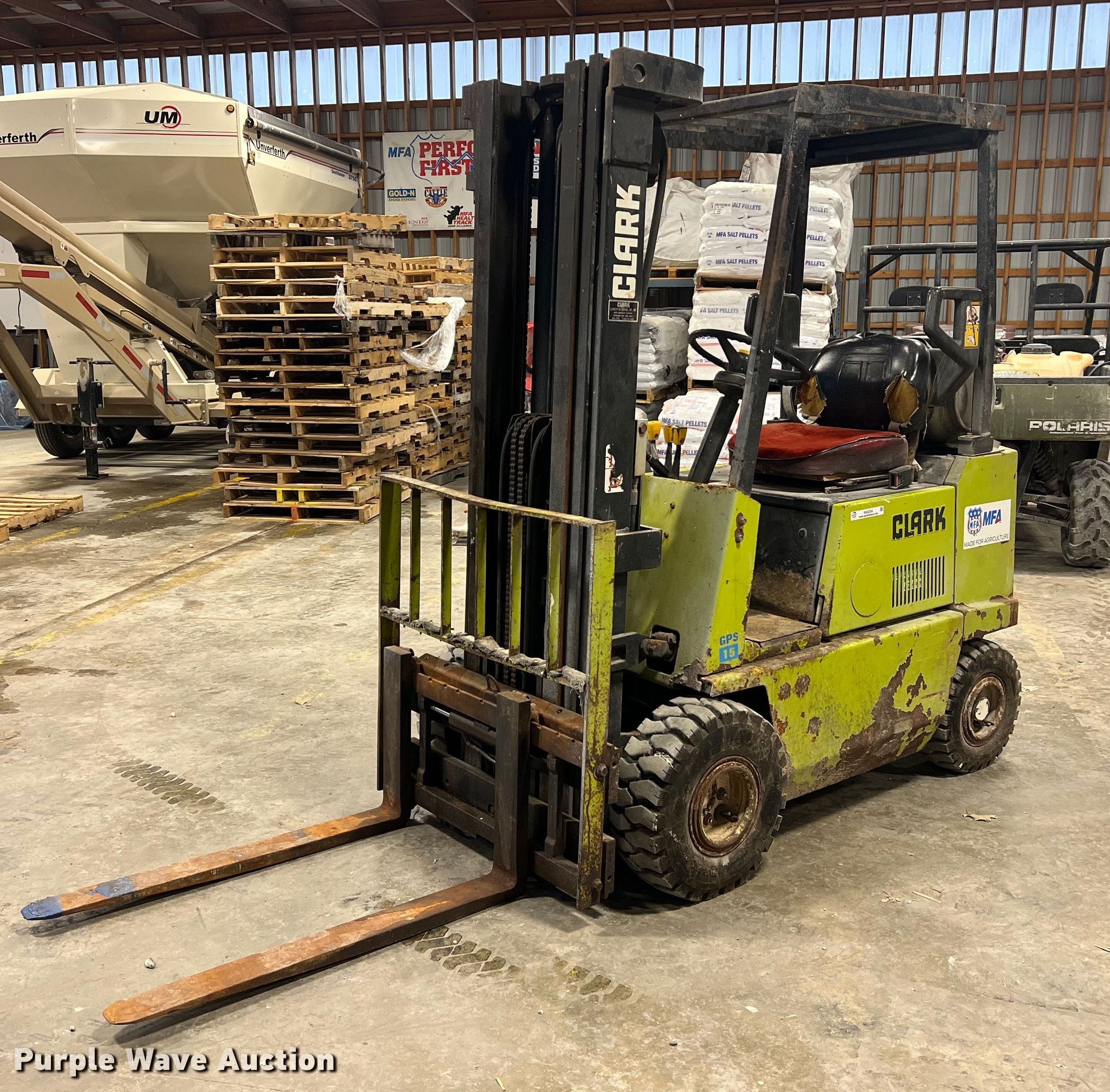 1994 Clark GPS15 forklift. Hours: 5,876 on meter, Serial: GP127-0208-9240K0F. Engine Cylinders: 4, Fuel type: LPG LP bottle: Not included. Transmission Hydrostatic. Operators station OROPS. Features Maximum lift capacity: 3,000 lbs, Maximum lift height: 188", Mast stages: 3, Side shift, Mast tilt, Fork length: 42". Tires Front: 21X8-9, Rear: 18X7-8, Foam filled. Notes Exhaust issues, leaks. MFA Ag Inc.. 202 North Jefferson Street. Centralia, MO 65240