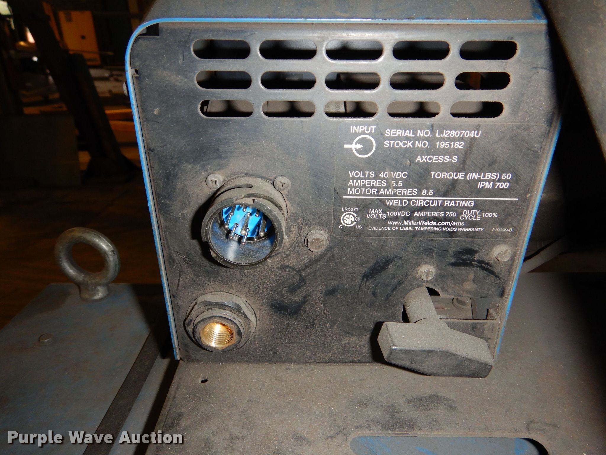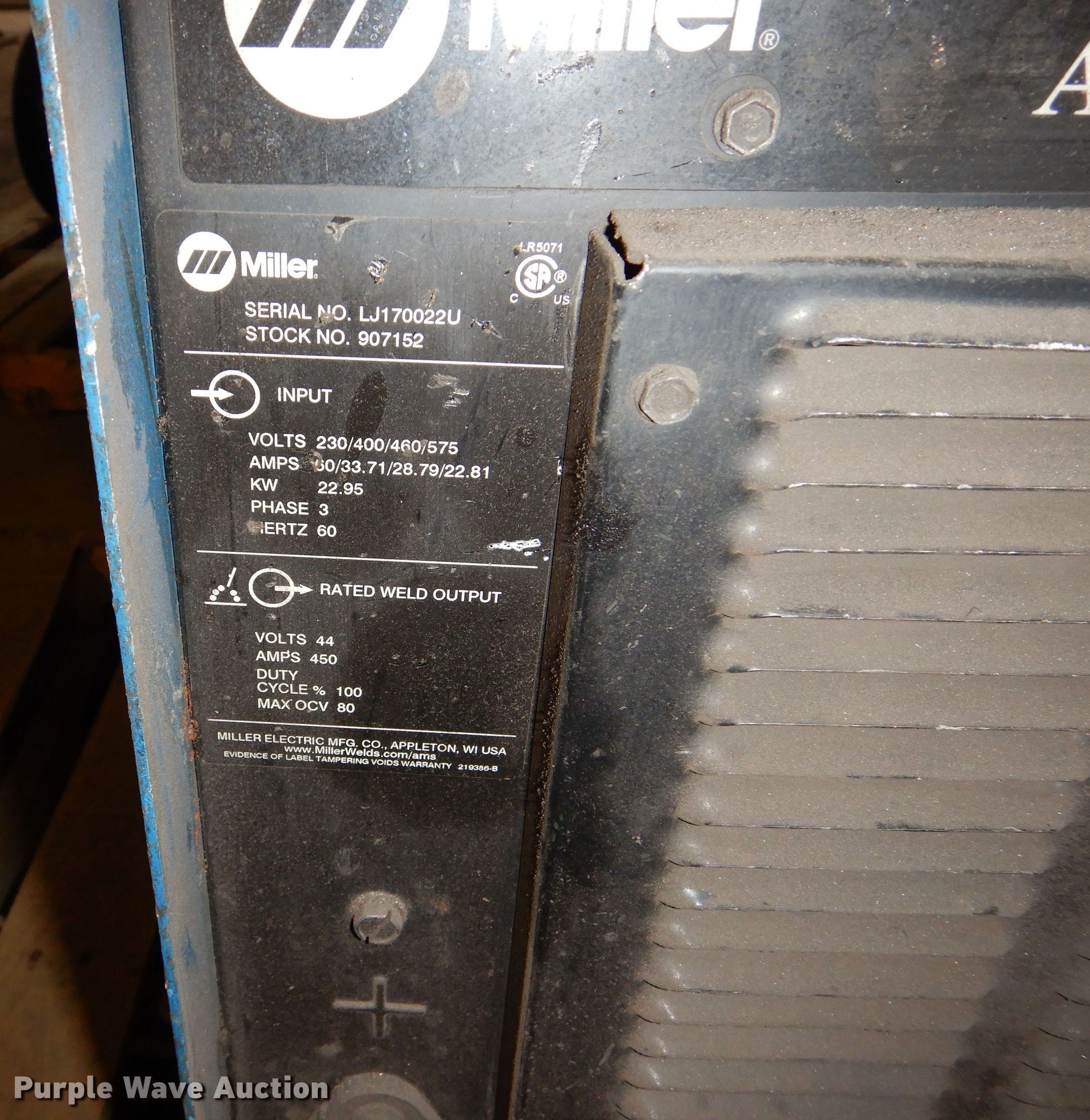 Miller Axcess 450 welder. Serial: LJ170022U. Electric Motor Volts: 230/400/460/575, Phase: Three. Features Miller Axcess wire feeder. Enterprise, KS 67441