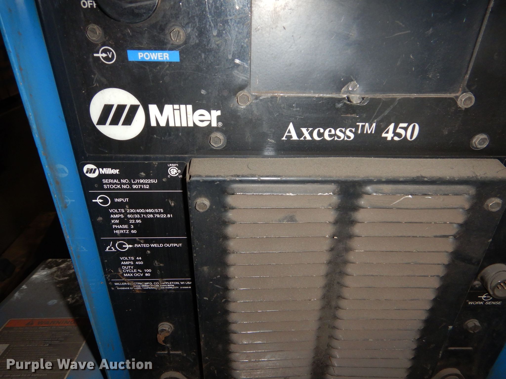 Miller Axcess 450 welder. Serial: LJ190225U. Electric Motor Volts: 230/400/460/575, Phase: Three. Features Miller Axcess wire feeder. Enterprise, KS 67441