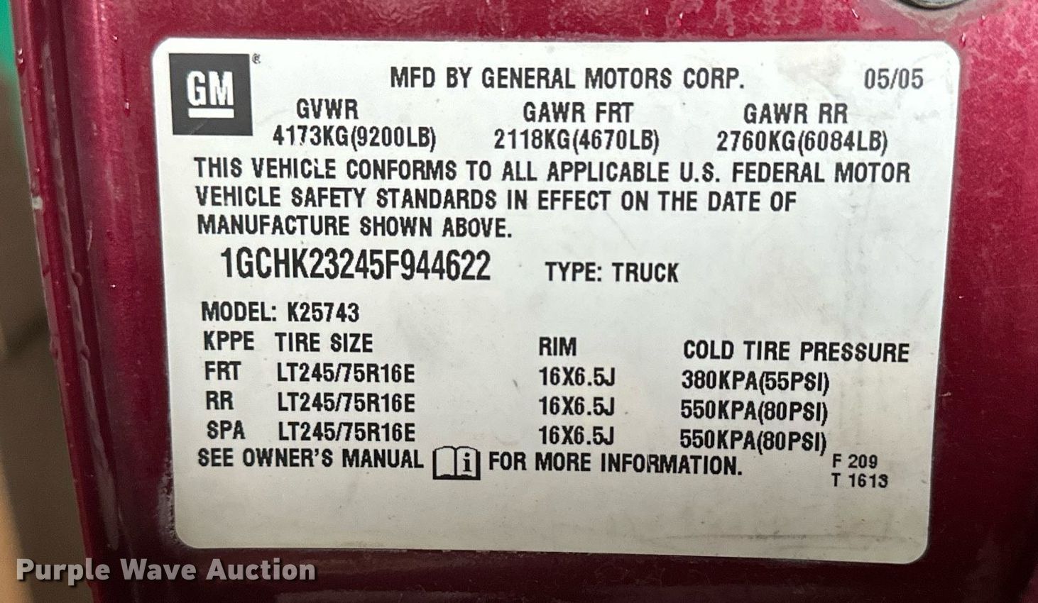 2005 Chevrolet Silverado 2500HD Crew Cab pickup truck. Miles: 239,628 on odometer, VIN: 1GCHK23245F944622. Engine Displacement: 6.6L V8 OHV, Cylinders: 8, Fuel type: Diesel. Transmission Automatic, Four wheel drive. Interior AC, Heat, Seat: Power driver, Power windows, Power locks, Cruise control. Tires Size: 265/75R16. Notes Dash warning indicator: Check engine, Windshield chipped or cracked. Southwind Bank. Russell, KS 67665