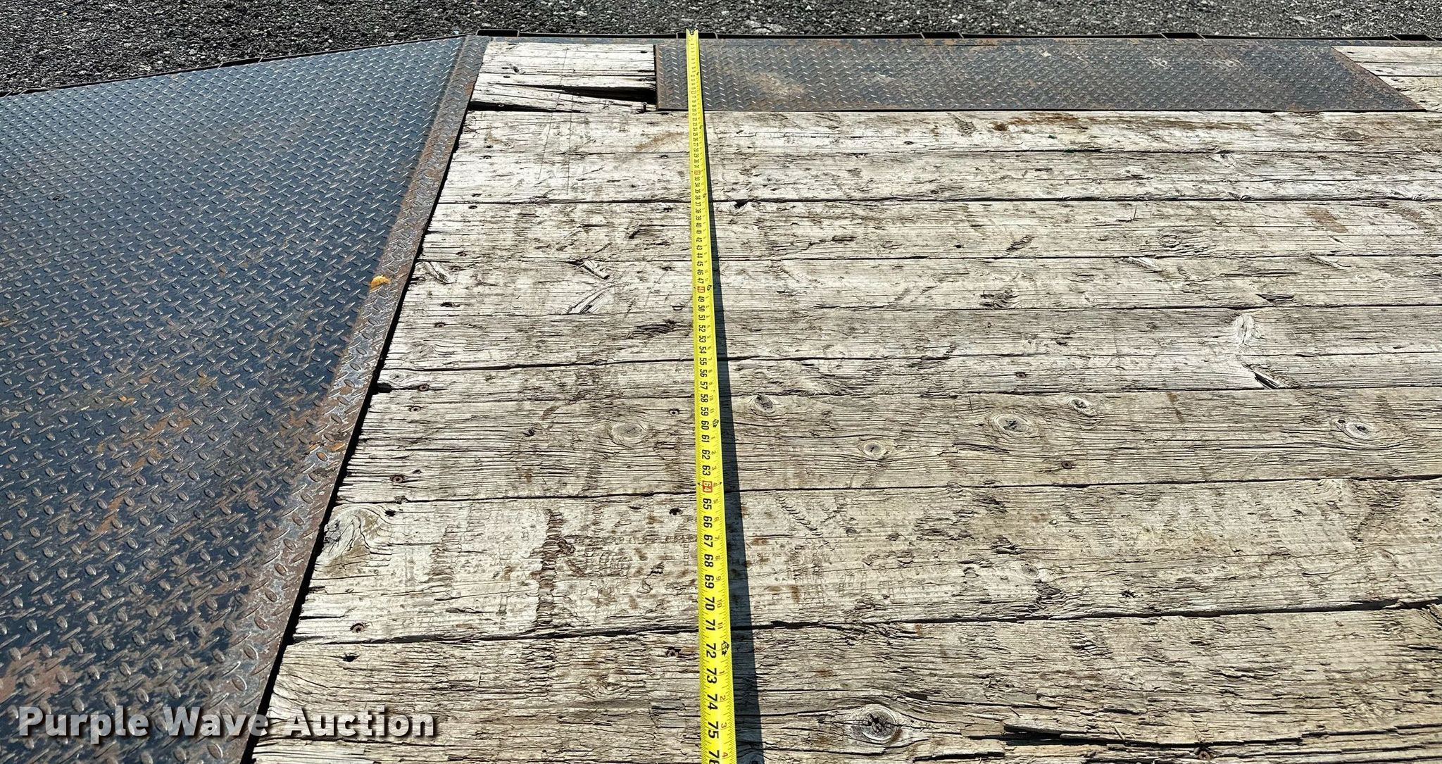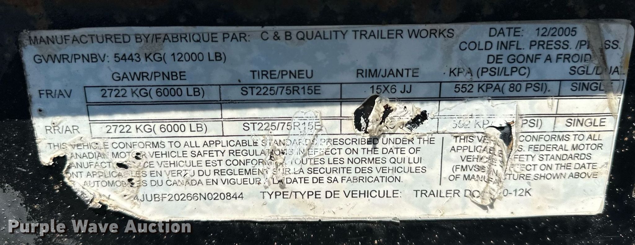 2006 C&B Quality Trailer Works equipment trailer. Dimensions. Overall: 24' L x 100" W, Deck: 15' 8" L x 96" W, Tail length: 4'. Features Deck type: Wood. Chassis Hitch: Pintle, Landing gear: Single, Suspension: Spring, Brakes: Electric, Axles: Tandem, GVWR: 12,000 lbs, GAWR: 6,000 lbs. Tires Steel wheels, Size: 225/75R15. Oklahoma title. Title distribution may be delayed up to 14 days from verification of funds. 15107 North 137th East Avenue. Collinsville, OK 74021