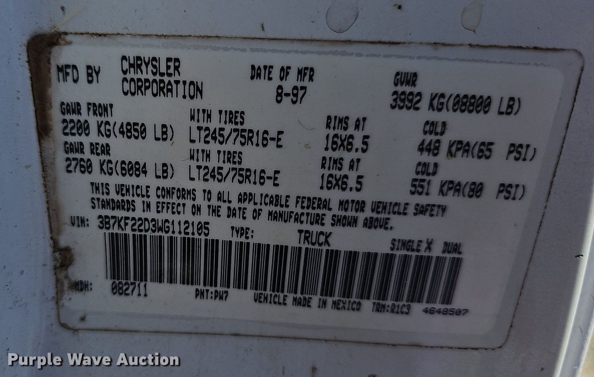 Purple Wave is selling a used 3/4 or 1 Ton Pickup or Van in Missouri. This item is a 1998 Dodge 2500 Club Cab pickup truck with the following: Miles: 225,139 on odometer, VIN: 3B7KF22D3WG112105