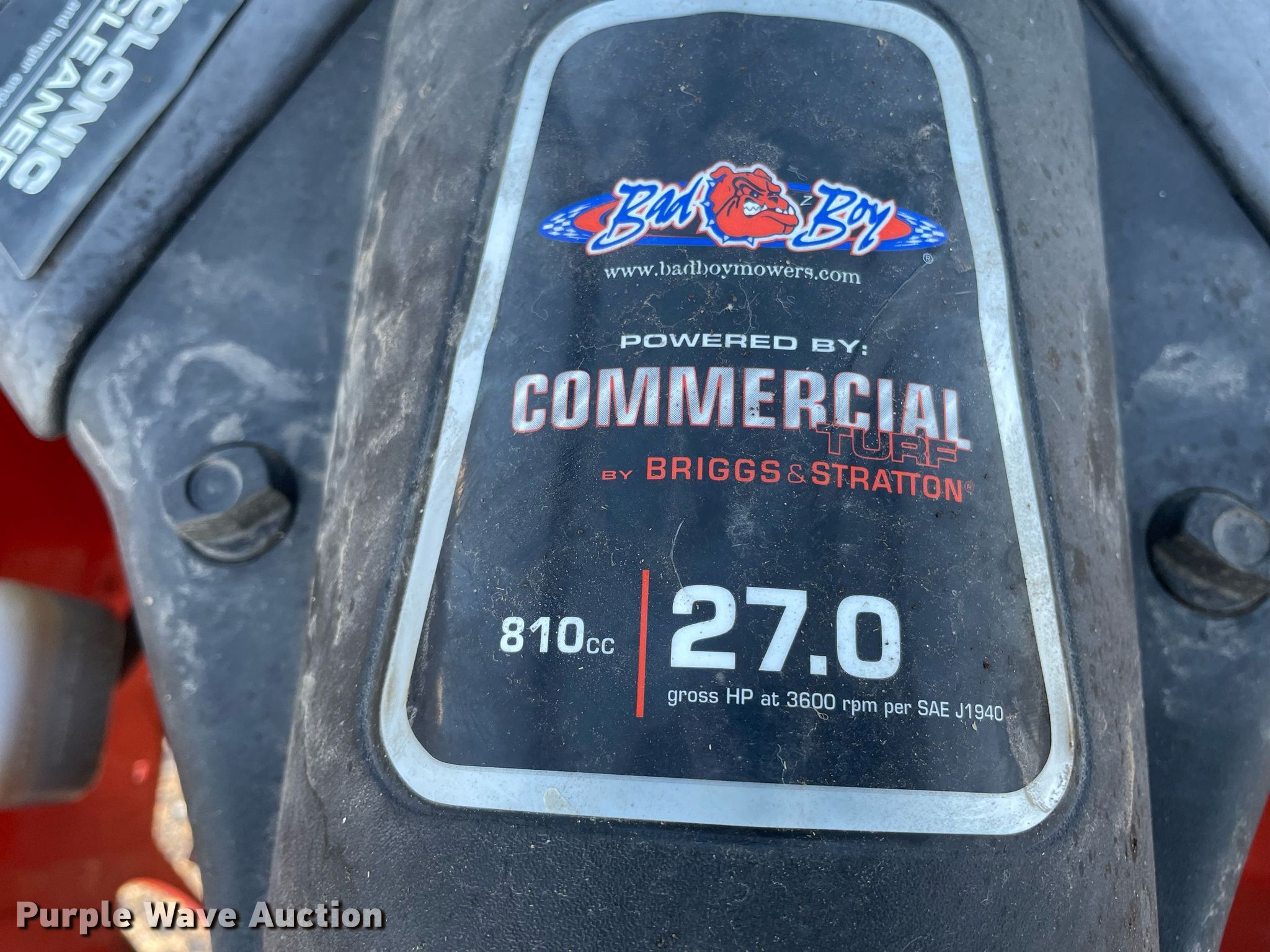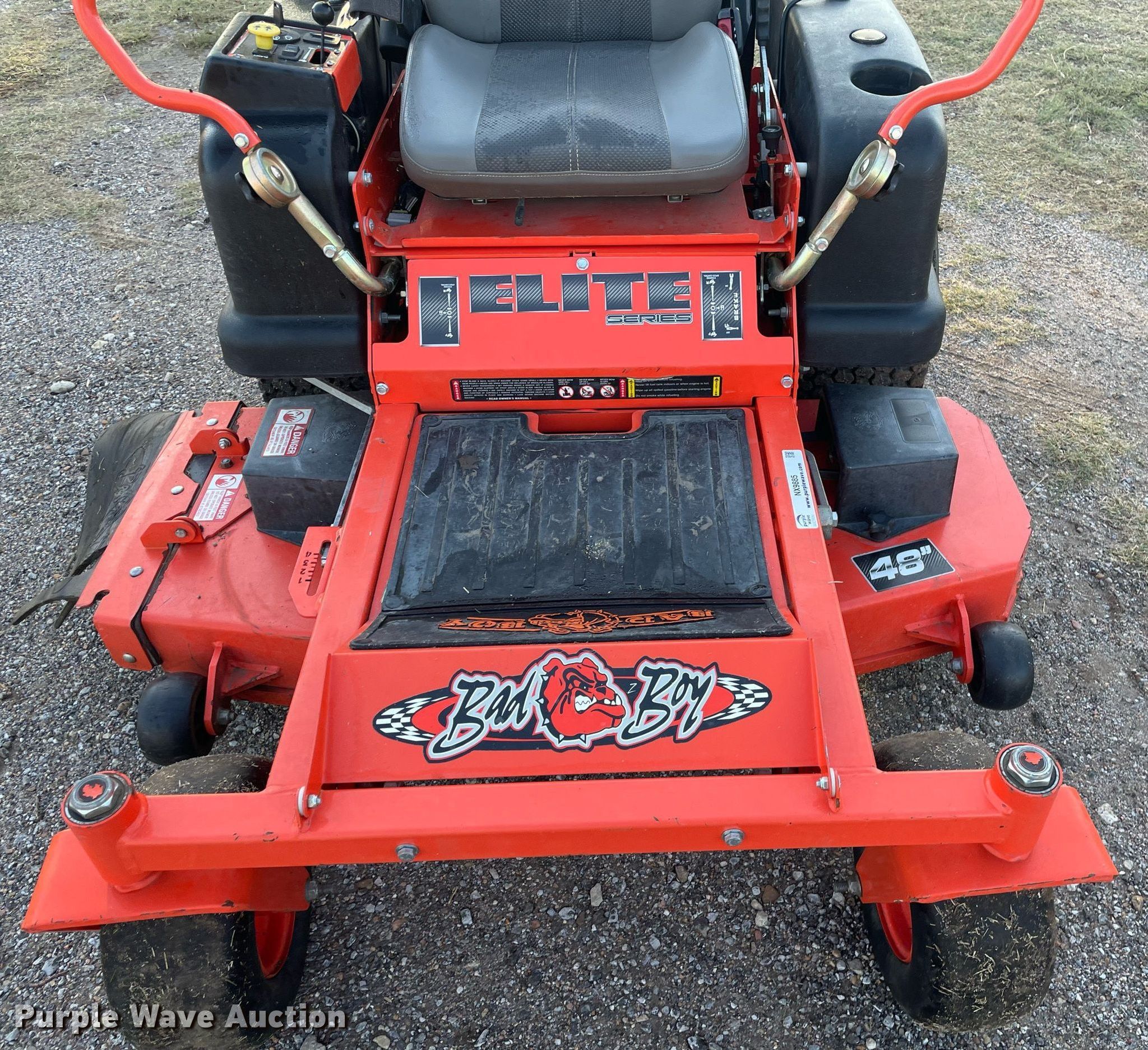 Bad Boy Elite ZTR lawn mower. Hours: 214 on meter, Cutting width: 48", Serial: BCE4827BS03141005. Engine Briggs & Stratton, Displacement: 810 cc, Cylinders: 2, Fuel type: Gas, HP: 27. Transmission Hydrostatic. Operators station OROPS. Tires Front: 13x6.50-6, Rear: 23x10.50-12. Pratt, KS 67124