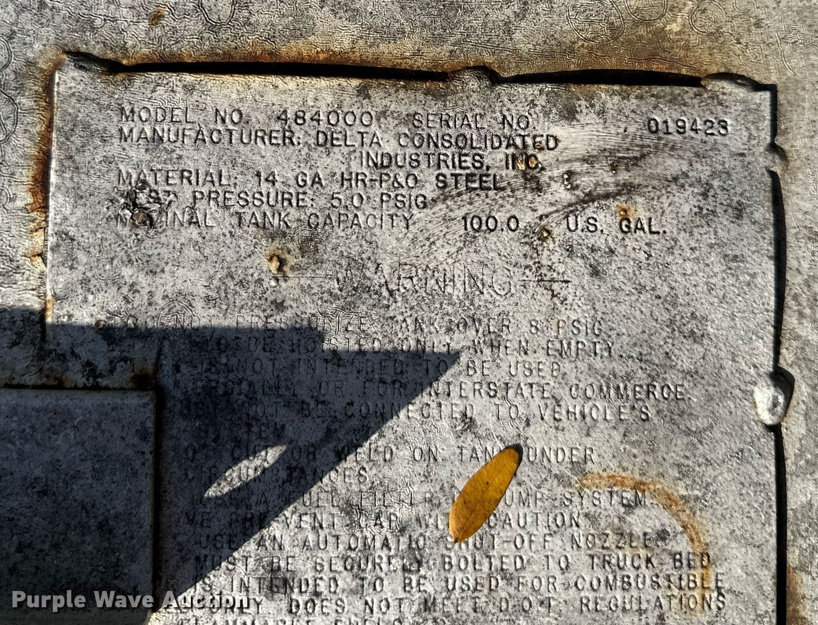 Purple Wave is selling a used Tanks in Kansas. This item is a Delta 484000 100 gallon fuel tank with the following: Serial: 019423