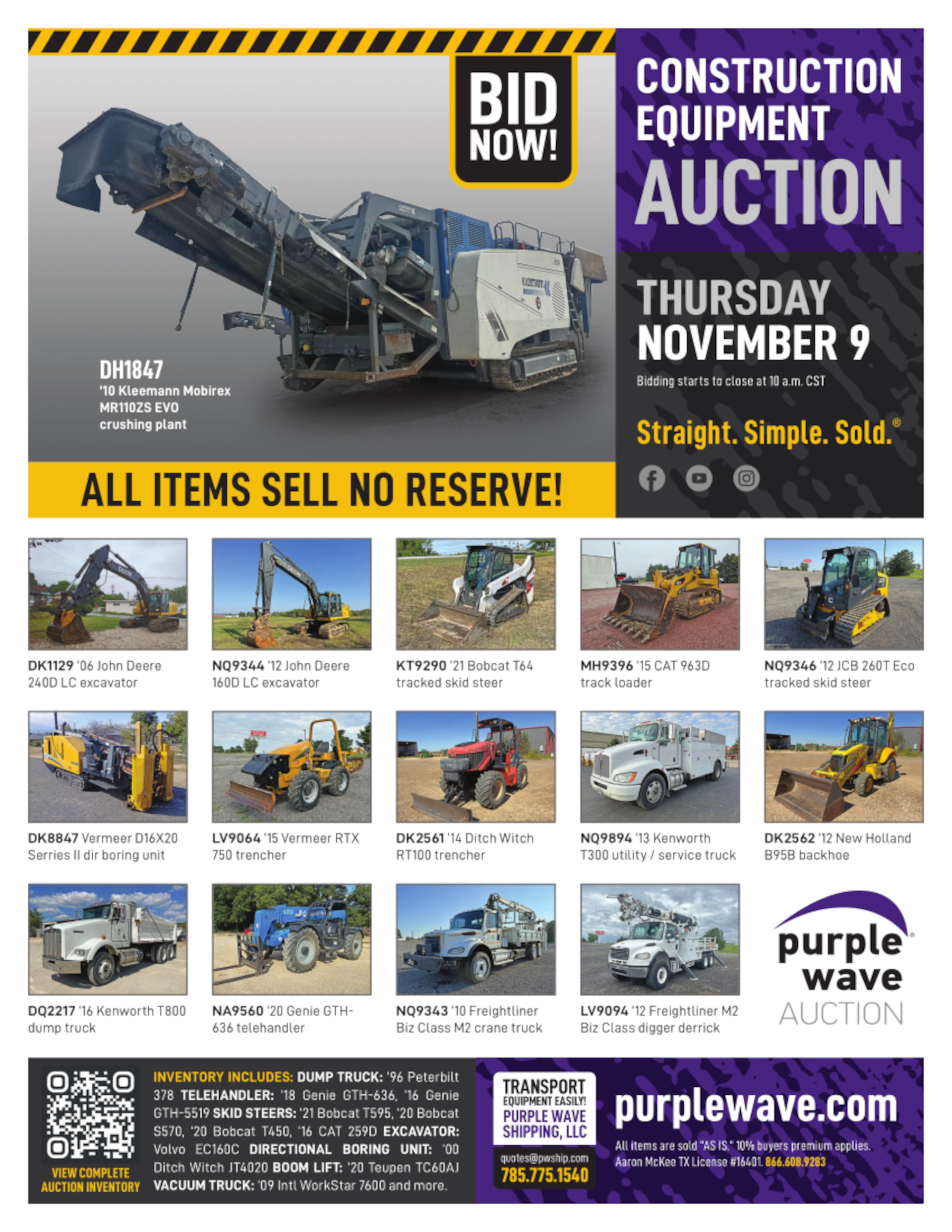 Purple Wave attempts to give its customers an industry leading experience by providing detailed equipment listings. Listings include written descriptions, photographs, location, and consignor information. Equipment descriptions are based on our direct observation and information provided by our selling customer. All information is intended to be as accurate as possible. However, we recommend customers inspect prior to bidding. Purple Wave listings are not intended to be substitutions for inspection. The details provided may differ on equipment based on information provided by the consignor. An error or omission in the listing will not change the results of the bid. It is the responsibility of the buyer to conduct any inspection and examination necessary to satisfy the buyer of all material facts before placing a bid.
