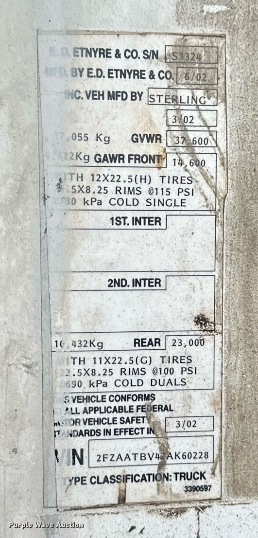 2002 Sterling L-Line oil distributor truck has sold in Topeka, Kansas for $13750. Item DS6428 sold on November 9th, 2023.