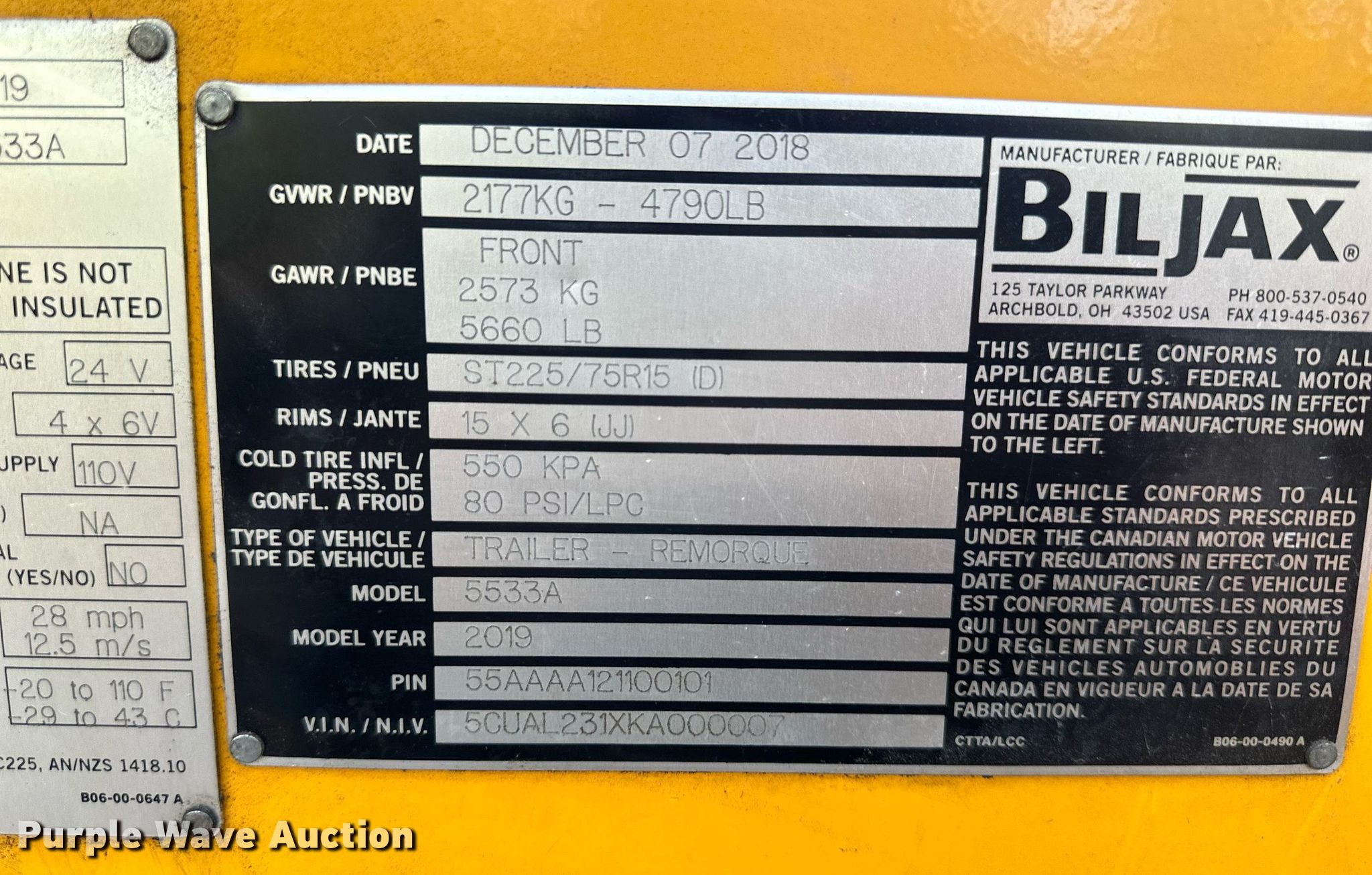 2019 Haulotte 5533A boom lift. VIN: 5CUAL231XKA000007, Serial: 55A19-00007, Unit #: 2. Features Tow behind, Maximum lift capacity: 500 lbs, Maximum reach length: 33' 5", Maximum lift height: 55' 3", Hydraulic outriggers, Platform: 46" L x 26" W, AC power outlet, Air outlet, Controls: Platform, Ground. Tires Tire size: 225/75R15. This is worksite support equipment and will not come with a title. Transfer of ownership documentation will be a bill of sale. Sunflower Rental. 3301 W 6th St. Lawrence, KS 66049