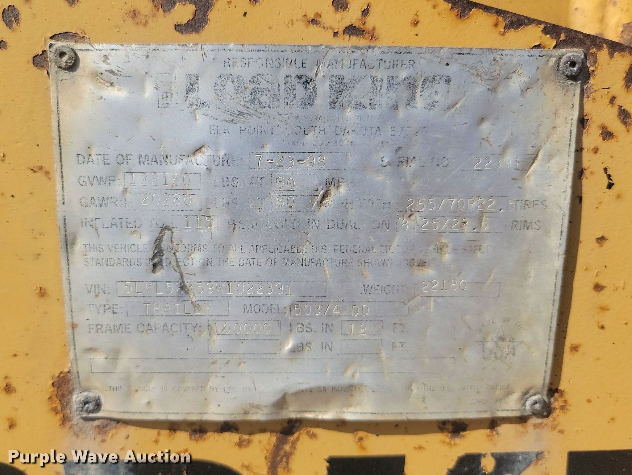 1998 Load King 503/4DD lowboy equipment trailer. VIN: 5LKL52359W1022391. Dimensions Overall: 52' L x 102" W, Deck: 23' 10" L x 102" W, Ramps: Manual Length: 3'. Features Deck type: Wood, Outriggers: Swing-out Board size: 12", Neck type: Detachable, Hydraulic controls: Manual. Chassis Suspension: Air, Brakes: Air, Axles: Triple, GVWR: 122,180 lbs, GAWR: 20,280 lbs. Tires Steel wheels, Size: 255/70R22.5. Iowa title. Knife River Corporation (Corporate Office Location). 2220 Hawkeye Drive. Sioux City, IA 51105