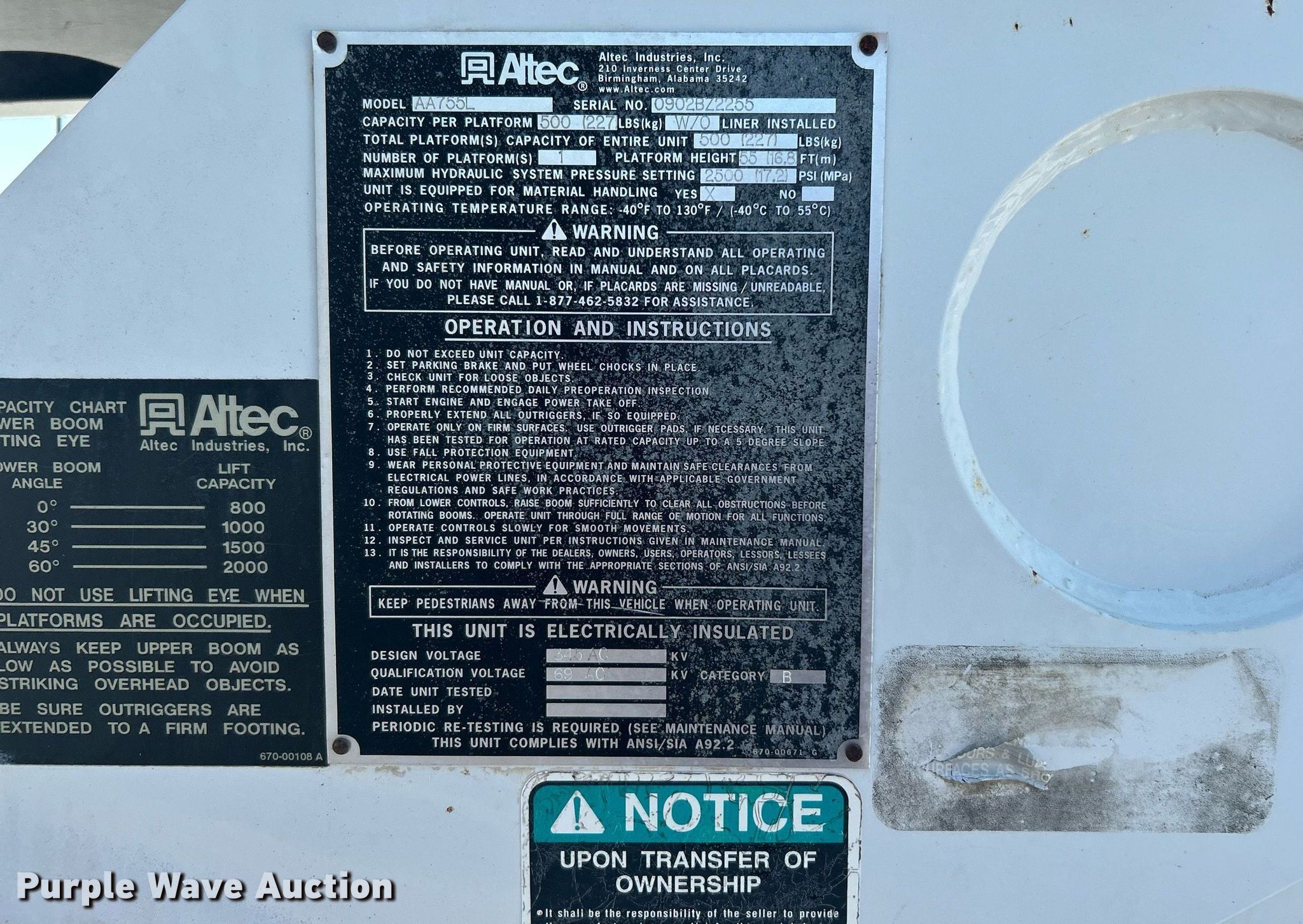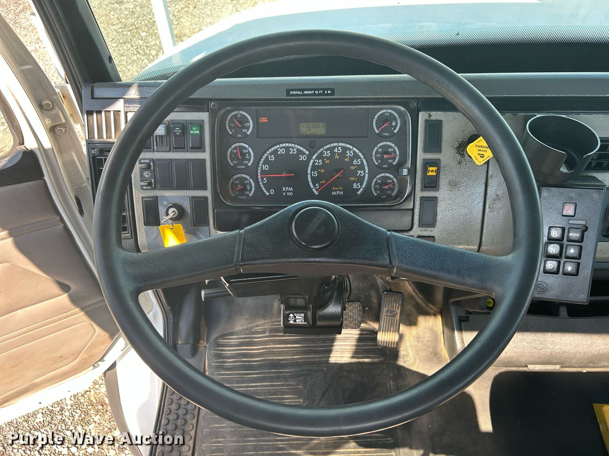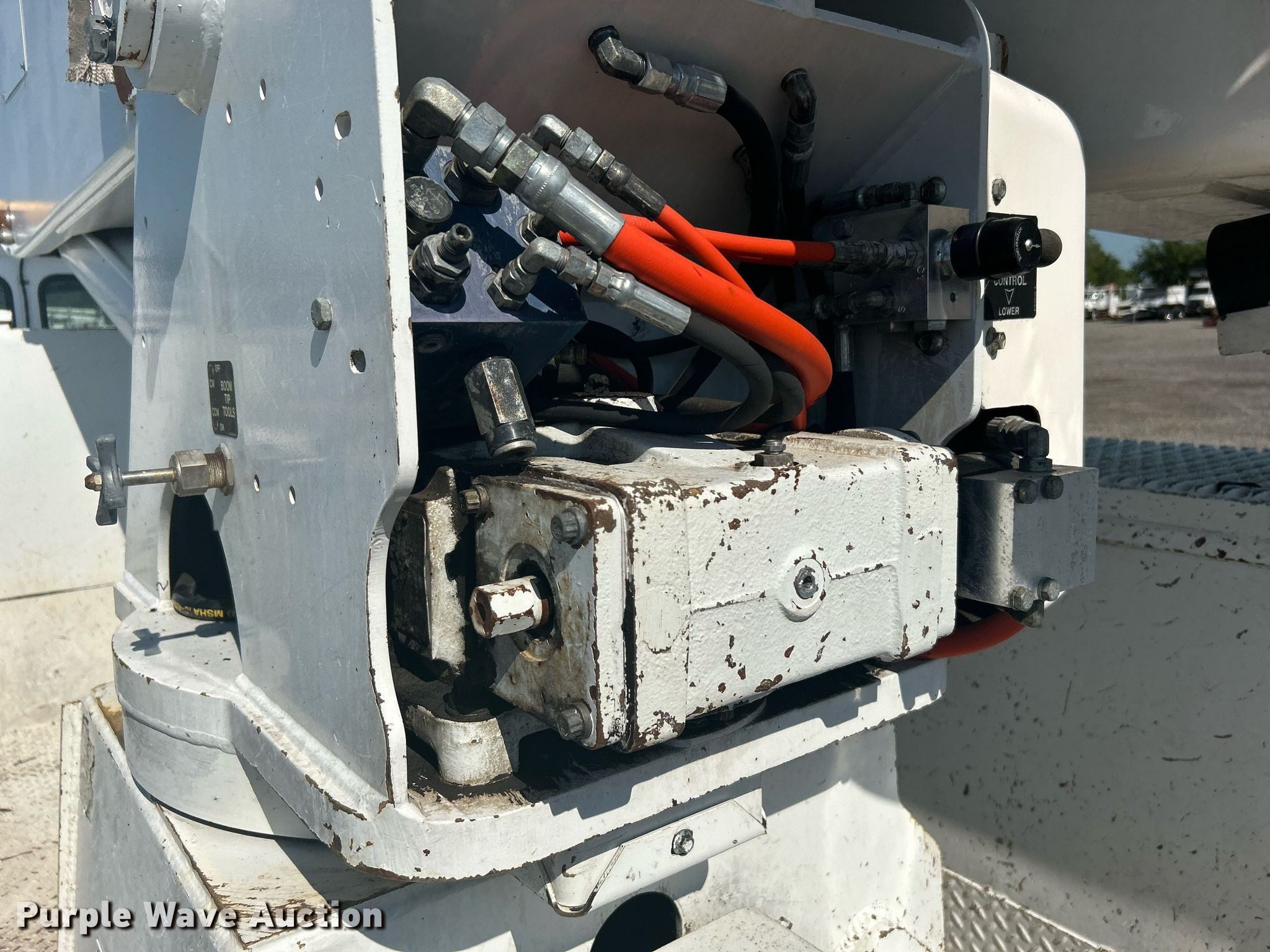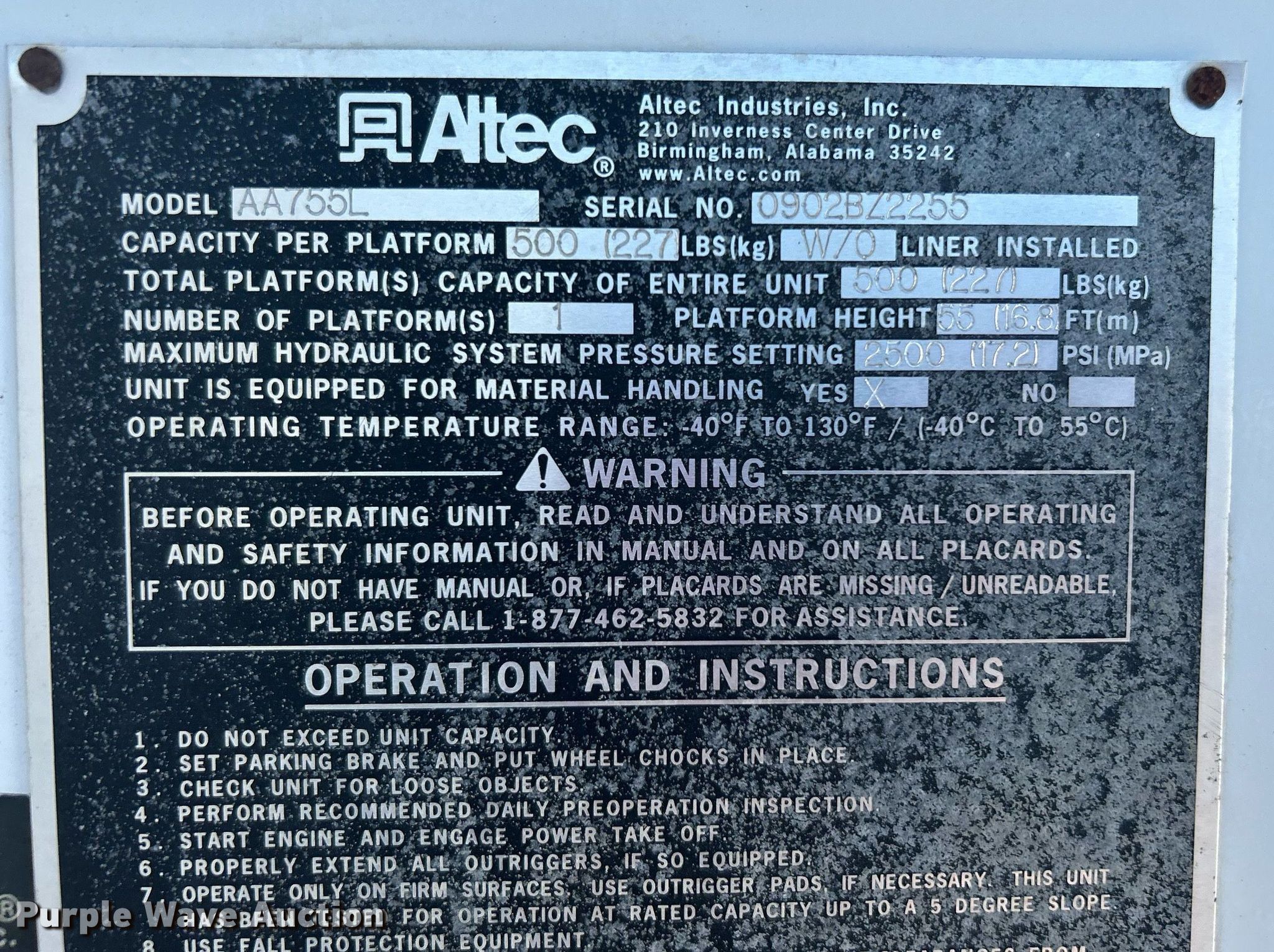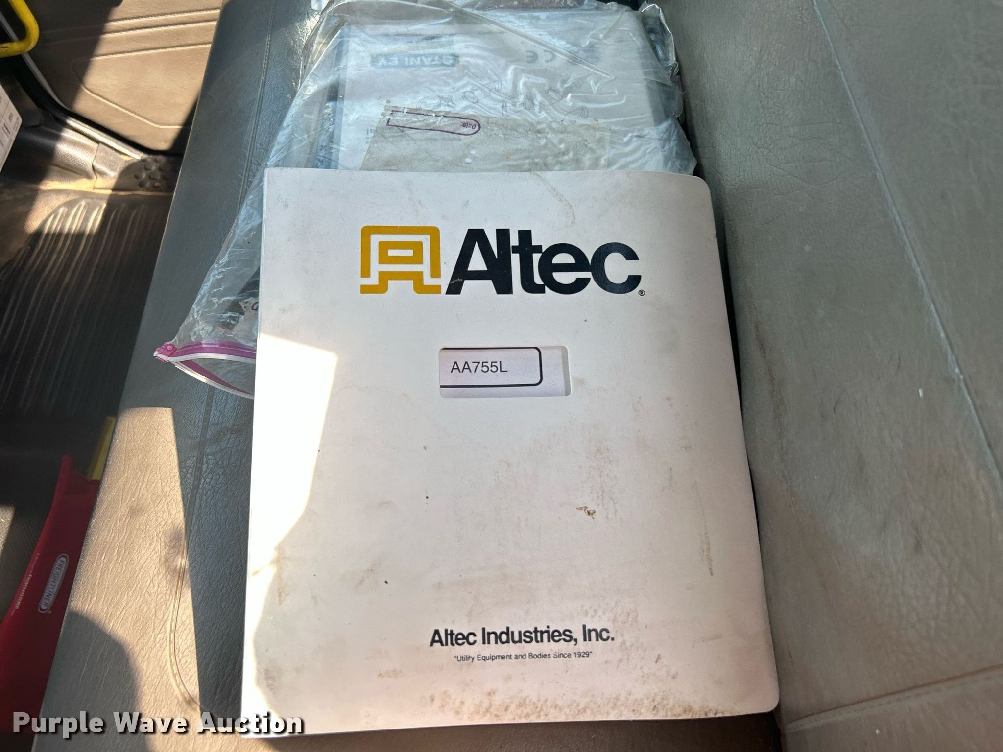2003 Freightliner FL80 bucket truck. Miles: 176,366 on odometer, Hours: 18,625 on meter, VIN: 1FVABXAK83HK86567. Engine Caterpillar 3126, Serial: HEP02873, Displacement: 7.2L, Cylinders: 6, Fuel type: Diesel, HP: 246, kW: 330. Transmission Automatic. Chassis Differential lock, Axles: Single, Suspension: Spring, Brakes: Air, PTO, GVWR: 37000. Interior AC, Heat, Cruise control, Auxiliary controls. Features Bed 13' 6" L x 93" W, Boom Altec AA755L, Serial: 0902BZ2255, Maximum lift capacity: 500 lbs, Maximum lift height: 55', Boom type: Articulating, Insulated, Man basket, Boom controls Platform/ basket, Material handler. Tires Size: 11R22.5. Notes Manuals, Dash warning indicator: Check engine. Oklahoma title. 15107 North 137th East Avenue. Collinsville, OK 74021