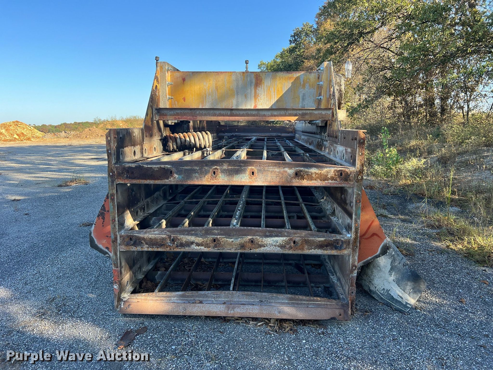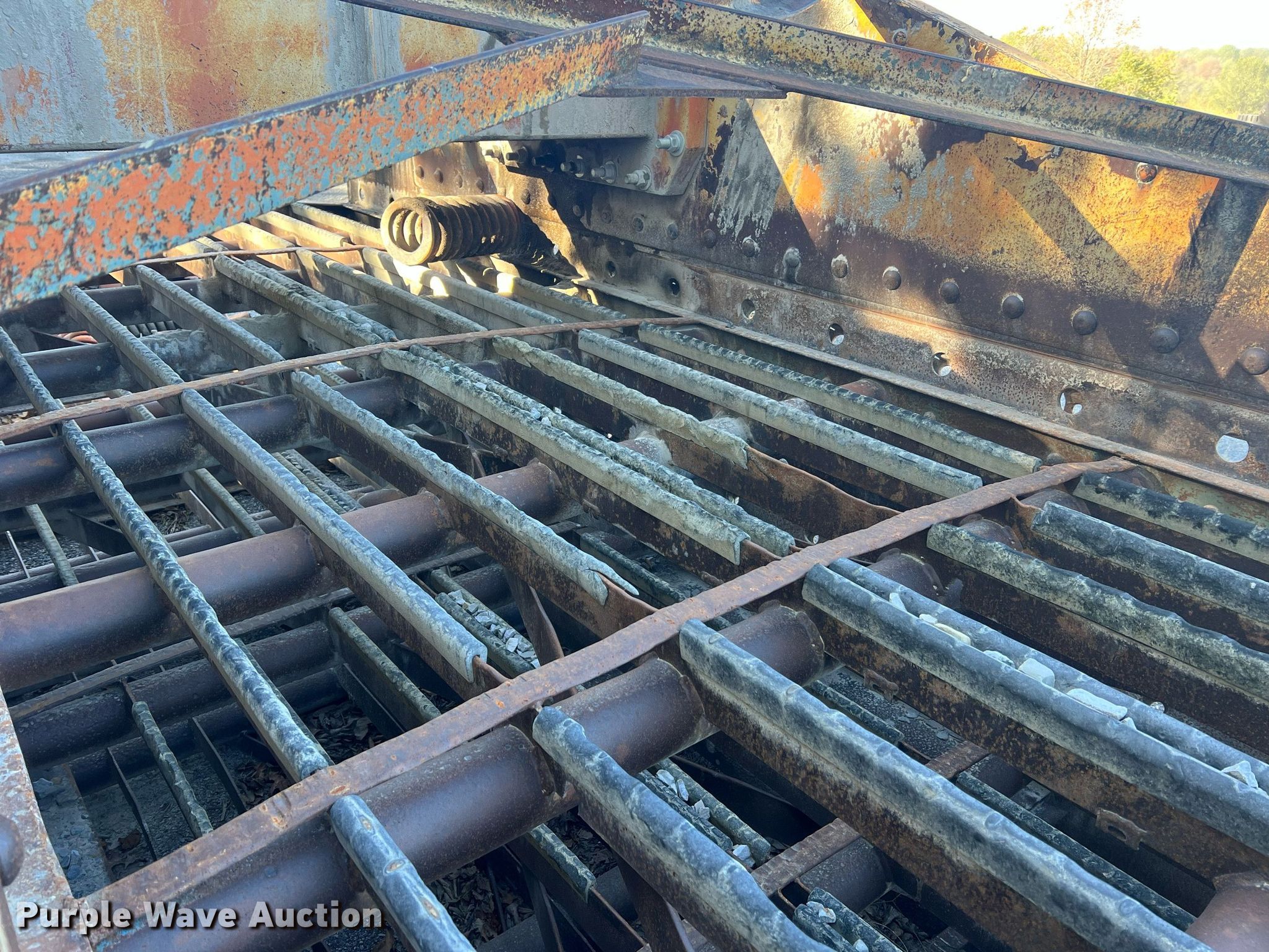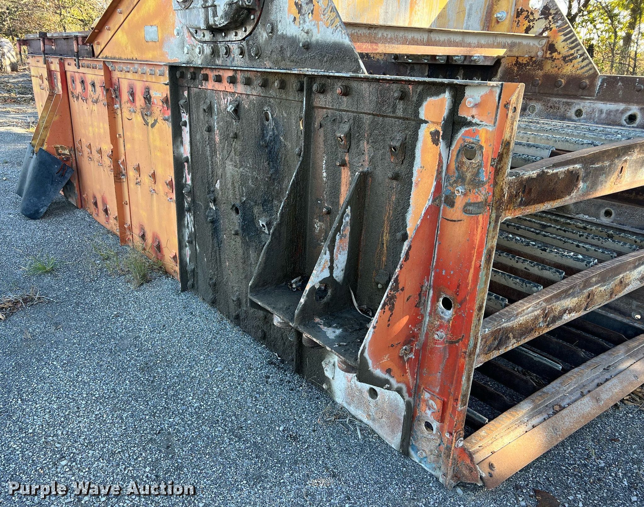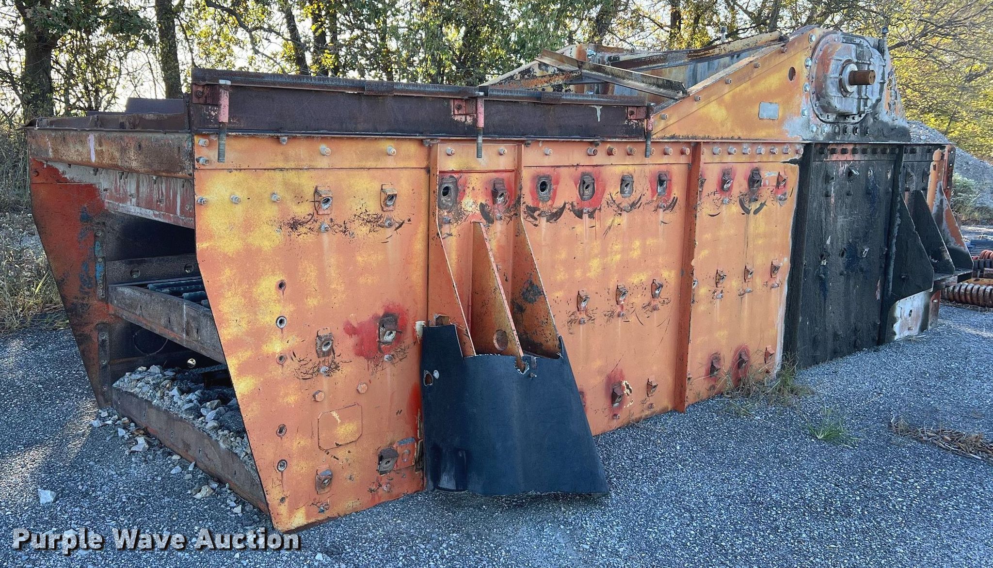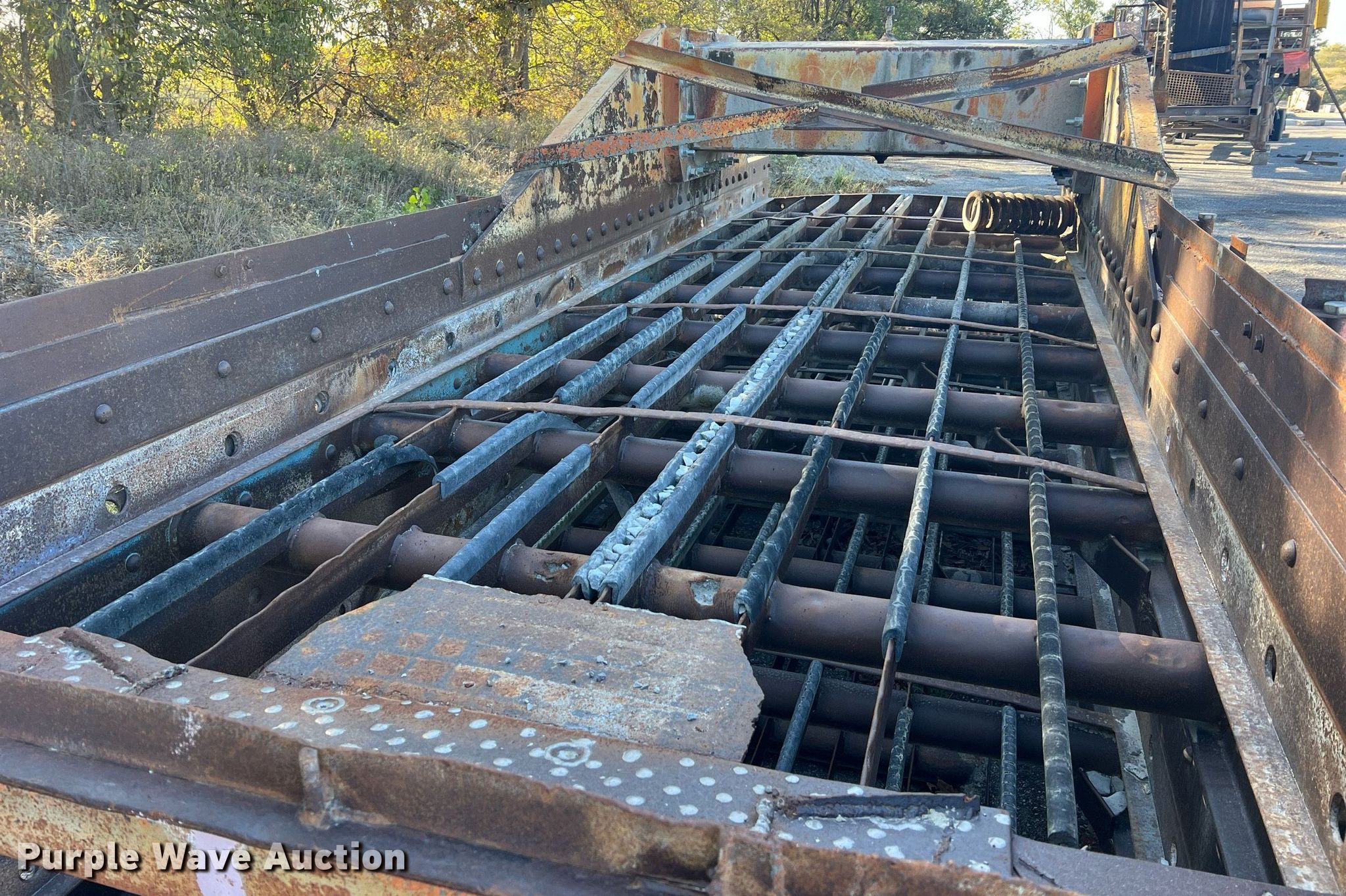 Simplicity screen. Serial: 3620-HS140D-1572. Features Screen deck Length: 20', Width: 6', Decks: Triple, Discharge chute, (10) springs, (2) drive pulleys. Notes Motors missing. Higgins Asphalt Paving Co.. 2347 BB Highway. Otterville, MO 65348