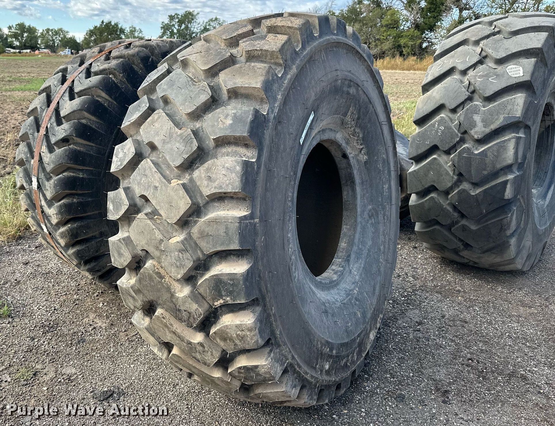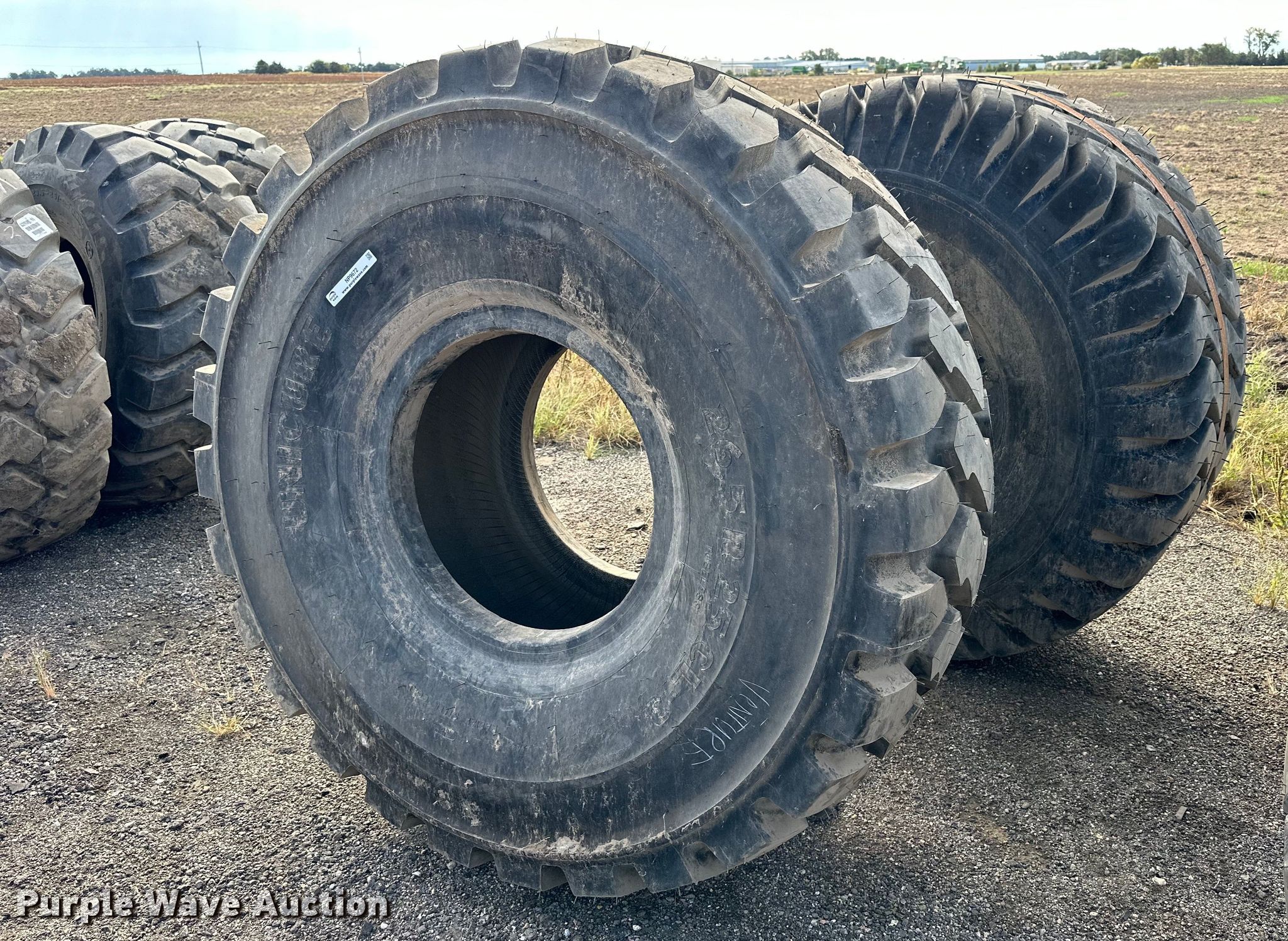Purple Wave is selling a used Industrial Tires or Tracks in Kansas. This item is a (2) tires with the following: Unicure 26.5R25CL-3, Firestone 26.5-25