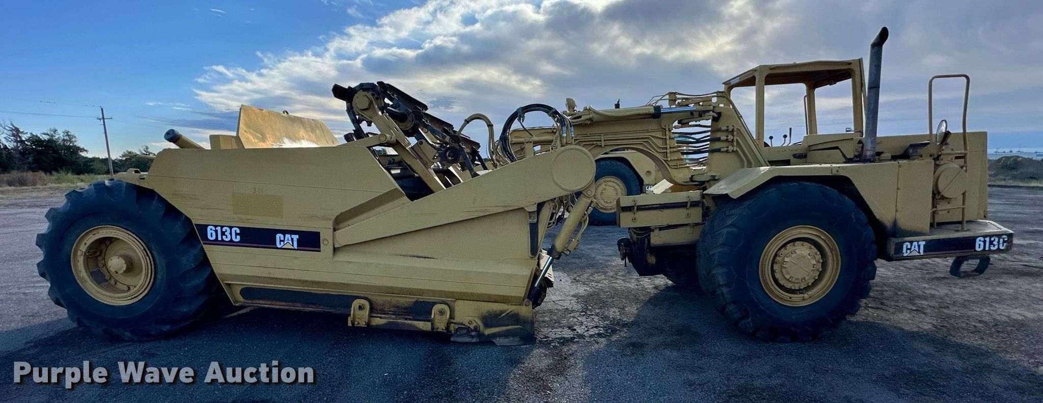Purple Wave is selling a used Elevating Scraper in Kansas. This item is a 1989 Caterpillar 613C elevating scraper with the following: Hours: 9,031 on meter, Serial: 92X01667